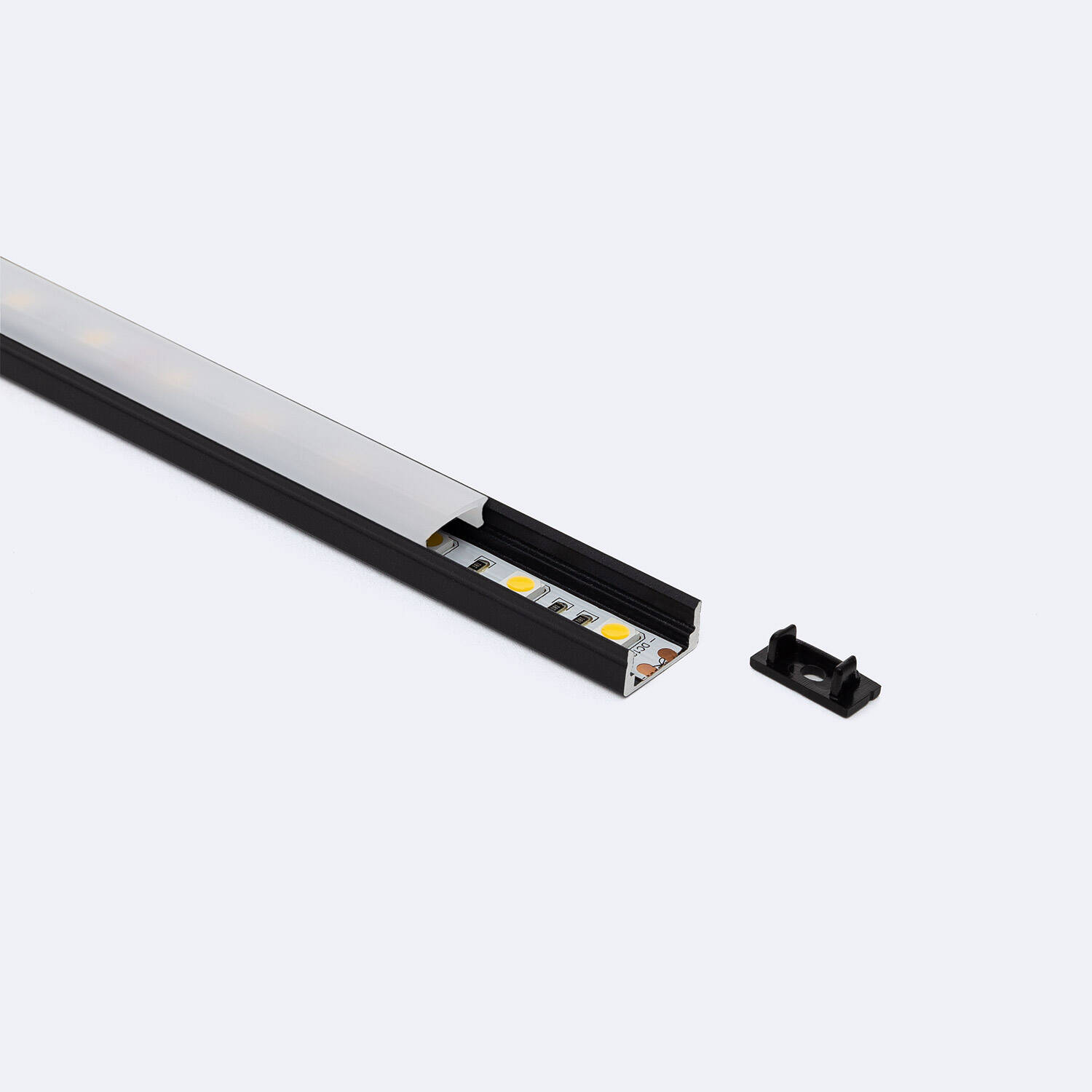El Perfil de Aluminio para Superficie Terra H12 es la solución ideal para instalar tiras LED de hasta 12 mm de ancho, aportando un acabado profesional y elegante. Fabricado en aluminio resistente con tapa continua de policarbonato blanco traslúcido, garantiza una difusión uniforme de la luz, evitando deslumbramientos y mejorando la estética del espacio. Su diseño en color negro combina con cualquier ambiente interior, facilitando la integración en muebles, armarios o estanterías. Además, cuenta con certificación RoHS y una garantía de 3 años, asegurando calidad y durabilidad. Perfecto para proyectos de iluminación decorativa y funcional, este perfil ofrece una instalación sencilla en superficie, realzando la iluminación LED con estilo y protección.