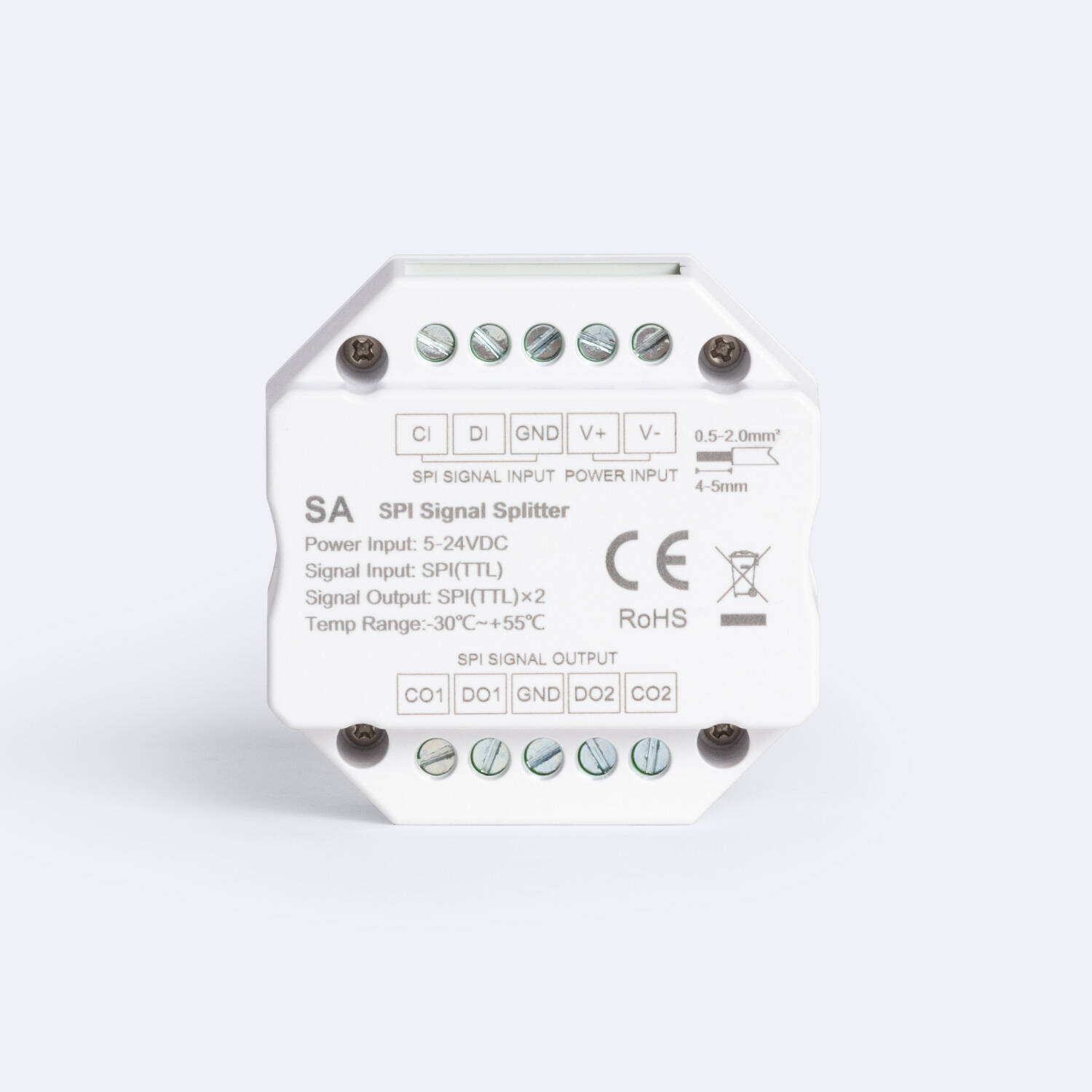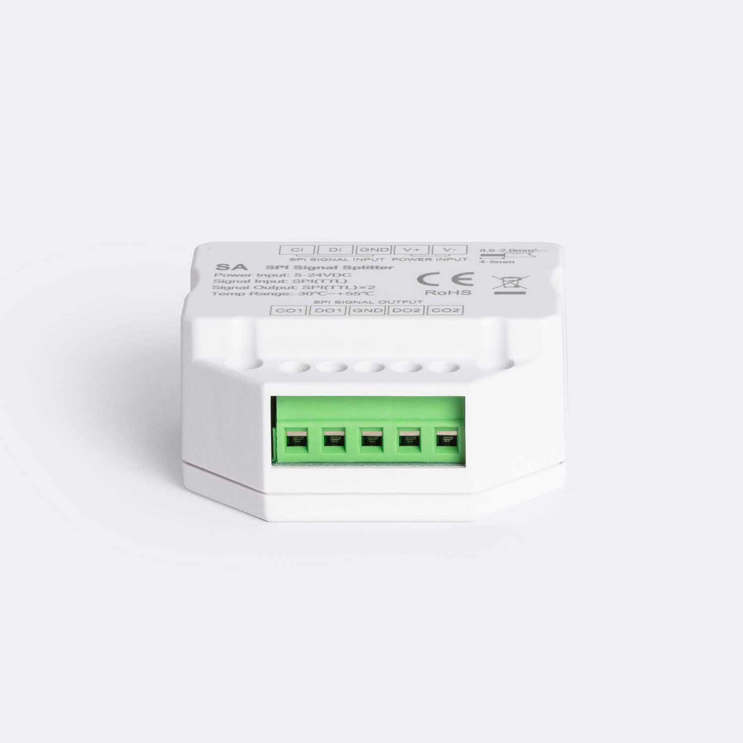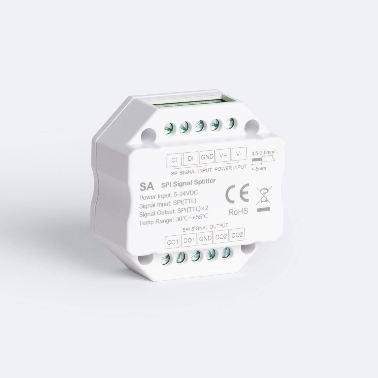 El Splitter Divisor de señal Digital SPI Monocolor / RGB / RGBW es un dispositivo compacto y eficiente diseñado para distribuir señales digitales SPI en sistemas de iluminación LED. Compatible con tensiones de entrada de 5 a 24 VDC, permite dividir la señal SPI (TTL) en dos salidas, facilitando el control simultáneo de múltiples tiras LED monocolor, RGB o RGBW. Su rango de temperatura de trabajo, desde -30 °C hasta +55 °C, garantiza un rendimiento estable en diversas condiciones ambientales. Con protección IP20 y certificaciones CE, EMC, FCC, LVD y RoHS, ofrece calidad y seguridad. Ideal para instalaciones interiores, este divisor asegura una señal precisa y sin interferencias, respaldado por una garantía de 3 años para mayor confianza y durabilidad.