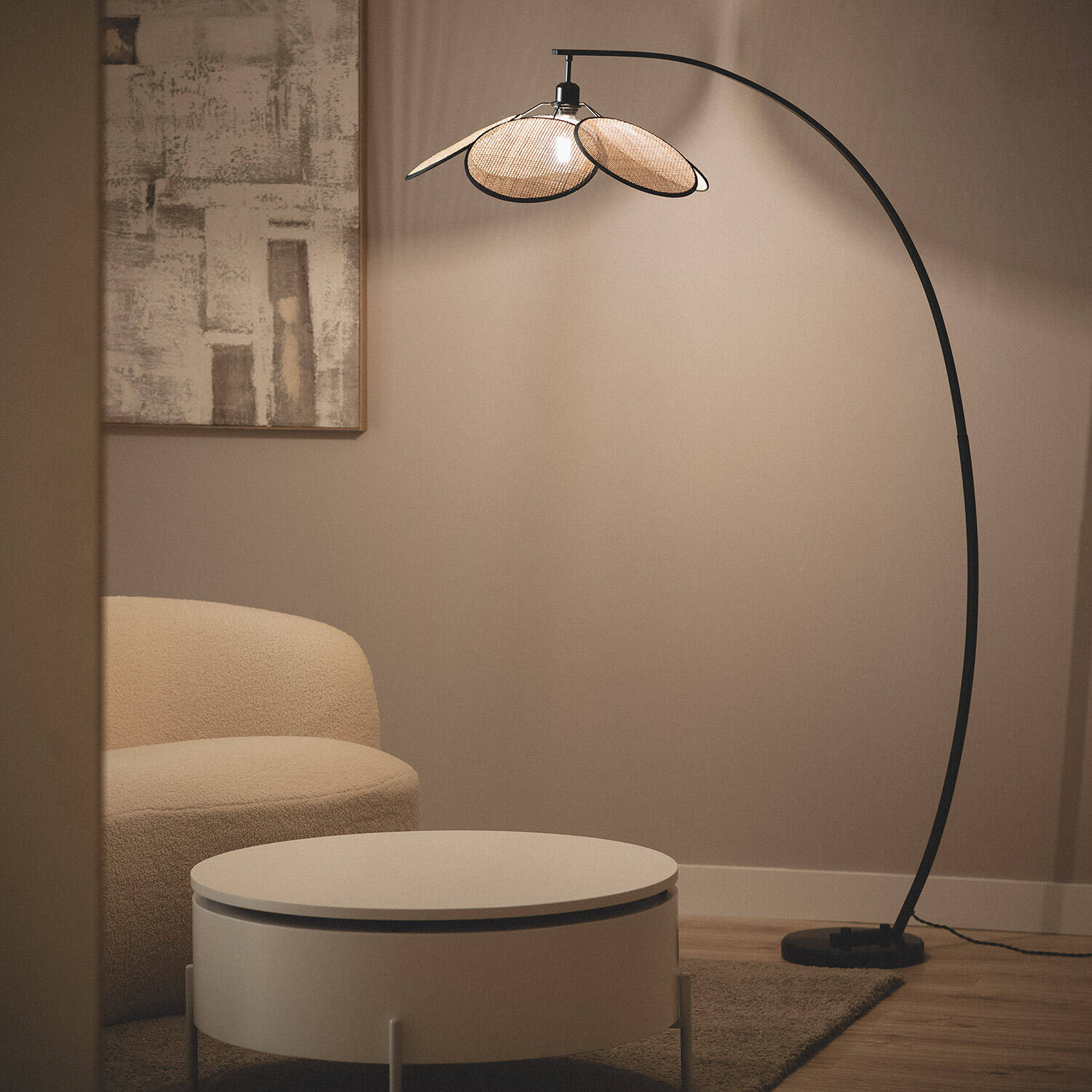 La lámpara de pie Ratán Arco Nirvana combina diseño y funcionalidad con un estilo natural y elegante. Su estructura arqueada en negro contrasta con la pantalla de ratán en forma de pétalos, creando un ambiente cálido y acogedor en cualquier estancia interior. Cuenta con un casquillo E27 para bombillas de hasta 20W, no incluidas, y un práctico interruptor que facilita su uso. Perfecta para salones o rincones de lectura, esta lámpara destaca por su acabado artesanal y su resistencia, con certificaciones CE, RoHS y UKCA. Su protección IP20 y clase de aislamiento II garantizan seguridad y durabilidad, respaldada por una garantía de 3 años. Un toque natural y sofisticado para tu hogar.