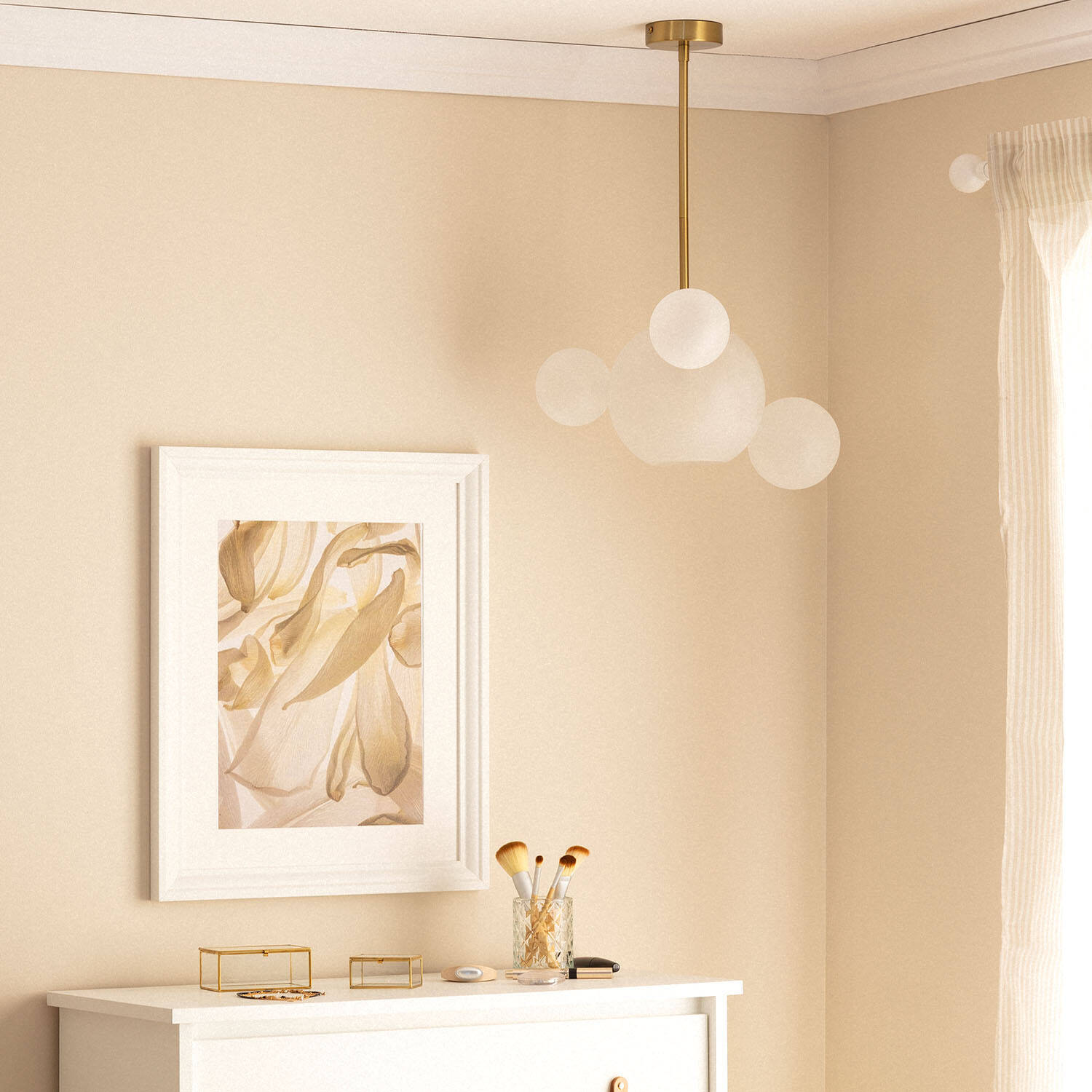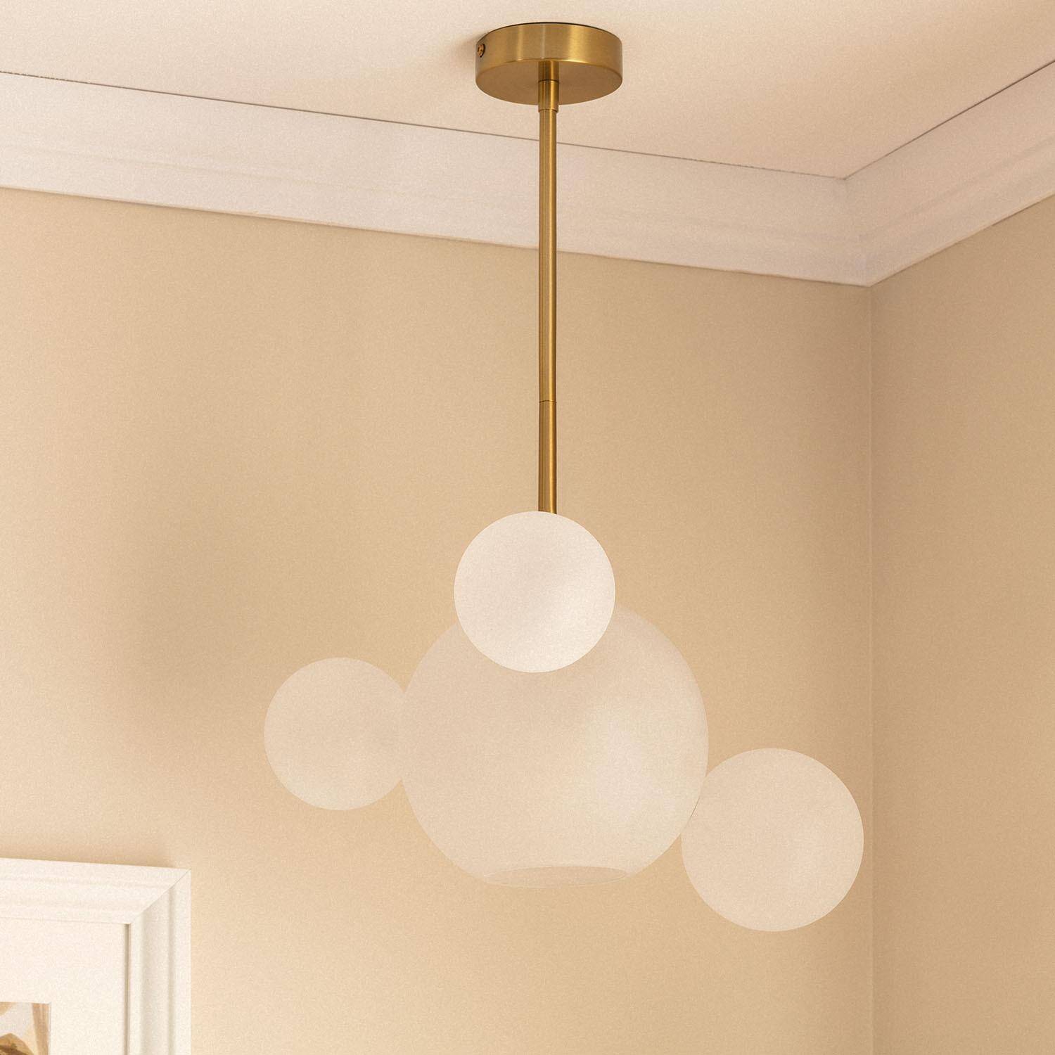 La lámpara de techo Ludmila combina elegancia y modernidad con un diseño único en metal dorado y cristal opal. Su estructura colgante presenta una composición de esferas que aportan un toque artístico y sofisticado a cualquier espacio interior. Compatible con bombillas E27 (no incluidas), permite personalizar la iluminación según el ambiente deseado. Con una potencia máxima de 20 W y certificaciones CE, RoHS y UKCA, garantiza calidad y seguridad. Ideal para salones, comedores o dormitorios, su acabado blanco y dorado se integra perfectamente en decoraciones contemporáneas y clásicas. Además, su protección IP20 y rango de temperatura de trabajo de -20 °C a 50 °C aseguran durabilidad y resistencia. Disfruta de un ambiente cálido y estilizado con Ludmila.