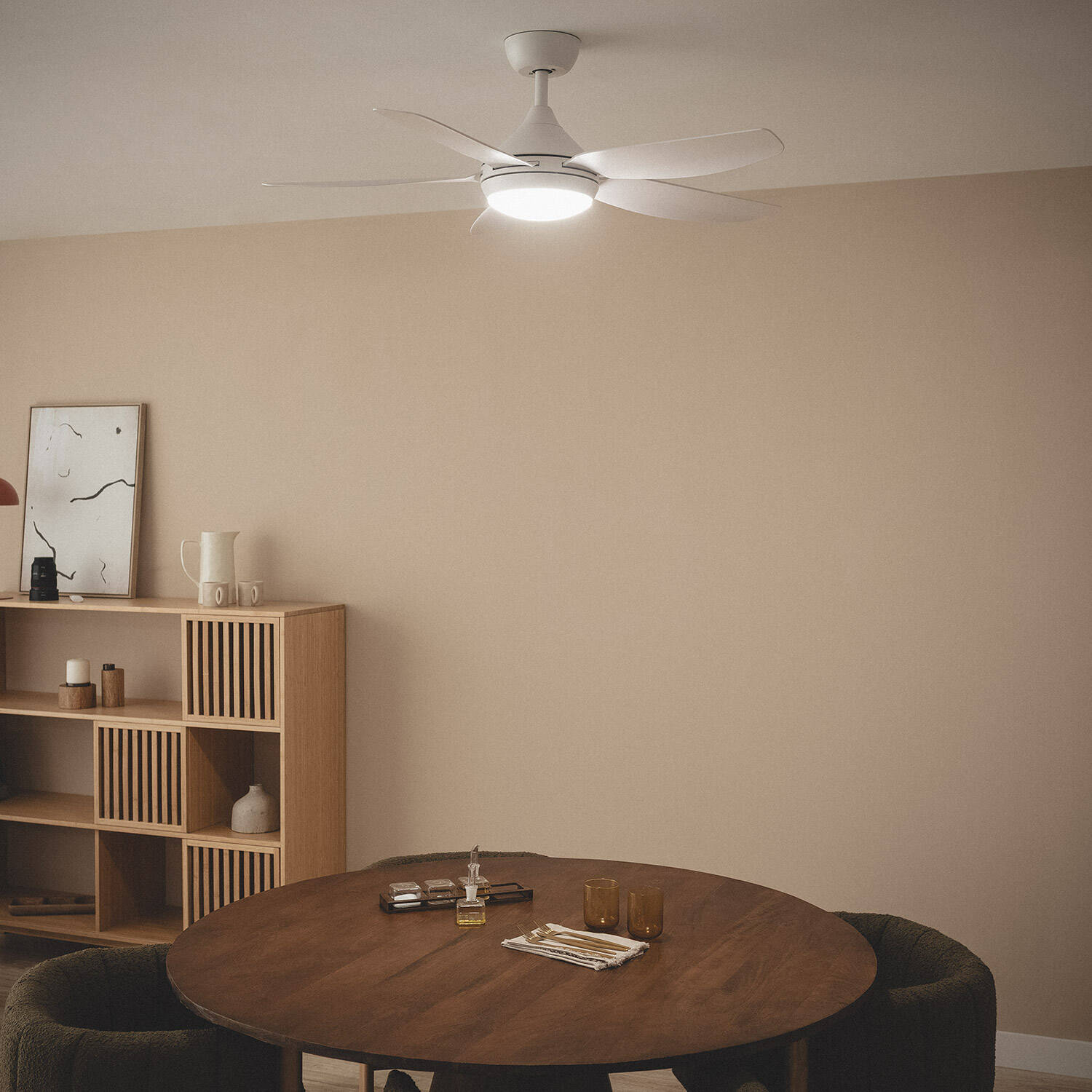 El ventilador de techo silencioso Dokós de TECHBREY es la solución ideal para refrescar grandes estancias de más de 20 m² con total eficiencia y comodidad. Con un diámetro de 122 cm y cinco aspas en color blanco, su motor DC de 38 W ofrece un rango de velocidad ajustable entre 102 y 223 RPM, garantizando un flujo de aire óptimo con un nivel sonoro mínimo de solo 24 dB. Incluye mando a distancia para un control sencillo y cuenta con función verano/invierno para adaptarse a todas las estaciones. Fabricado en ABS y certificado con CE, RoHS y UKCA, este ventilador combina diseño moderno, bajo consumo y una garantía de 3 años, siendo perfecto para interiores con instalación en superficie.