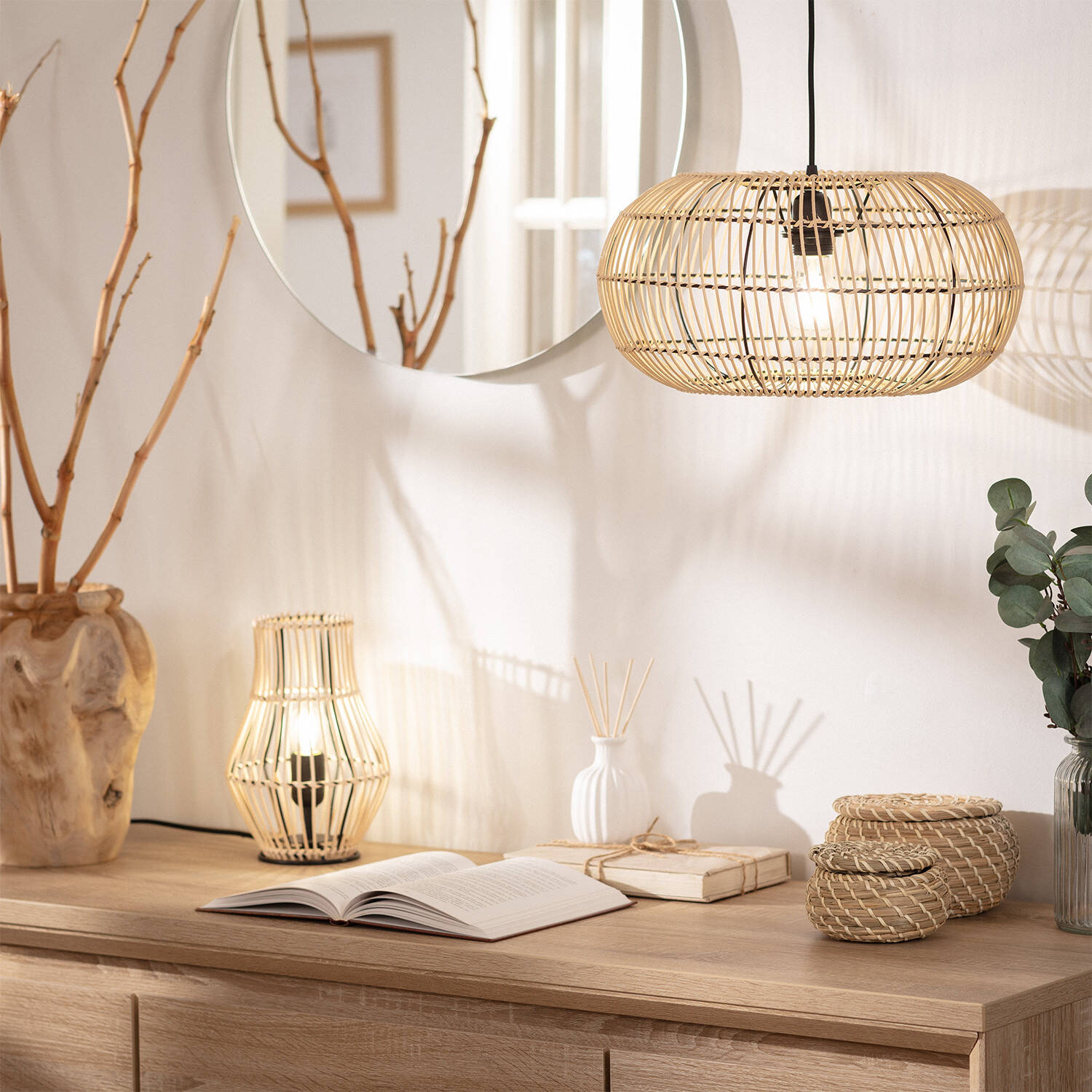 La lámpara de mesa Arawa Sulu destaca por su diseño natural y artesanal, elaborado en ratán que aporta calidez y estilo bohemio a cualquier espacio interior. Su estructura ligera y abierta permite una iluminación ambiental suave y acogedora, ideal para crear ambientes relajados en salones o dormitorios. Compatible con bombillas E27 de hasta 40W, esta lámpara incluye interruptor para un uso práctico y cómodo. Con certificaciones CE, RoHS y UKCA, garantiza seguridad y calidad. Su acabado en color natural y protección IP20 la hacen perfecta para interiores, combinando funcionalidad y estética en un complemento decorativo único y versátil, que aporta un toque de naturaleza y elegancia a tu hogar.