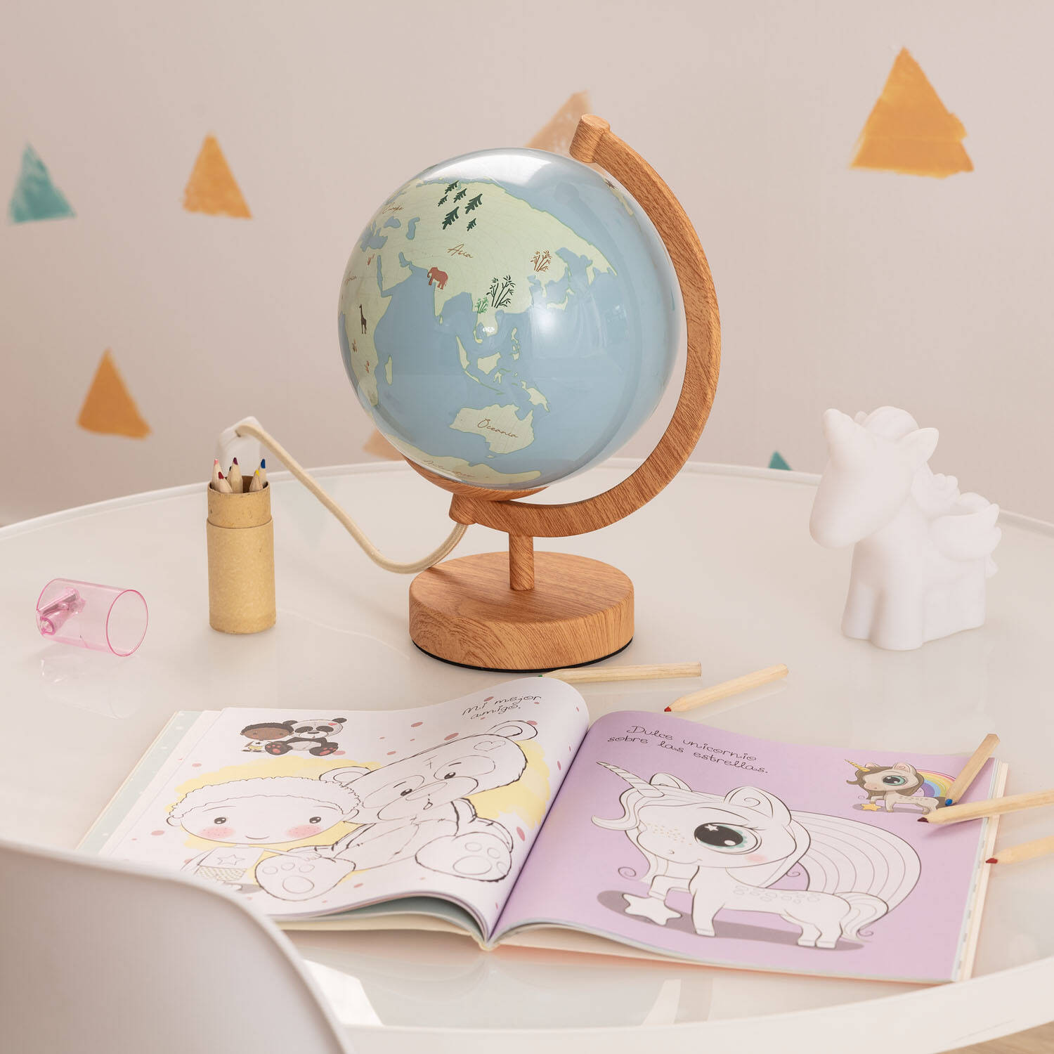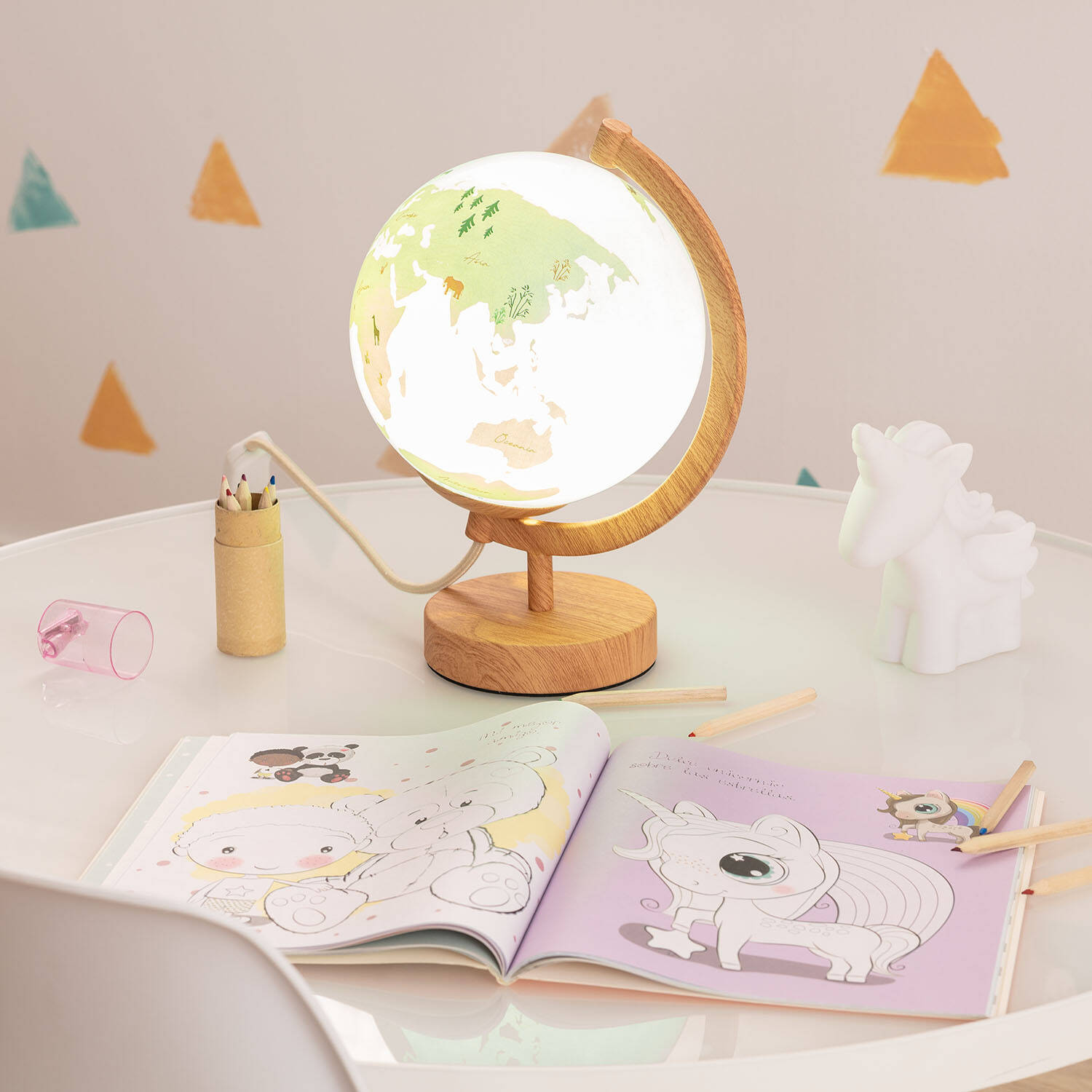 Descubre la Lámpara de Mesa Bola Mundo, una pieza única que combina funcionalidad y diseño decorativo. Fabricada en cristal con soporte y base en madera de tono marrón claro, esta lámpara aporta calidez y elegancia a cualquier espacio interior. Su diseño en forma de globo terráqueo invita a explorar el mundo desde tu escritorio o mesita de noche, ideal para ambientes infantiles o zonas de estudio. Funciona con bombillas E27 (no incluidas) y cuenta con interruptor para un manejo sencillo. Además, cumple con certificaciones CE, RoHS y UKCA, garantizando calidad y seguridad. Perfecta para añadir un toque original y educativo a tu hogar, con una garantía de 3 años para tu tranquilidad.
