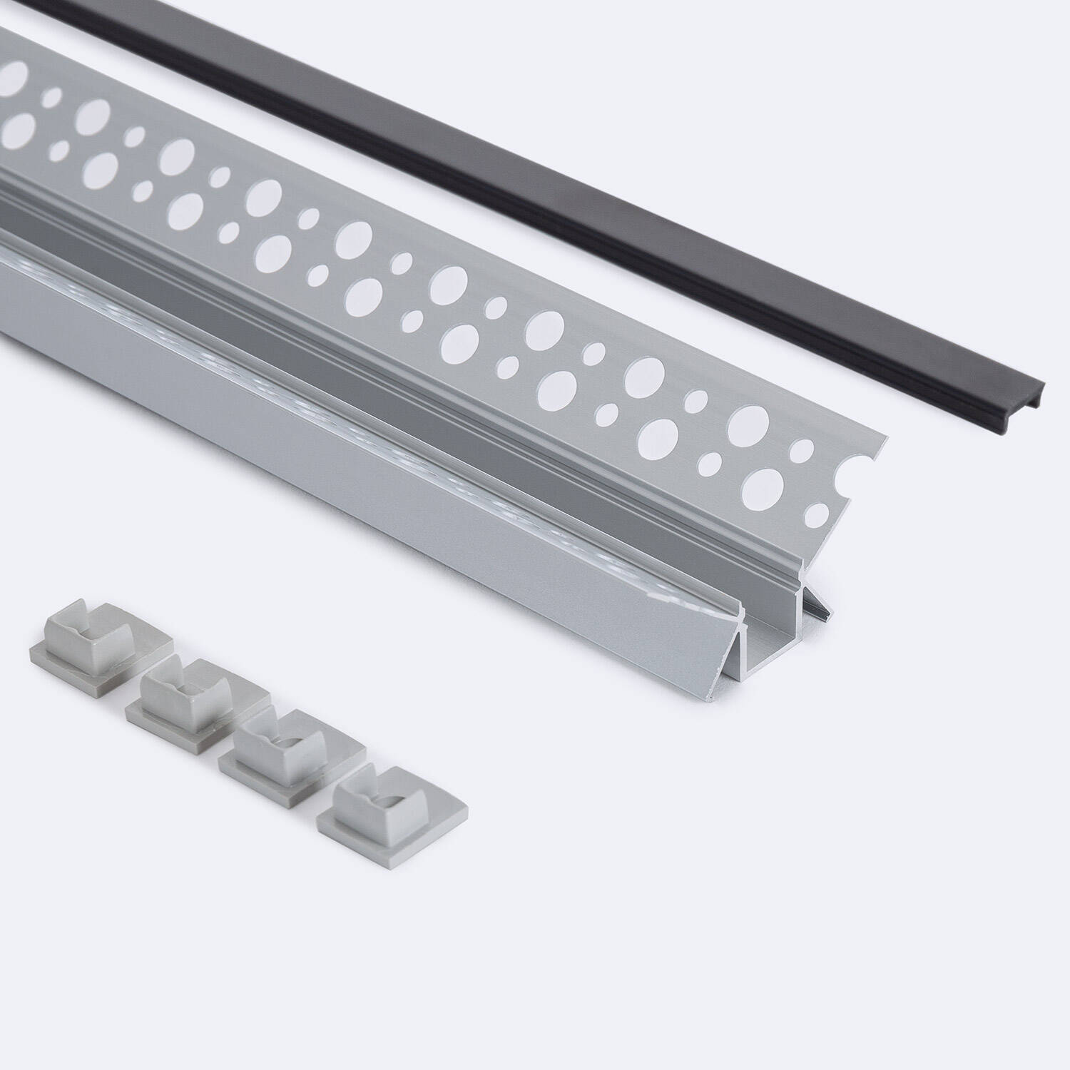 El Perfil de Aluminio Integrado para esquina interior en escayola o pladur es la solución perfecta para instalar tiras LED de hasta 9 mm de ancho con un acabado profesional y discreto. Fabricado en aluminio resistente y ligero, pertenece a la serie Argos H8 y cuenta con tapa continua en color negro traslúcido que difumina la luz suavemente, evitando deslumbramientos. Su diseño permite una integración limpia y elegante en esquinas interiores, ideal para espacios interiores que buscan una iluminación ambiental moderna y funcional. Incluye tapa superior y ofrece una garantía de 3 años, además de cumplir con la certificación RoHS, asegurando calidad y respeto medioambiental. Un accesorio imprescindible para proyectos de iluminación integrados y minimalistas.