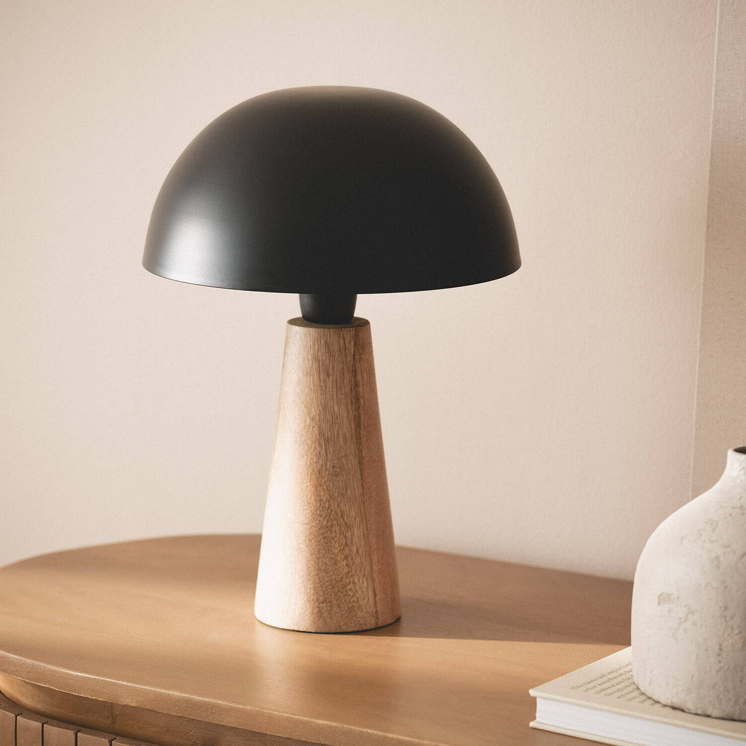 La lámpara de mesa Metal Kuttala combina diseño y funcionalidad con un estilo contemporáneo y elegante. Su base de madera natural en forma cónica aporta calidez y estabilidad, mientras que su pantalla metálica negra en forma de cúpula ofrece una iluminación focalizada y moderna. Compatible con bombillas E27 de hasta 40 W, esta lámpara es ideal para ambientes interiores, aportando un toque sofisticado a cualquier espacio. Cuenta con certificaciones CE, RoHS y UKCA, garantizando calidad y seguridad. Su cable textil negro incluye interruptor para un uso cómodo. Con protección IP20 y una garantía de 3 años, la lámpara Kuttala es una opción duradera y versátil para iluminar y decorar salones, dormitorios o zonas de trabajo.