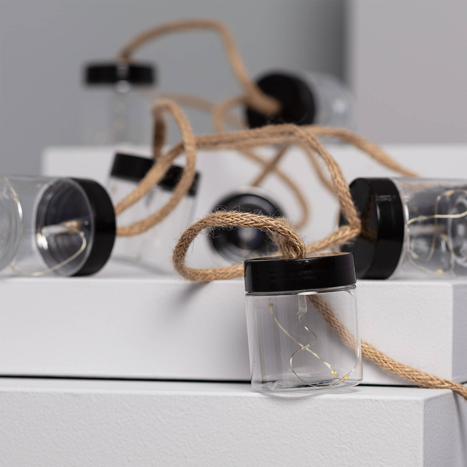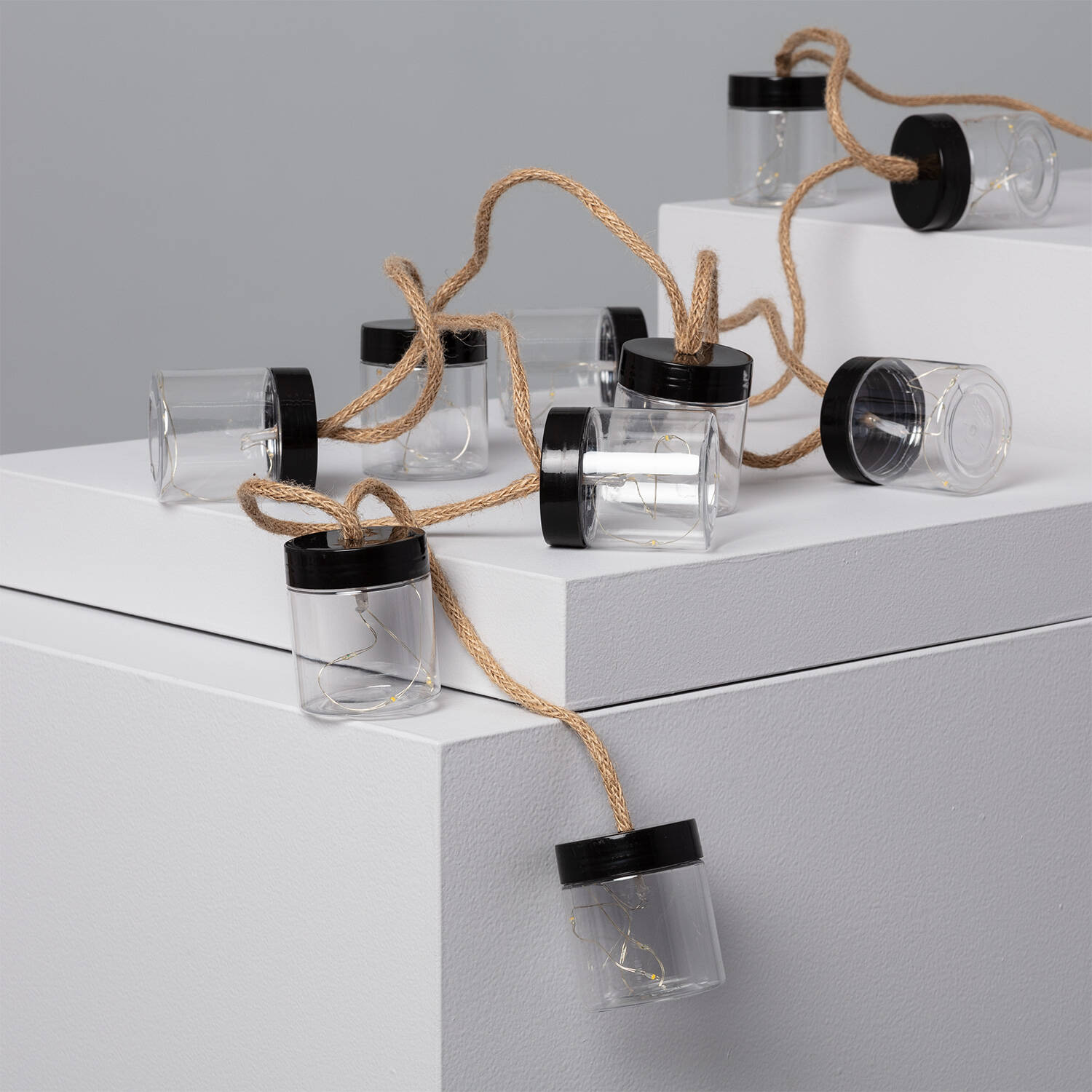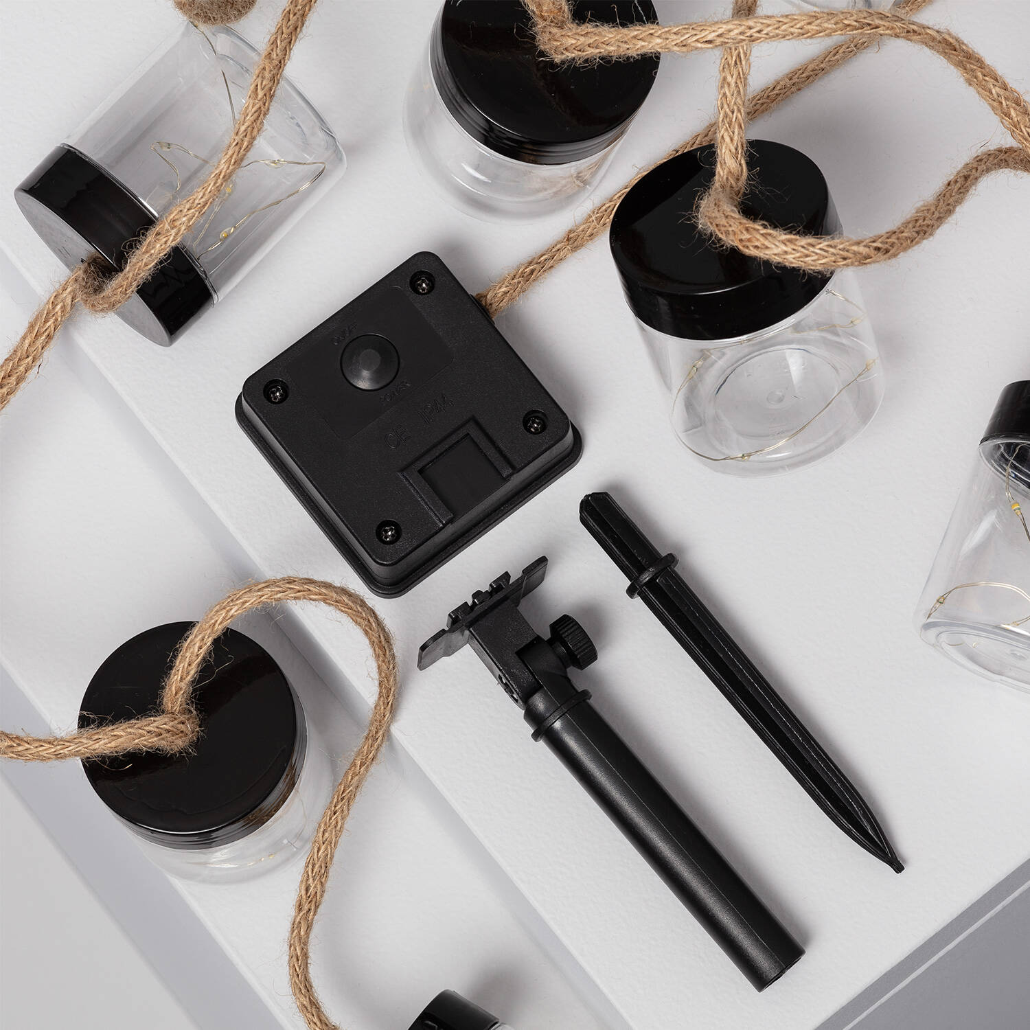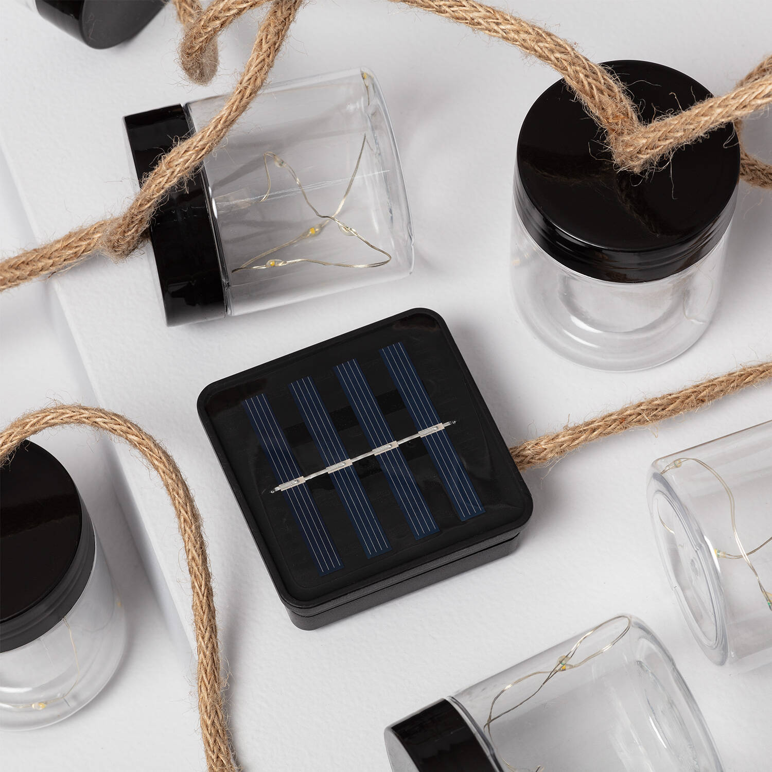 La Guirnalda Exterior LED Solar Tarros de 2 metros es ideal para ambientar espacios al aire libre con un toque cálido y acogedor. Cuenta con 50 LED que emiten una luz blanco cálido, distribuidos en 9 puntos de luz dentro de tarros transparentes con tapa negra, conectados por un cable textil resistente. Su diseño solar permite un uso ecológico y sin cables, mientras que su protección IP44 garantiza resistencia frente a salpicaduras y condiciones climáticas adversas, funcionando en un rango de temperatura de -20 °C a 50 °C. Incluye interruptor para un manejo sencillo y está certificada con CE, RoHS y UKCA. Perfecta para jardines, terrazas y eventos al aire libre, con una garantía de 3 años.