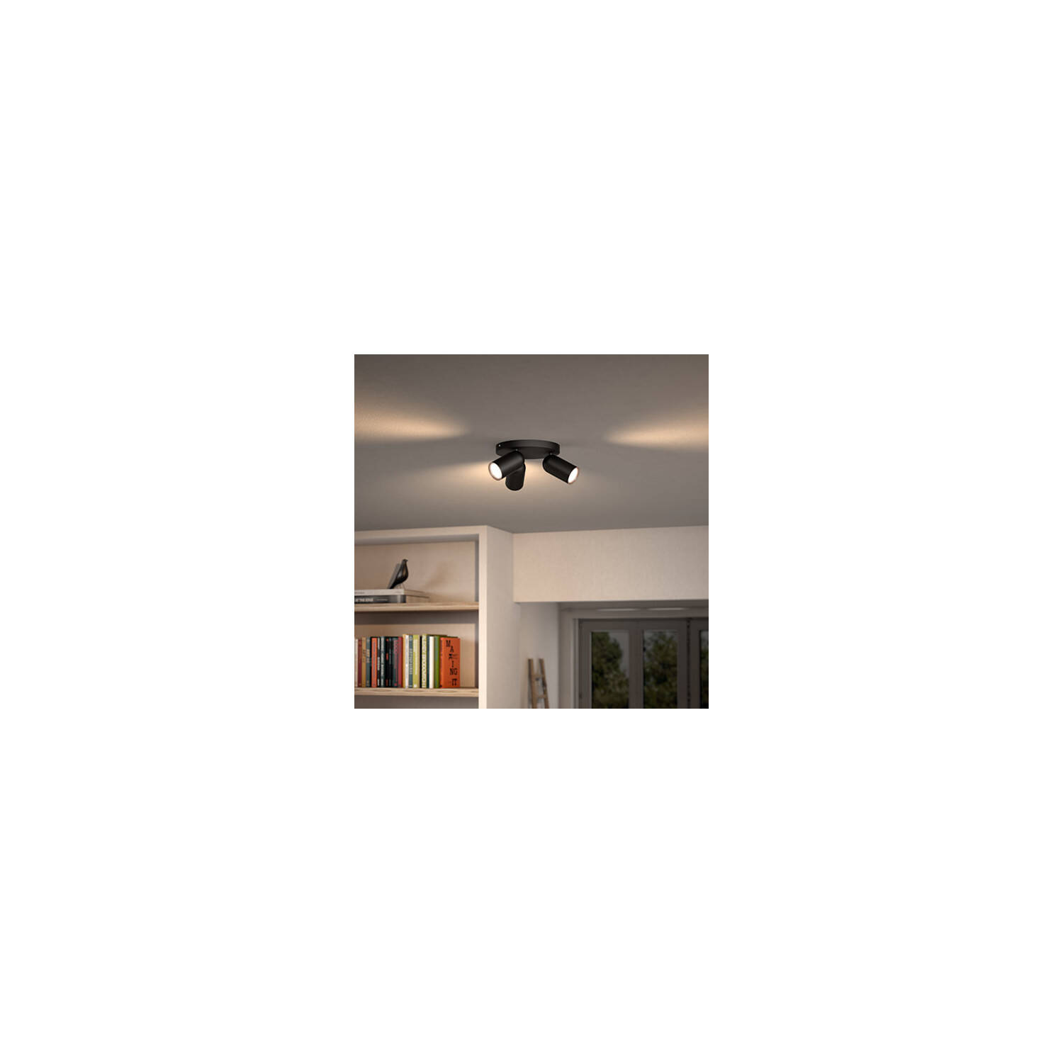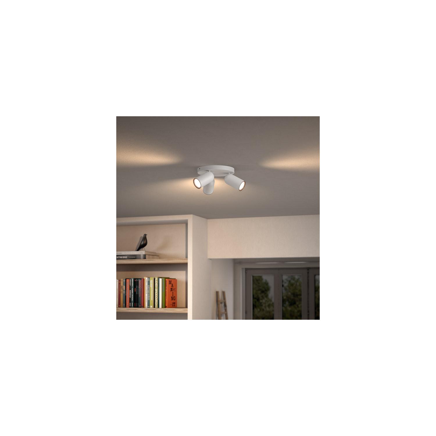 La lámpara de techo PHILIPS Pongee, con tres focos orientables, aporta un toque moderno y funcional a cualquier espacio interior. Fabricada en metal con acabado negro, se integra perfectamente en ambientes contemporáneos. Forma parte de la serie myLiving, que destaca por su diseño elegante y eficiencia energética. Compatible con bombillas GU10 (no incluidas), esta lámpara permite dirigir la luz según tus necesidades, ideal para salones, cocinas o pasillos. Su instalación en superficie y su protección IP20 garantizan durabilidad y seguridad en interiores. Con una potencia máxima de 5,5 W y un rango de temperatura de trabajo entre -20 °C y 50 °C, ofrece versatilidad y confort visual. Además, cuenta con certificaciones CE, RoHS y UKCA y una garantía de 3 años.