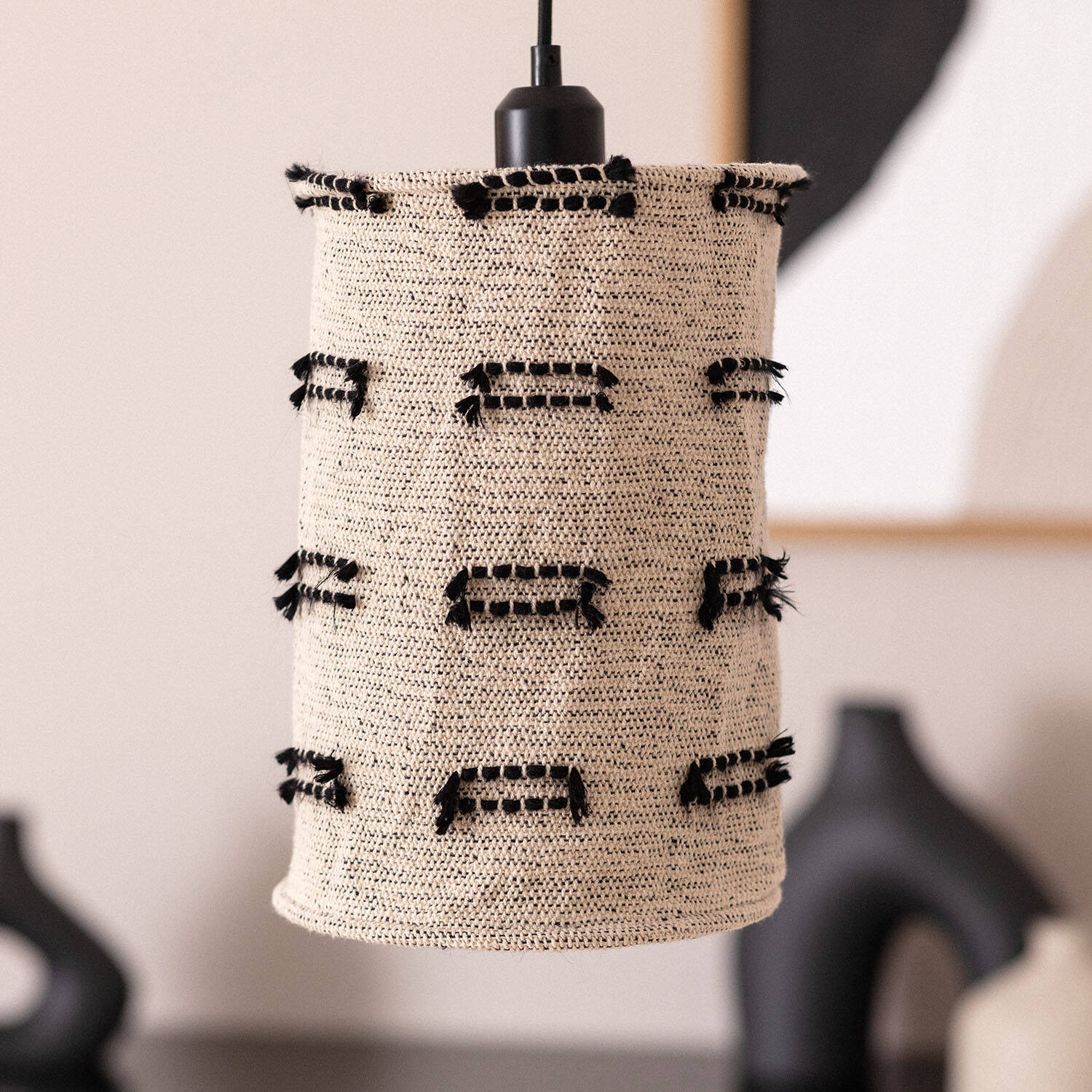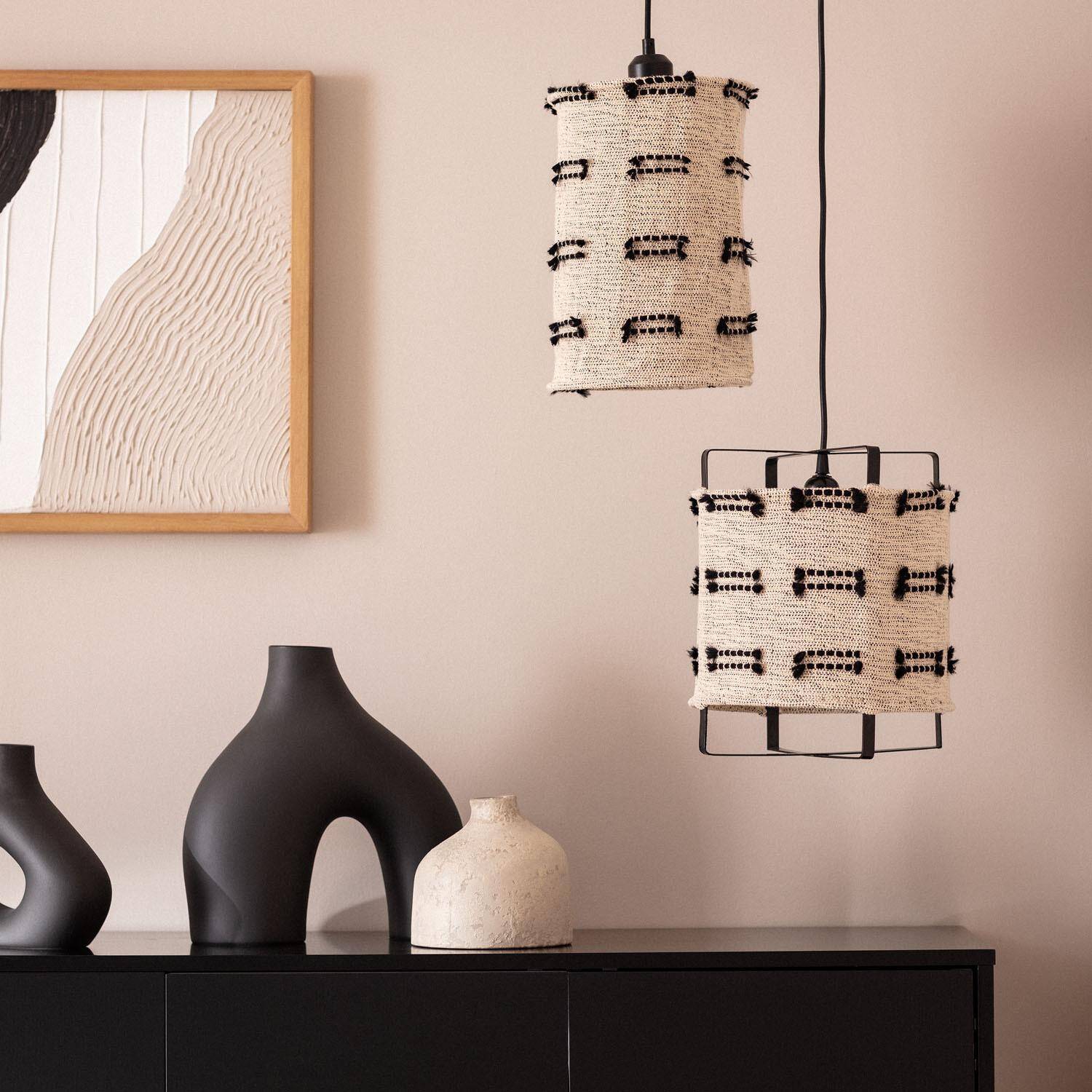 La lámpara colgante Algodón Sioux Large destaca por su diseño artesanal y elegante, elaborado en algodón blanco con detalles en negro que aportan un toque étnico y moderno a cualquier espacio interior. Su estructura cilíndrica y textura tejida ofrecen una iluminación cálida y acogedora, ideal para ambientes íntimos y decorativos. Compatible con bombillas E27 de hasta 40W (no incluidas), esta lámpara se adapta fácilmente a diferentes estilos gracias a su combinación de colores neutros y materiales naturales. Certificada con CE, RoHS y UKCA, es una opción segura y duradera, con una garantía de 3 años. Perfecta para salones, comedores o rincones especiales que buscan un toque de sofisticación artesanal.