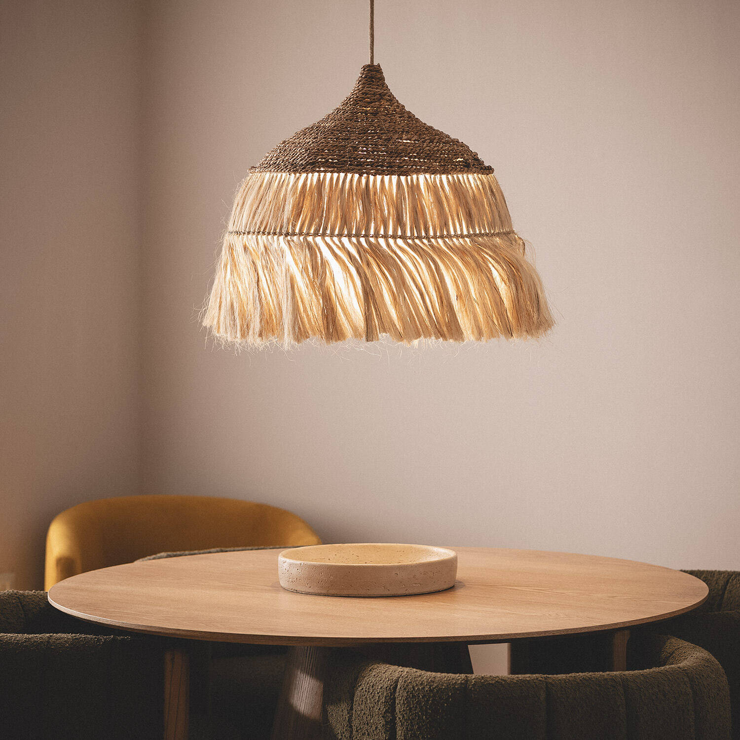La lámpara colgante Kempo Wari de ILUZZIA combina la elegancia natural del ratán con la textura única del ramio, creando un diseño artesanal que aporta calidez y estilo bohemio a cualquier espacio interior. Su acabado en tonos naturales y su forma envolvente con flecos aportan un toque acogedor y original. Compatible con bombillas E27 (no incluidas), esta lámpara de hasta 20W se adapta perfectamente a ambientes que buscan una iluminación suave y decorativa. Además, cuenta con certificaciones CE, RoHS y UKCA, garantizando calidad y seguridad. Ideal para salones, comedores o rincones especiales, es una pieza versátil que realza la decoración con su encanto rústico y contemporáneo.