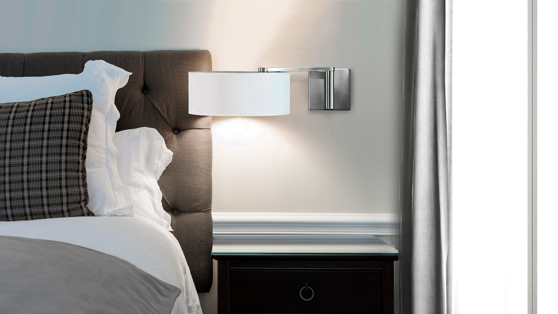 El aplique Matrix con su brazo articulado que se extiende formando un ángulo recto perfecto se adapta muy bien a dormitorios tanto de uso contract como particular.