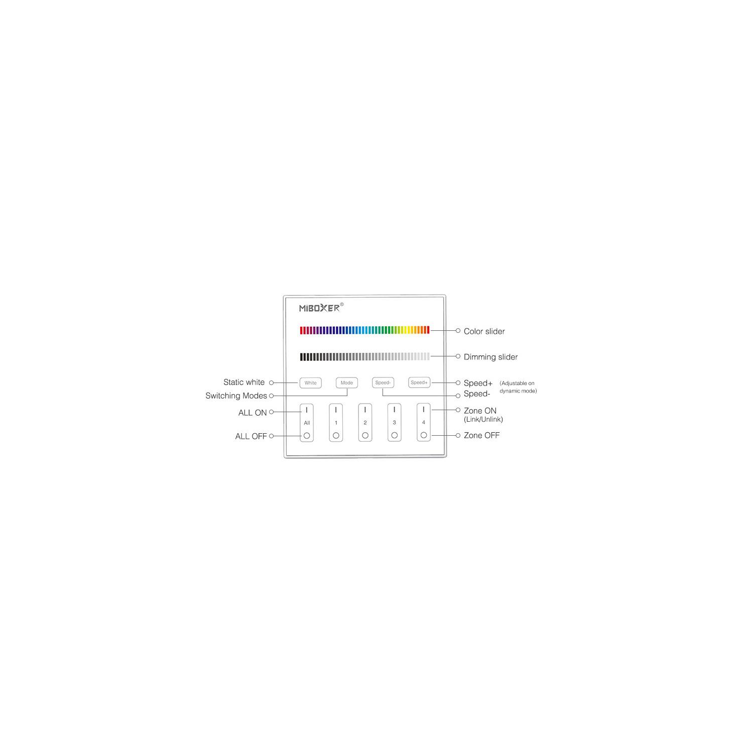 El mando RF de pared MiBoxer T3 es un controlador avanzado diseñado para regular tiras LED RGBW en cuatro zonas independientes mediante tecnología de radiofrecuencia (RF). Su elegante diseño en cristal y PC blanco se integra perfectamente en cualquier espacio interior, ofreciendo una instalación empotrable sencilla. Con certificaciones CE, RoHS y UKCA, garantiza calidad y seguridad. Permite ajustar el color, la intensidad y la velocidad de los efectos lumínicos con precisión, facilitando ambientes personalizados y dinámicos. Su frecuencia de funcionamiento es de 50-60 Hz y cuenta con protección IP20 para uso en interiores. Además, incluye funciones para encender y apagar todas las zonas o cada una por separado, con una garantía de 3 años que asegura durabilidad y fiabilidad.