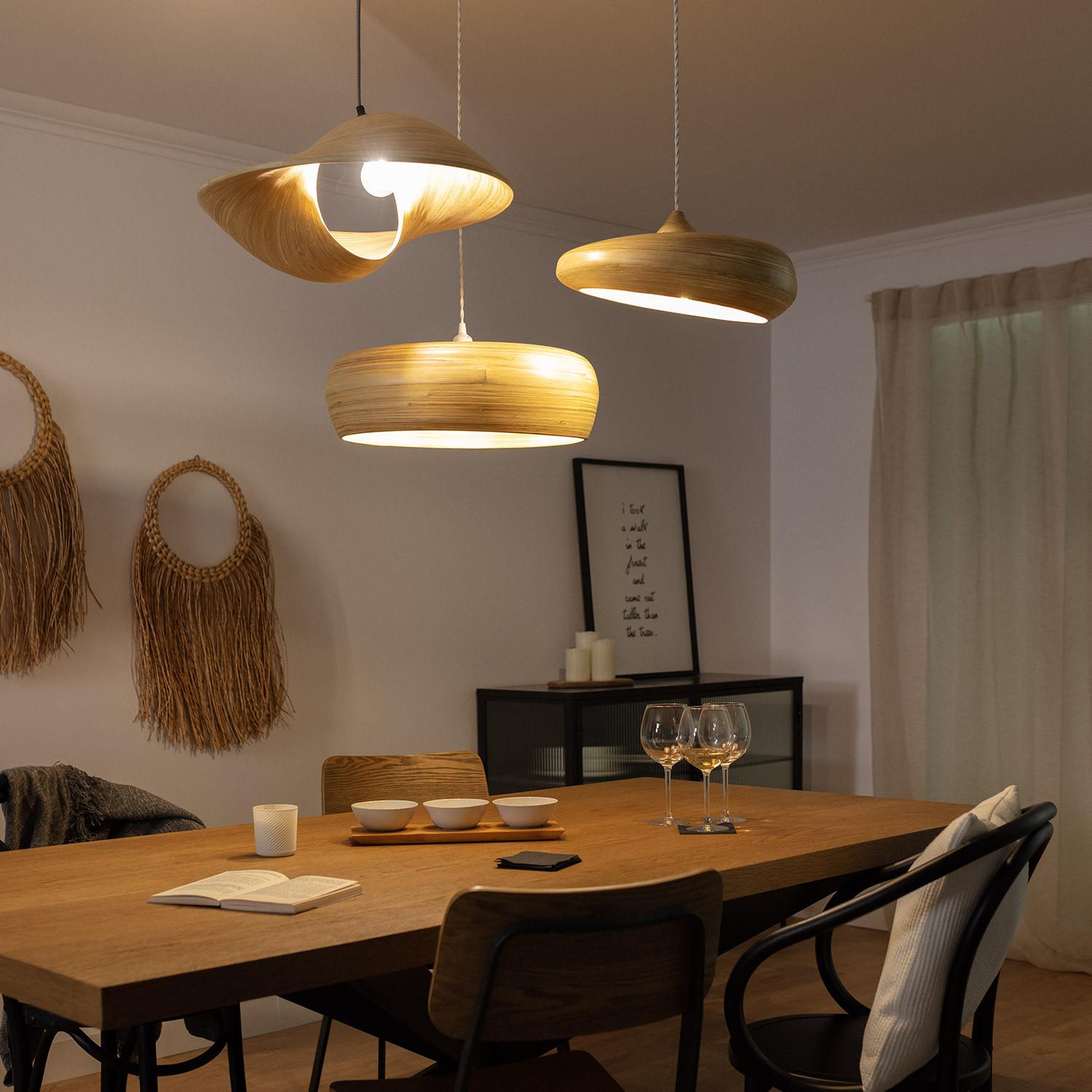 La pantalla lámpara colgante Bambú Shuka Sari Big Ø500 mm de ILUZZIA aporta un toque natural y elegante a cualquier espacio interior. Fabricada en bambú de color natural, destaca por su diseño orgánico y contemporáneo que combina funcionalidad y estilo. Su diámetro de 50 cm la convierte en una pieza protagonista ideal para salones o comedores, creando una iluminación cálida y acogedora. Con certificaciones CE, RoHS y UKCA, garantiza calidad y seguridad. Su instalación colgante facilita su integración en diferentes ambientes. No incluye bombillas ni portalámparas. Además, cuenta con protección IP20 y una garantía de 3 años, asegurando durabilidad y resistencia en el tiempo. Perfecta para quienes buscan un estilo sostenible y moderno.