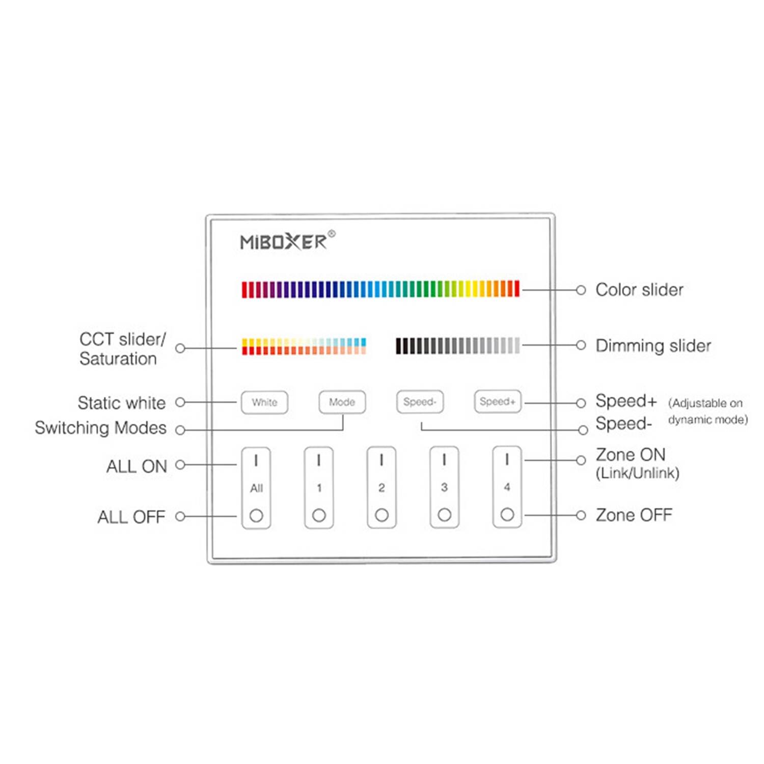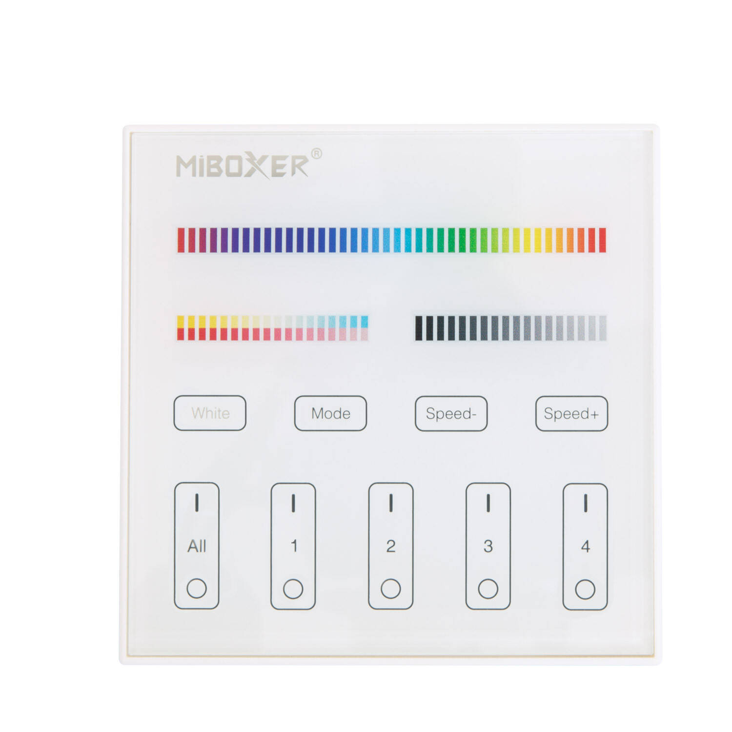 El mando RF de pared MiBoxer T4 es un controlador avanzado para reguladores LED RGBWW, diseñado para gestionar hasta 4 zonas de iluminación de forma independiente. Con una elegante superficie de cristal y PC, ofrece un manejo táctil intuitivo para ajustar colores RGBW+CCT, modos de luz y velocidad de efectos dinámicos. Compatible con una tensión de entrada de 220-240V AC y frecuencia de 50-60 Hz, es ideal para instalaciones empotrables en interiores. Su diseño moderno incorpora certificaciones CE, RoHS y UKCA, garantizando calidad y seguridad. Además, cuenta con protección IP20 y una garantía de 3 años, asegurando durabilidad y rendimiento óptimo en el control de ambientes luminosos personalizados.