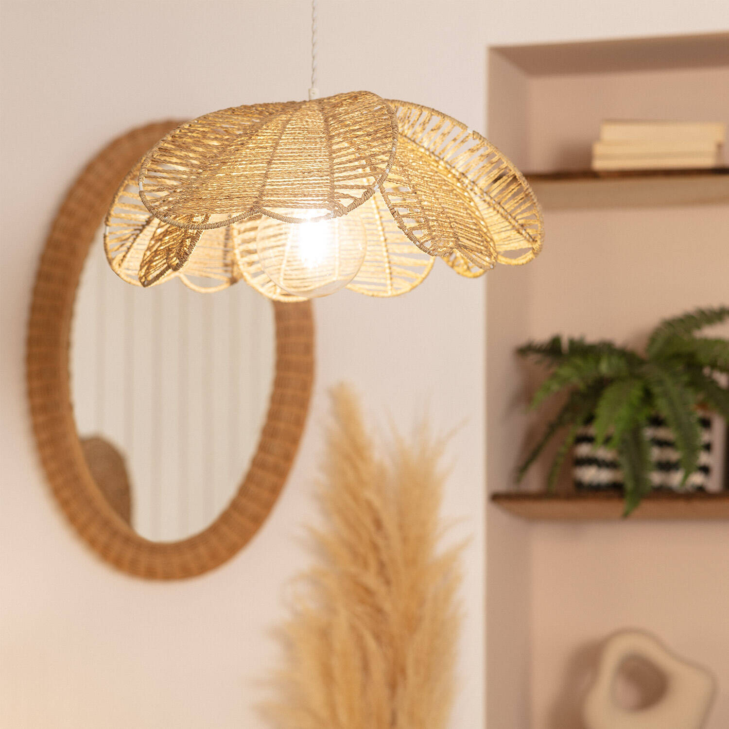 La lámpara colgante Cuerda Giay aporta un toque natural y artesanal a cualquier espacio interior. Su diseño único, elaborado con cuerda marrón trenzada en forma de pétalos, crea una atmósfera cálida y acogedora. Compatible con bombillas E27 de hasta 40W (no incluidas), esta lámpara ofrece una iluminación ambiental ideal para salones, comedores o dormitorios. Su instalación colgante y protección IP20 la hacen perfecta para interiores, mientras que su resistencia a temperaturas de -20 °C a 50 °C garantiza durabilidad. Además, cuenta con certificado CE y una garantía de 3 años, asegurando calidad y seguridad. Una pieza decorativa que combina estilo rústico con funcionalidad moderna.
