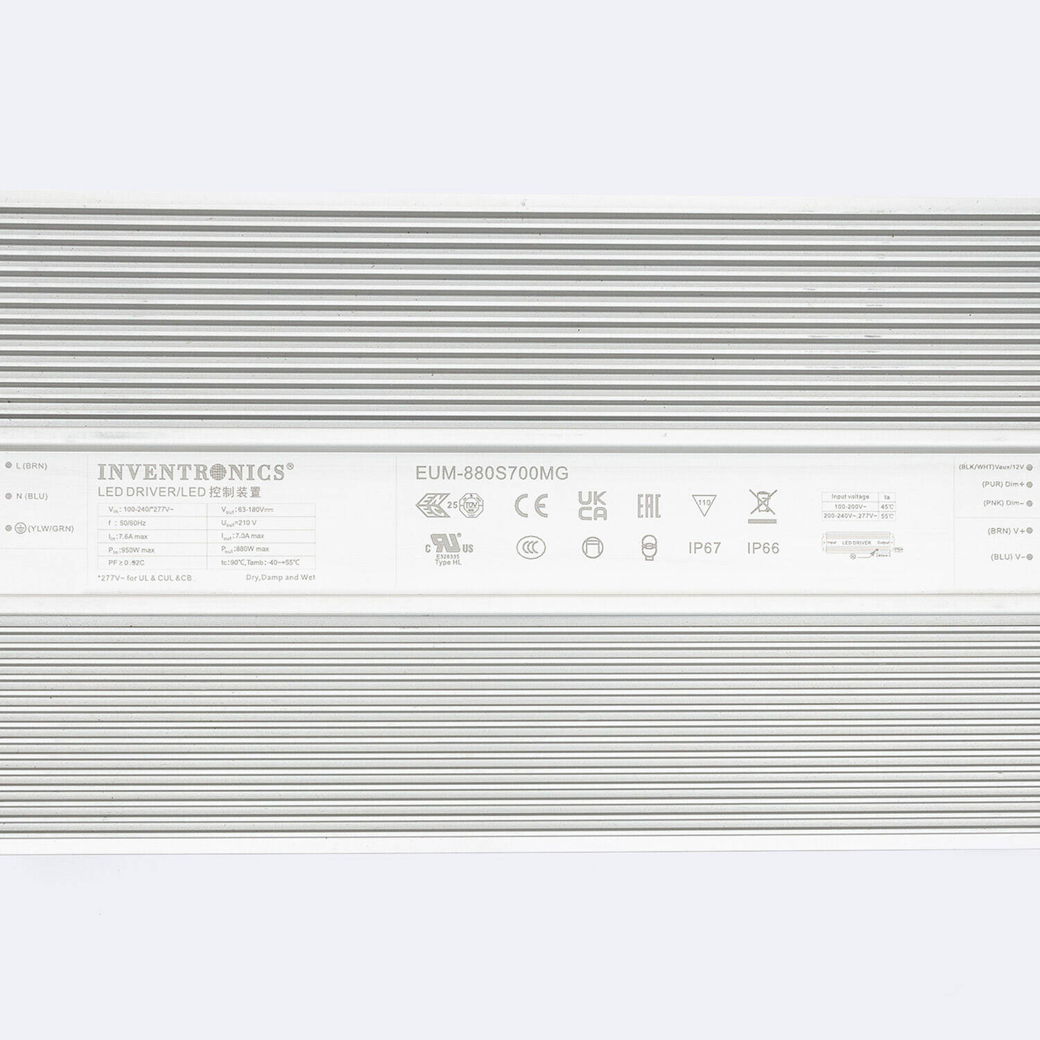 El Driver Regulable 0-10V INVENTRONICS EUM-0880S700MG ofrece una potencia máxima de 880W con un rango de tensión de entrada de 63 a 180V DC y una corriente ajustable entre 4.9 y 7 A. Fabricado en aluminio resistente, cuenta con protección IP67, ideal para instalaciones tanto interiores como exteriores. Su diseño robusto soporta temperaturas de trabajo desde -40 °C hasta 85 °C, garantizando un rendimiento óptimo en condiciones adversas. Dispone de regulación 0-10 V y PWM para un control eficiente de la iluminación LED. Certificado bajo normas internacionales como CE, UL y RoHS, asegura calidad y seguridad. Además, ofrece un factor de potencia de 0.96 y una garantía de 3 años, siendo una solución fiable y duradera para proyectos profesionales.