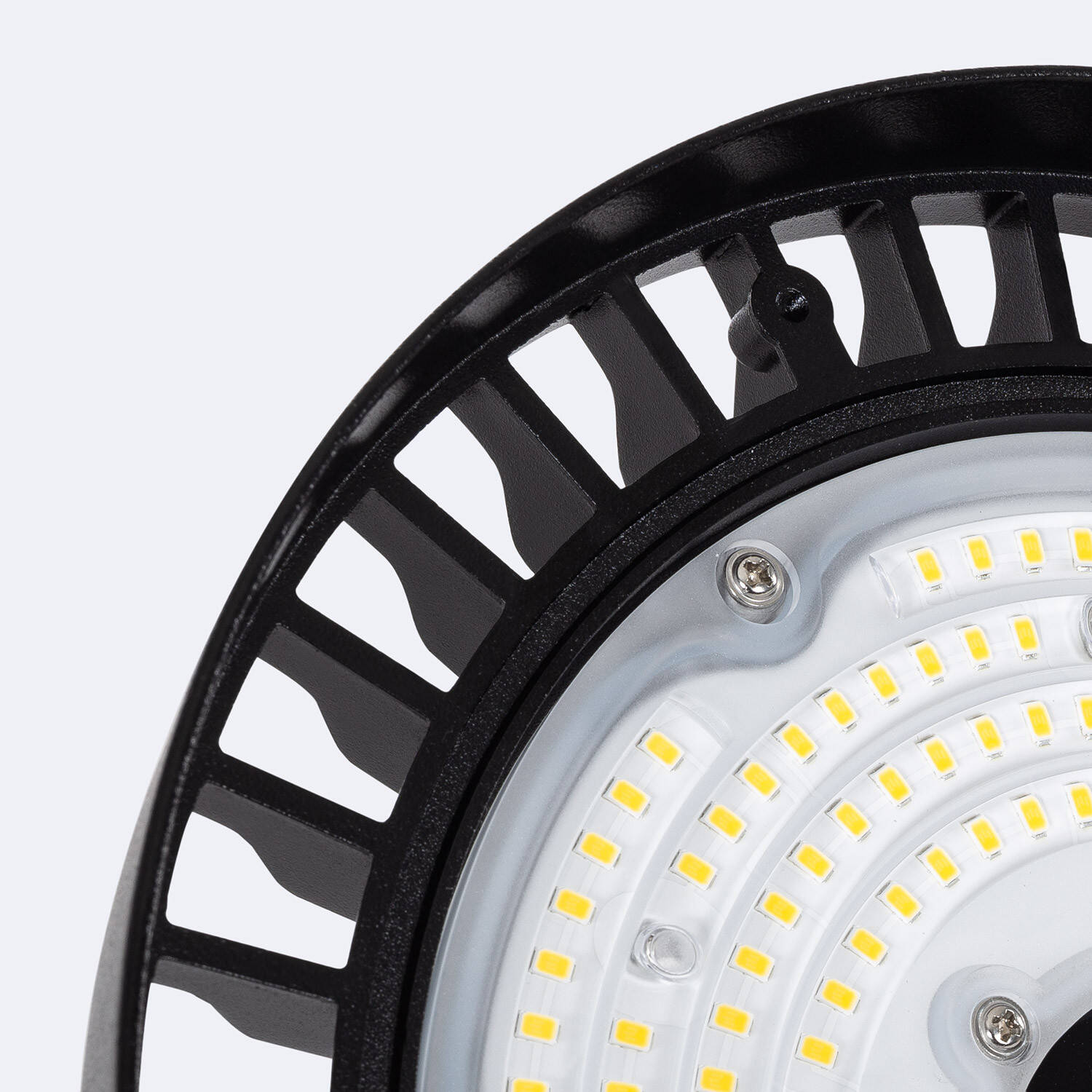 La Campana LED Industrial UFO 150W LIFUD es una luminaria profesional diseñada para entornos industriales exigentes. Con una potencia de 150W y una eficiencia lumínica de hasta 170 lm/W, ofrece una luminosidad intensa de 25,500 lúmenes en luz blanco neutro (4000K). Su driver regulable 0-10V permite ajustar la intensidad para optimizar el consumo energético. Fabricada en aluminio robusto, cuenta con protección IP65 e IK08, garantizando resistencia a polvo, agua e impactos, ideal para uso exterior. Soporta temperaturas extremas de -40 °C a 50 °C y tiene una vida útil estimada de 80,000 horas con garantía de 5 años. Su óptica de 120° asegura una iluminación amplia y homogénea, perfecta para naves, talleres y almacenes industriales.