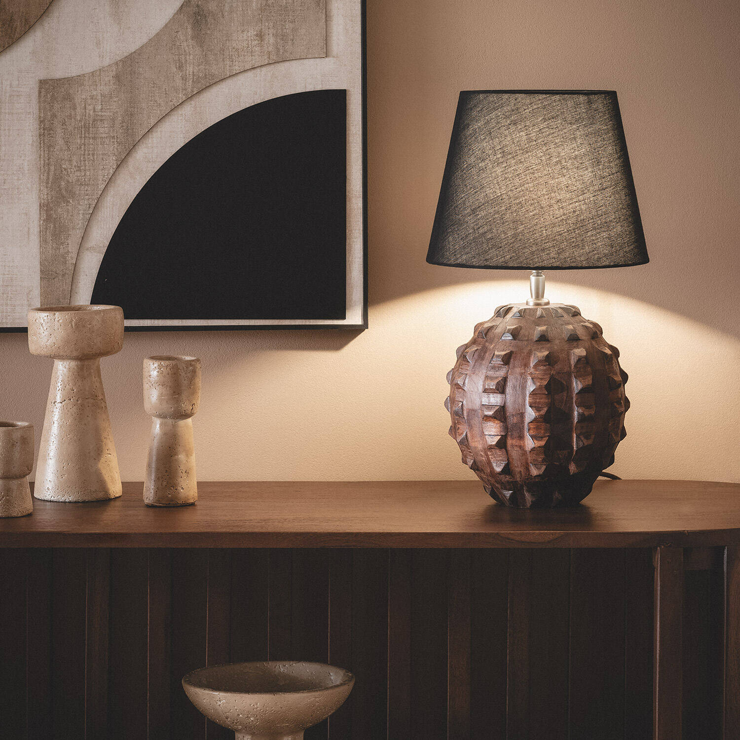 La lámpara de mesa Samesh II ILUZZIA destaca por su base artesanal en madera oscura con un diseño tallado que aporta textura y elegancia natural a cualquier espacio interior. Su pantalla negra complementa perfectamente el estilo sofisticado y contemporáneo, creando un ambiente cálido y acogedor. Compatible con bombillas E27 de hasta 40W, ofrece una iluminación funcional y decorativa ideal para salones, dormitorios o despachos. Incluye interruptor para un manejo cómodo y está certificada con CE, RoHS y UKCA, garantizando calidad y seguridad. Su resistencia a temperaturas de -20 °C a 50 °C y protección IP20 la hacen perfecta para uso en interiores. Además, cuenta con 3 años de garantía, asegurando durabilidad y confianza.