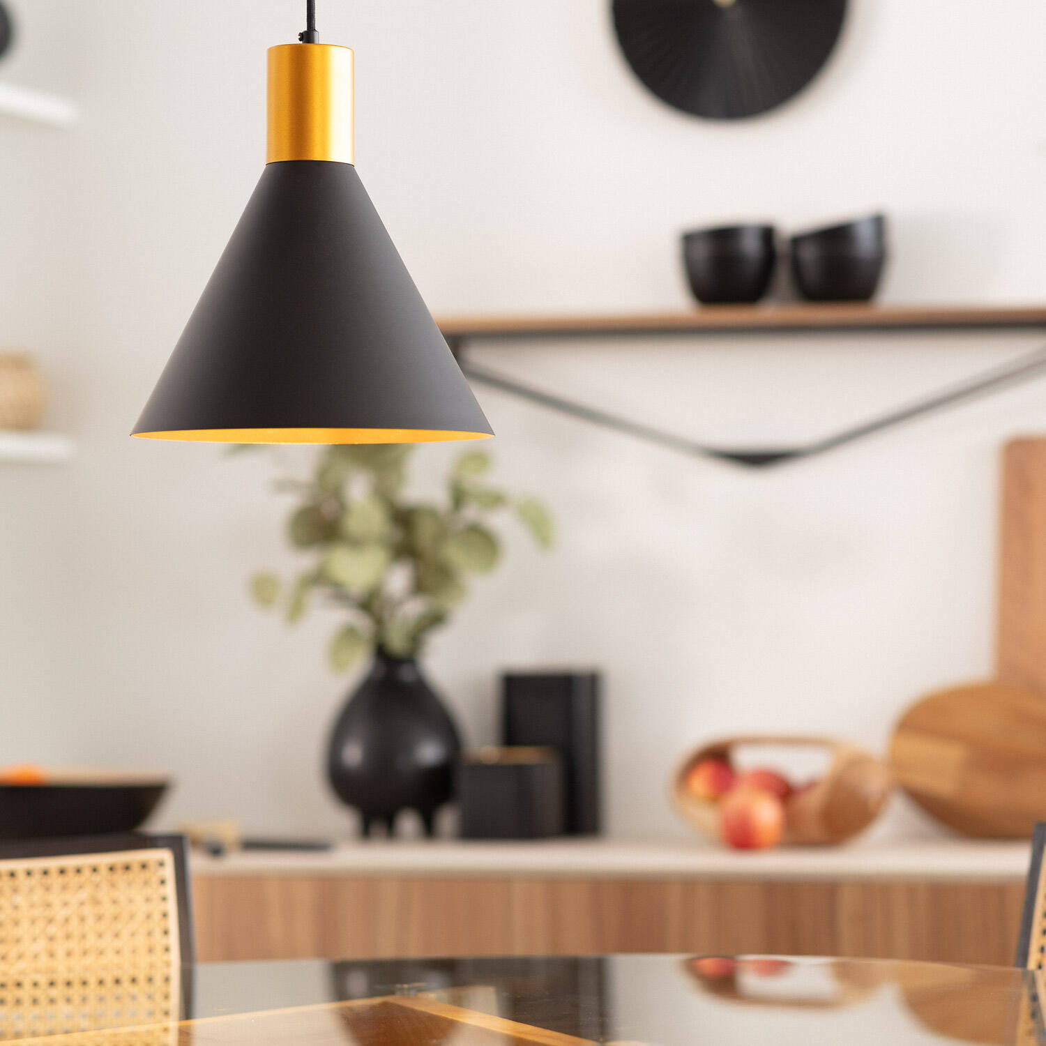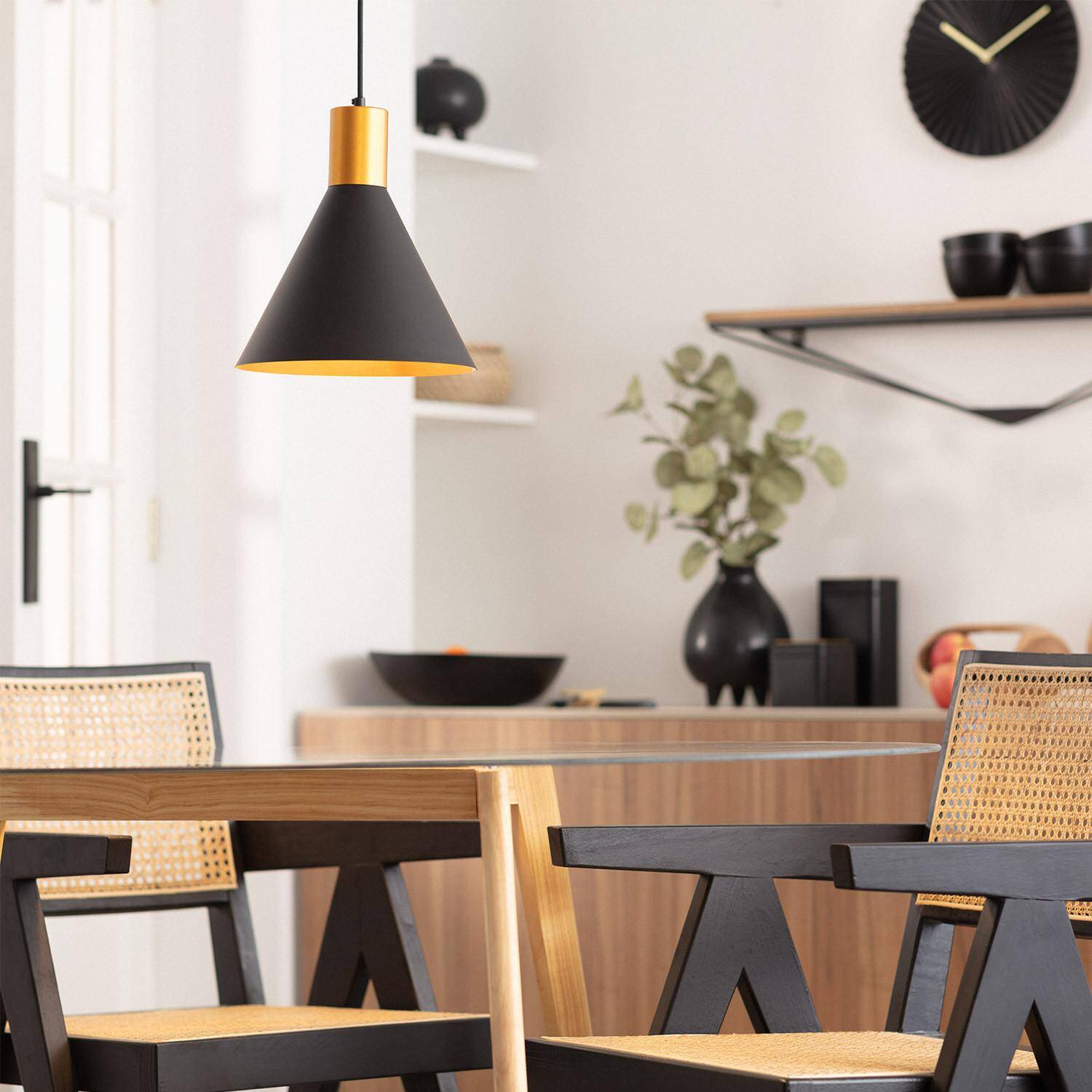 La lámpara colgante Metal Orbat destaca por su diseño moderno y elegante, combinando un acabado negro mate con detalles en dorado que aportan un toque sofisticado a cualquier espacio interior. Fabricada en aluminio, garantiza durabilidad y resistencia, mientras que su casquillo E27 permite la instalación de bombillas de hasta 20 W (no incluidas), facilitando la personalización de la iluminación. Ideal para ambientes cálidos y acogedores, esta lámpara soporta temperaturas de trabajo entre -20 °C y 50 °C. Su protección IP20 la hace apta para interiores, y cuenta con certificaciones CE, RoHS y UKCA, asegurando calidad y seguridad. Perfecta para salones, comedores o zonas de trabajo con estilo contemporáneo.