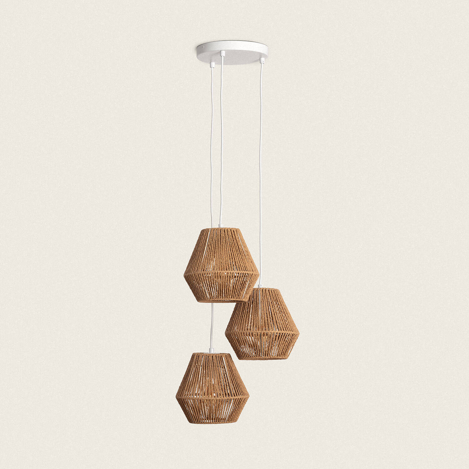 La lámpara colgante Trilla destaca por su diseño natural y artesanal, con tres focos elaborados en papel trenzado de color marrón que aportan un toque cálido y acogedor a cualquier estancia interior. Su estructura suspendida en cables blancos crea un efecto visual ligero y elegante. Compatible con bombillas E27 (no incluidas), permite personalizar la iluminación según tus necesidades, con una potencia máxima de 40 W por foco. Ideal para ambientes que buscan un estilo rústico o bohemio, esta lámpara cuenta con certificaciones CE, RoHS y UKCA, y ofrece una garantía de 3 años. Su resistencia a temperaturas de -20 °C a 50 °C asegura durabilidad y funcionamiento óptimo en interiores.