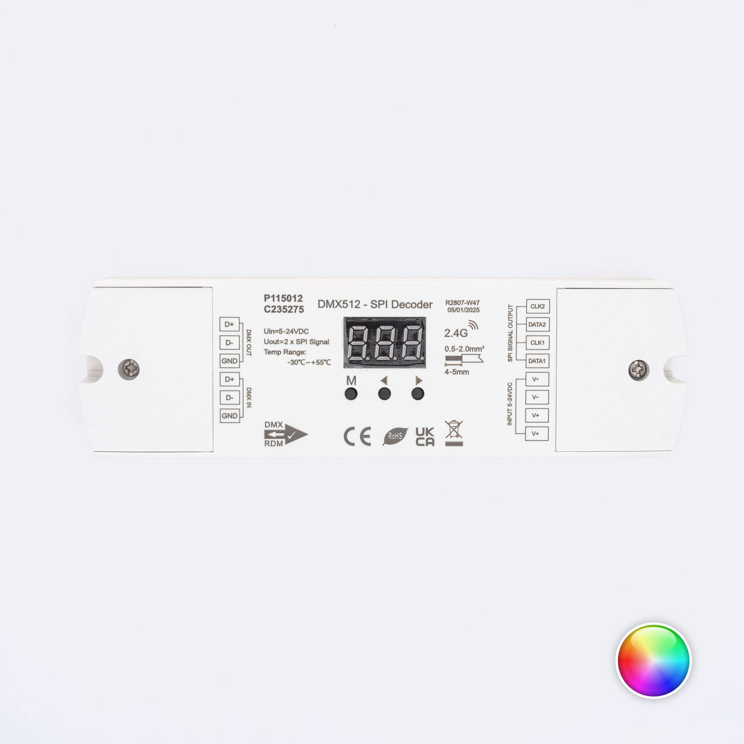 Este controlador DMX para tira LED digital SPI RGB/RGBW es ideal para proyectos de iluminación interior que requieren precisión y versatilidad. Compatible con tiras LED de 5 a 24 V DC, ofrece una potencia de 1 W y permite regulación mediante protocolo DMX, garantizando un control avanzado del color y la intensidad. Su carcasa de policarbonato blanca es resistente y cuenta con certificaciones CE, EMC y RoHS, asegurando calidad y seguridad. Funciona en un amplio rango de temperaturas desde -30 °C hasta 55 °C, adaptándose a diversas condiciones ambientales. Con protección IP20, es perfecto para instalaciones en interiores, y su garantía de 3 años aporta confianza y durabilidad. Un dispositivo compacto y eficiente para controlar iluminación RGBW con precisión profesional.