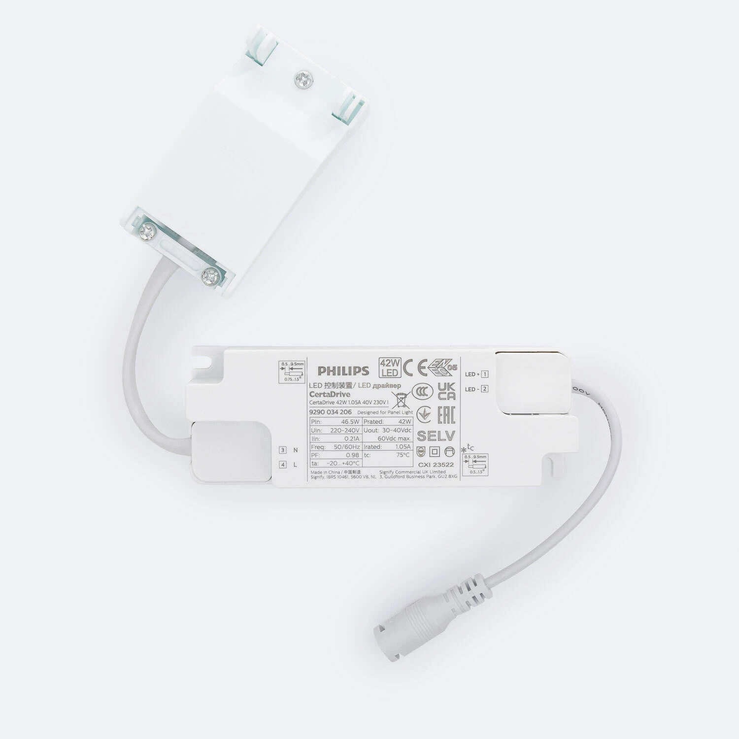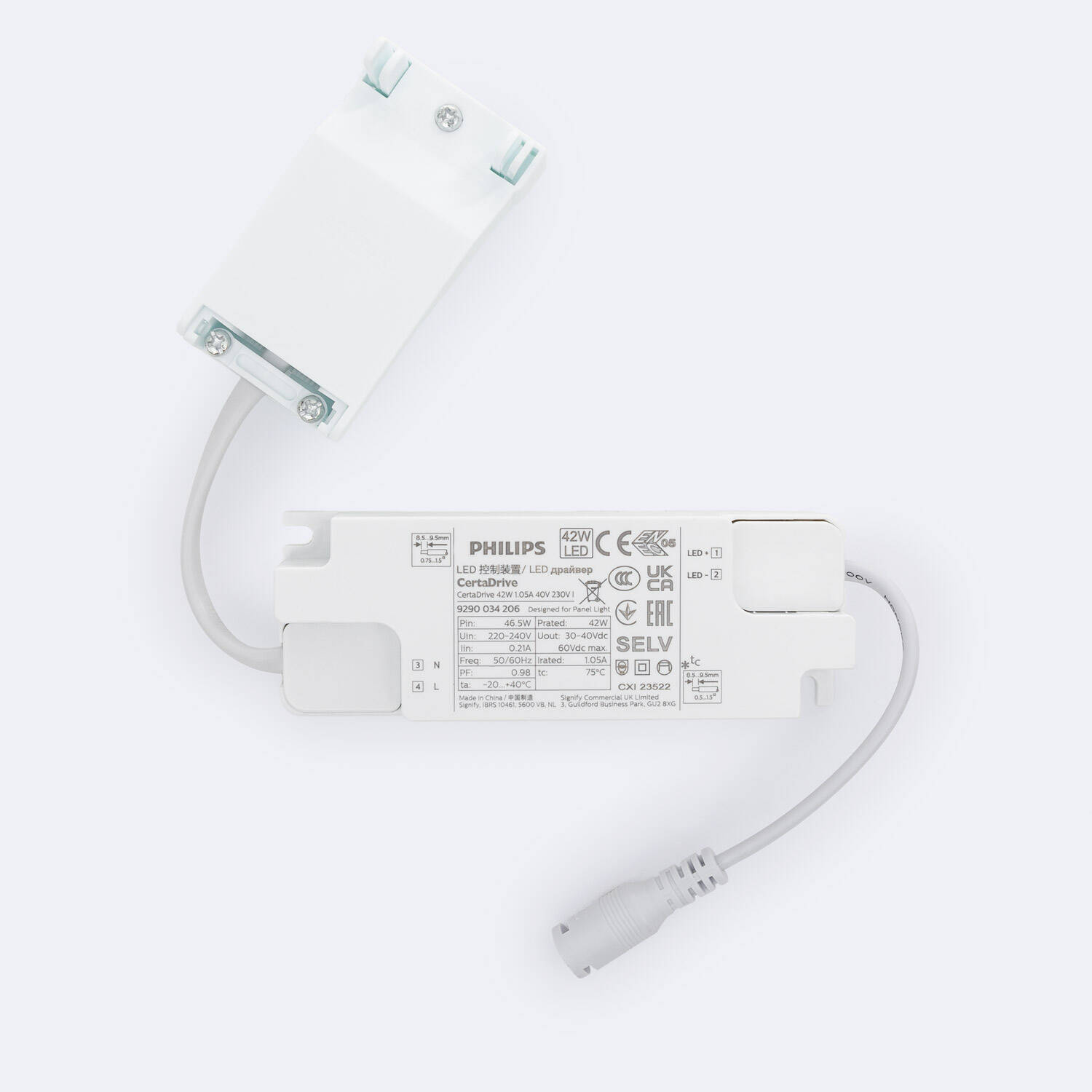 El Driver PHILIPS Certadrive es una solución eficiente y segura para iluminación LED interior, con una potencia de 42W y una salida de 30-40V a 1050mA. Funciona con un voltaje de entrada de 220-240V AC y frecuencia de 50-60 Hz, garantizando un alto factor de potencia de 0.98 que optimiza el consumo energético. Su diseño incluye una caja de conexiones rápidas para una instalación sencilla y segura, además de contar con protección IP20 y aislamiento clase II. Este driver es ignífugo, soporta temperaturas de trabajo entre -10 °C y 45 °C, y cumple con certificaciones CE, ENEC, RoHS y UKCA, ofreciendo fiabilidad y calidad respaldadas por Philips y una garantía de 3 años.
