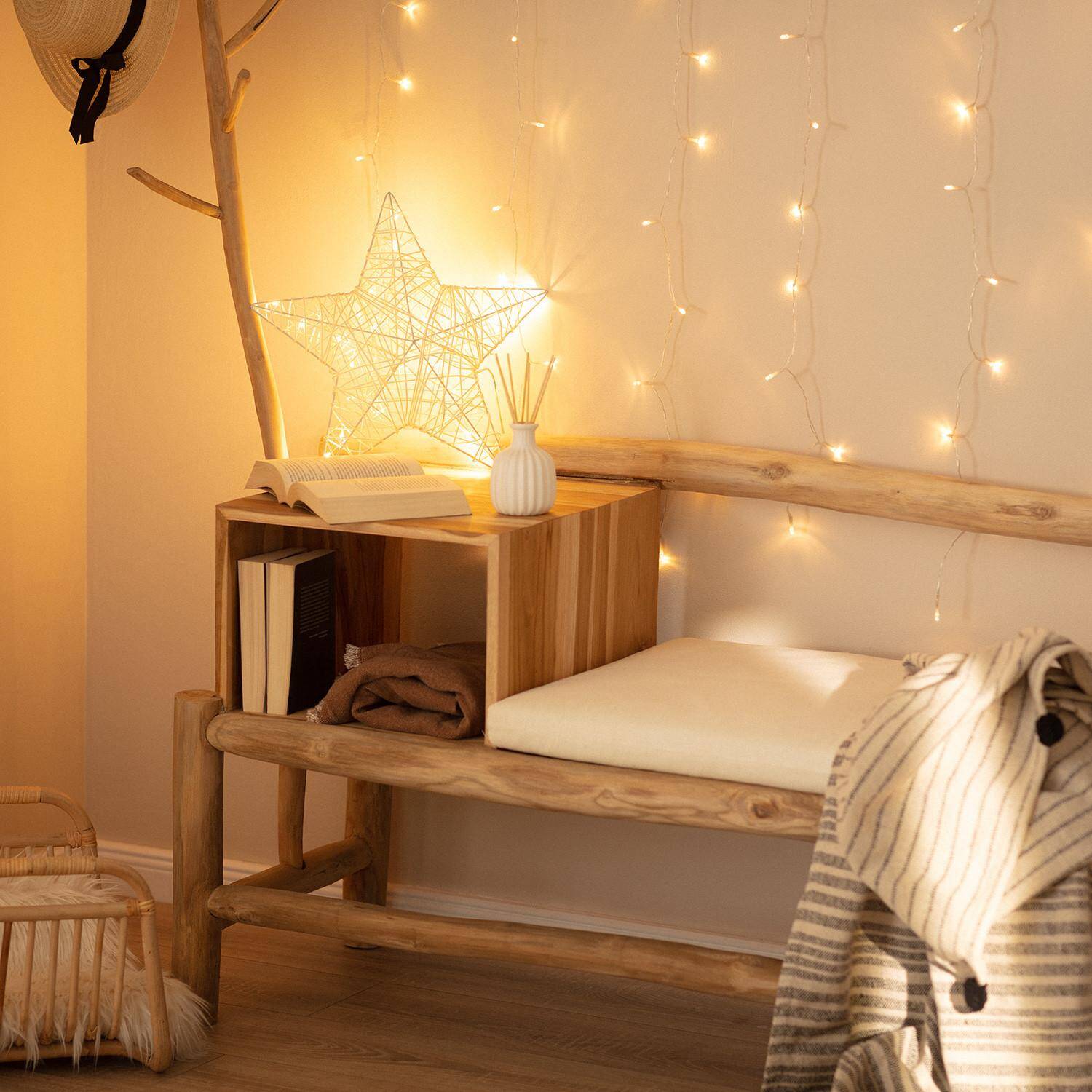 La Estrella con Guirnalda de Luces LED Irawo de 42x42 cm es una pieza decorativa que aporta calidez y estilo a cualquier espacio. Fabricada con fibras naturales, combina un diseño artesanal con 20 luces LED de color blanco cálido (3000K), creando un ambiente acogedor y elegante. Su estructura ligera y resistente está certificada con CE, RoHS y UKCA, garantizando calidad y seguridad. Ideal para interiores, soporta temperaturas de -20 °C a 50 °C y cuenta con una protección IP20. Su vida útil de hasta 30.000 horas asegura un uso prolongado, mientras que su luz suave y envolvente realza la decoración navideña o cualquier rincón especial en el hogar. Además, ofrece una garantía de 3 años para mayor tranquilidad.
