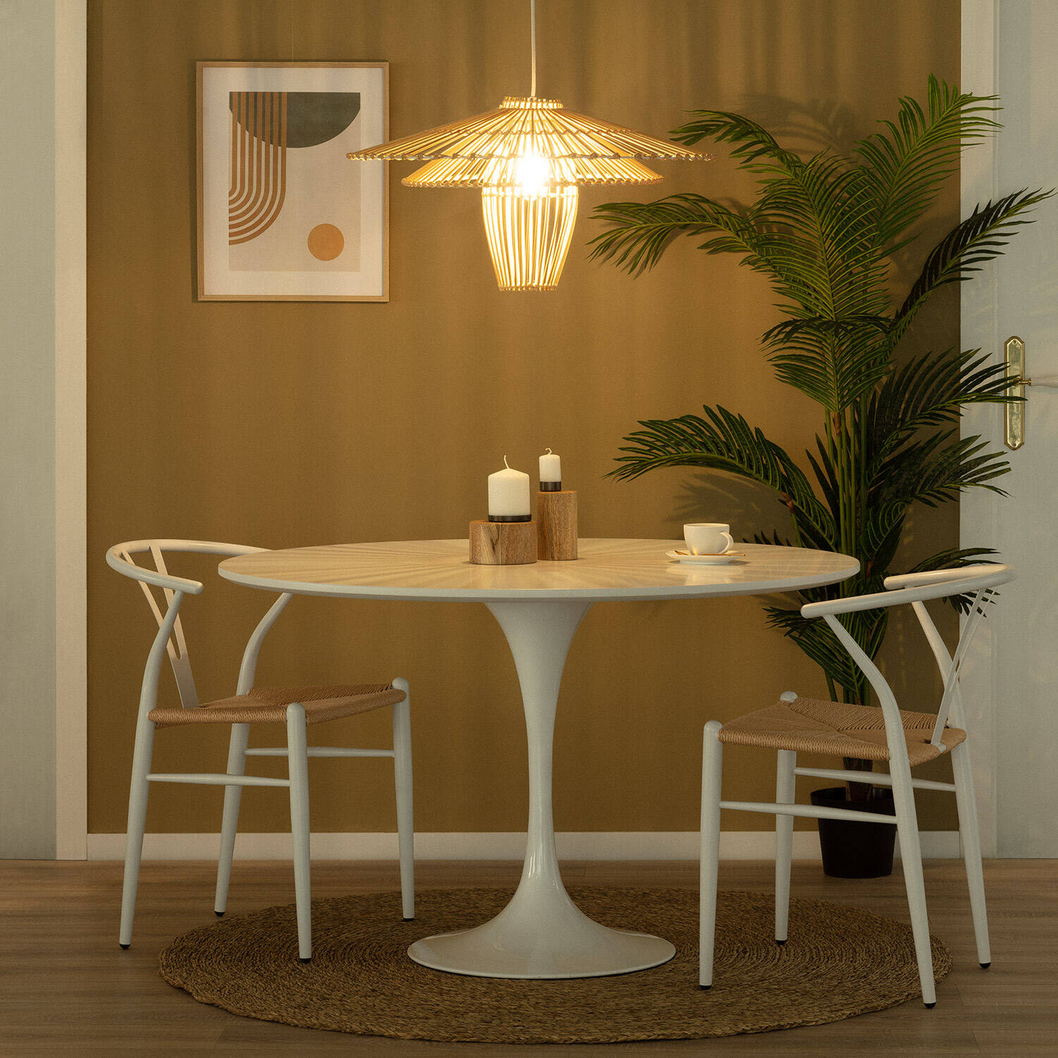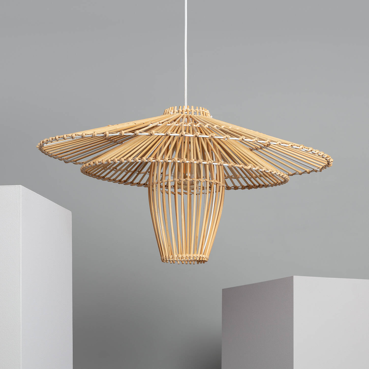 Esta lámpara colgante de bambú Jiang es una pieza única que combina elegancia natural y diseño artesanal. Su estructura ligera y estilizada, fabricada en bambú natural, aporta un toque cálido y orgánico a cualquier espacio interior. Equipada con casquillo E27, ofrece una potencia máxima que permite una iluminación envolvente y confortable, ideal para crear ambientes acogedores y sofisticados. Su protección IP20 garantiza un uso exclusivo en interiores, mientras que su florón compacto facilita una instalación discreta y armoniosa. Perfecta para realzar comedores, salones o zonas de lectura, esta lámpara destaca por su estética contemporánea y su capacidad para transformar la atmósfera con una luz suave y envolvente.
