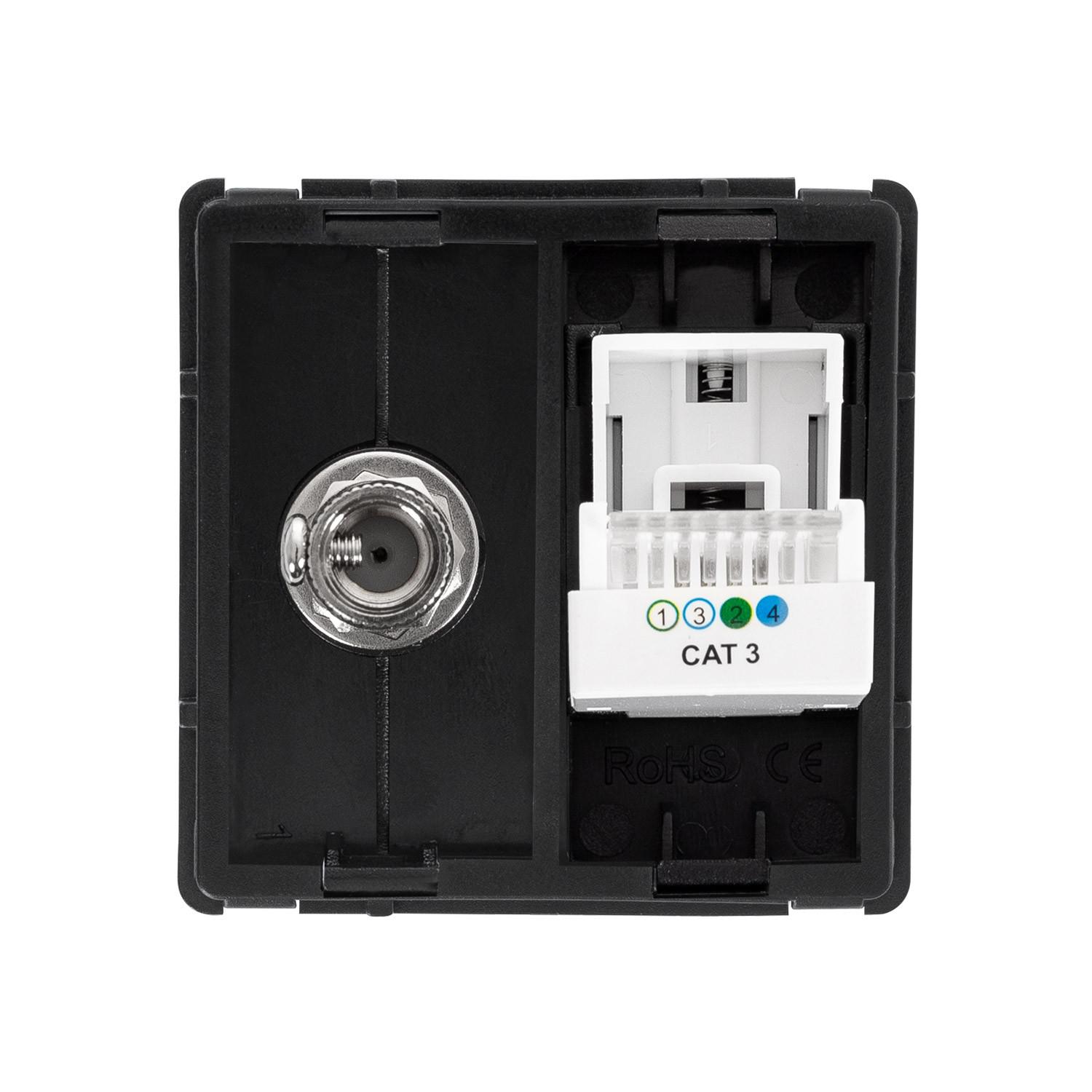 La Toma TV + Teléfono Modern es un mecanismo empotrable diseñado para interiores, que combina funcionalidad y estilo en un solo dispositivo. Fabricado en resistente material PC y disponible en color negro, ofrece una solución práctica para conectar tanto la televisión como el teléfono en un mismo punto. Cuenta con certificaciones CE, RoHS y UKCA, garantizando calidad y seguridad. Su rango de temperatura de trabajo de -10 °C a 40 °C asegura un rendimiento óptimo en distintas condiciones ambientales. Con protección IP20 y una garantía de 3 años, este producto de la serie Modern es ideal para instalaciones modernas que buscan eficiencia y durabilidad sin renunciar al diseño.