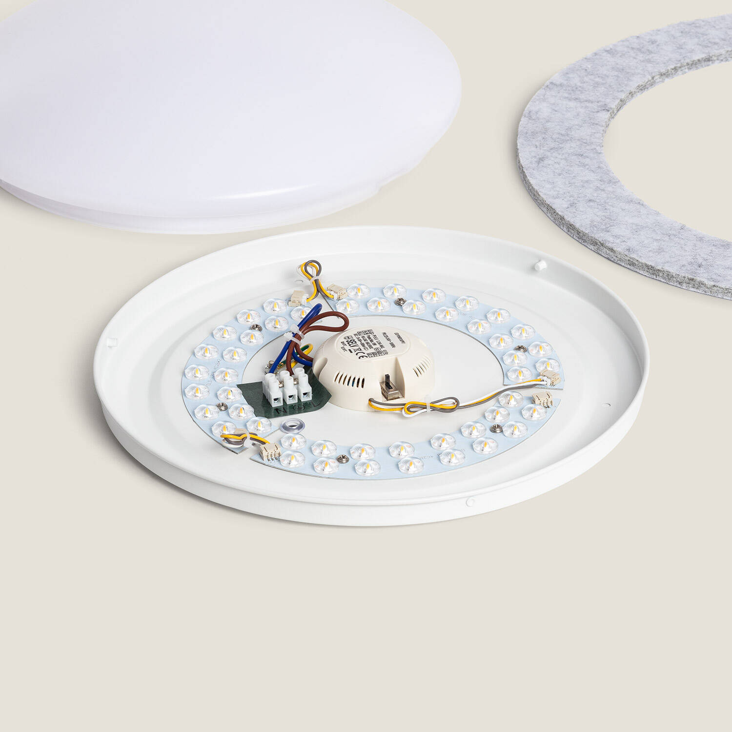 El plafón LED acústico Lezhan de 18W combina iluminación eficiente y diseño funcional. Con un diámetro de 460 mm, su estructura circular incorpora un marco de fieltro que aporta propiedades acústicas, ideal para reducir el ruido ambiental en interiores. Ofrece una luminosidad de 830 lúmenes con una eficiencia de 43 lm/W y permite seleccionar entre tres temperaturas de color (2400K, 3000K y 4000K) para adaptarse a diferentes ambientes. Su tecnología No Flicker garantiza una luz estable sin parpadeos, mejorando el confort visual. Certificado con CE, RoHS y UKCA, soporta temperaturas de trabajo entre -20 °C y 50 °C, y cuenta con una vida útil aproximada de 30.000 horas, asegurando durabilidad y calidad.