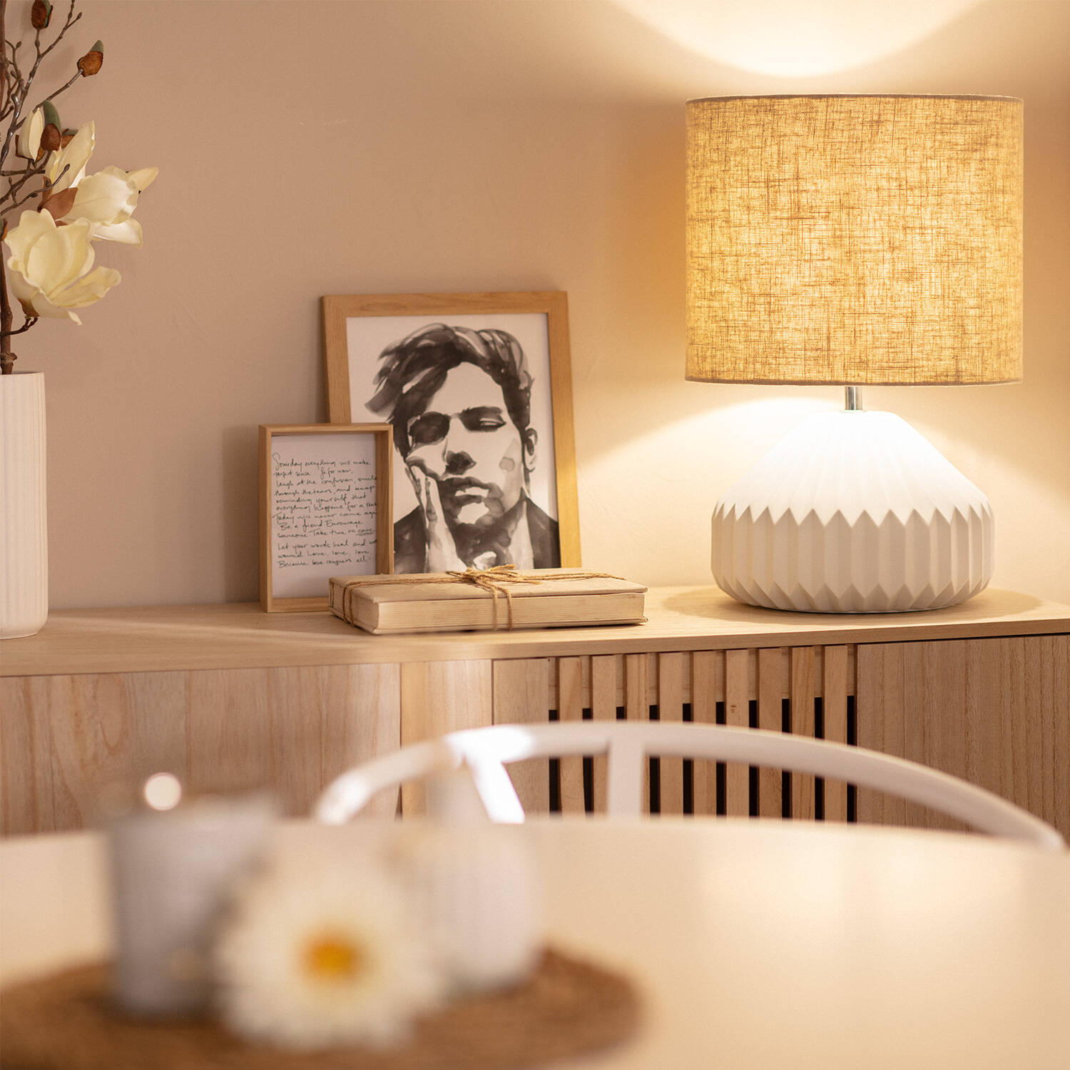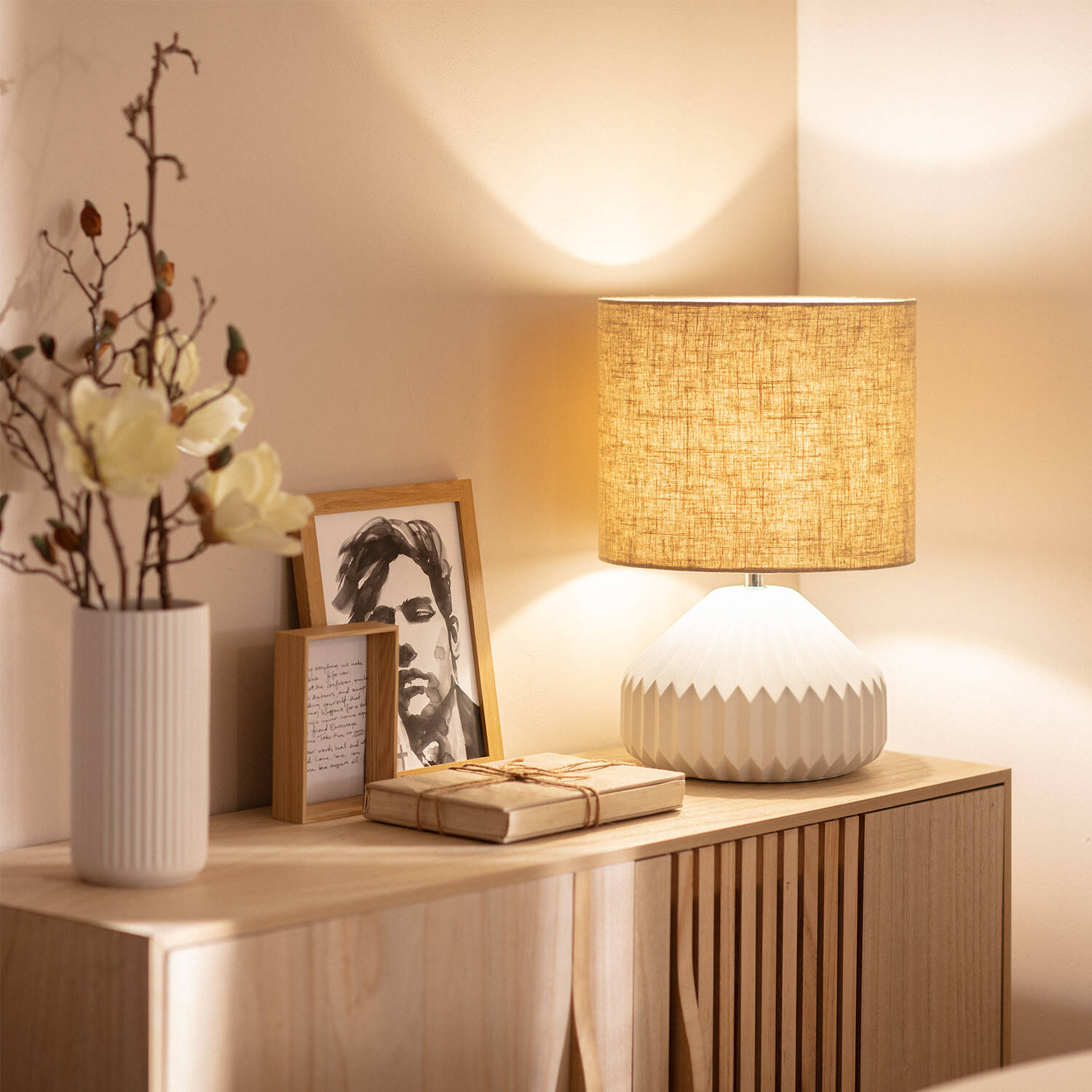 La lámpara de mesa Monduver combina elegancia y funcionalidad con su base de porcelana blanca de diseño geométrico y pantalla de tela beige que aporta calidez. Ideal para interiores, ofrece un punto de luz con casquillo E27 y potencia máxima de 40 W (bombilla no incluida). Su diseño atemporal y acabado en blanco se integra perfectamente en cualquier ambiente, desde salones hasta dormitorios. Cuenta con interruptor incluido para un uso cómodo y seguro, además de certificaciones CE, RoHS y UKCA que garantizan calidad y seguridad. Resistente a temperaturas entre -20 °C y 50 °C, es una pieza decorativa que aporta estilo y luz suave, perfecta para crear ambientes acogedores y sofisticados.