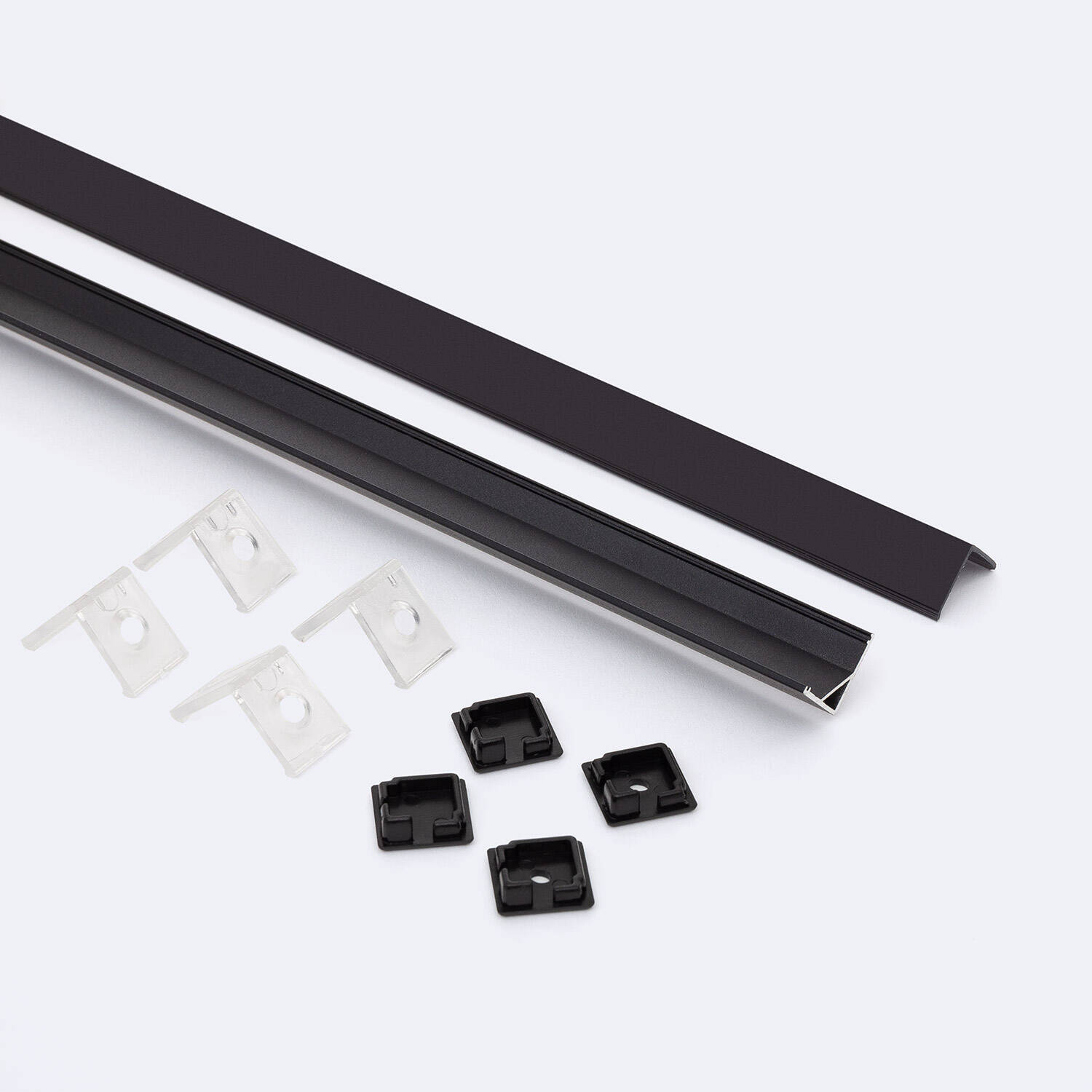 Perfil de aluminio en forma de esquina triangular de 2 metros, diseñado para alojar tiras LED de hasta 10 mm de ancho. Fabricado en aluminio resistente, ofrece una excelente disipación térmica que prolonga la vida útil de las tiras LED. Su acabado en color negro y tapa superior negro traslúcido proporcionan un diseño elegante y discreto, ideal para instalaciones en interiores. Se instala fácilmente sobre superficies, aportando un acabado profesional y ordenado a cualquier proyecto de iluminación. Incluye todos los accesorios necesarios para su montaje y cuenta con certificación RoHS, garantizando seguridad y calidad. Perfecto para iluminar esquinas y rincones con un toque moderno y funcional.
