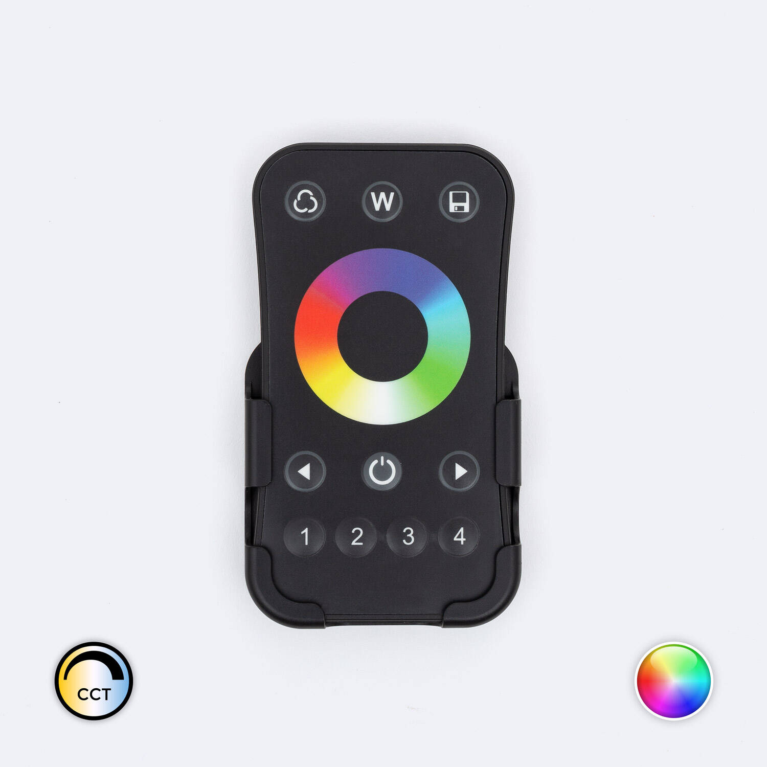 El Mando RF para Reguladores RF RGBWW Monocolor 4 Zonas es un control remoto avanzado diseñado para gestionar la iluminación RGBWW y monocolor en interiores. Su diseño compacto en color negro, fabricado en resistente material PC, ofrece una experiencia intuitiva gracias a su rueda táctil de colores y botones específicos para controlar hasta cuatro zonas distintas. Con certificaciones CE, RoHS y UKCA, garantiza calidad y seguridad, además de una protección IP20 adecuada para uso interior. Su instalación en superficie es sencilla y práctica. Este mando permite ajustar la intensidad y temperatura de color, optimizando el ambiente según tus necesidades. Incluye soporte para facilitar su colocación y cuenta con una garantía de 3 años, asegurando durabilidad y confianza.