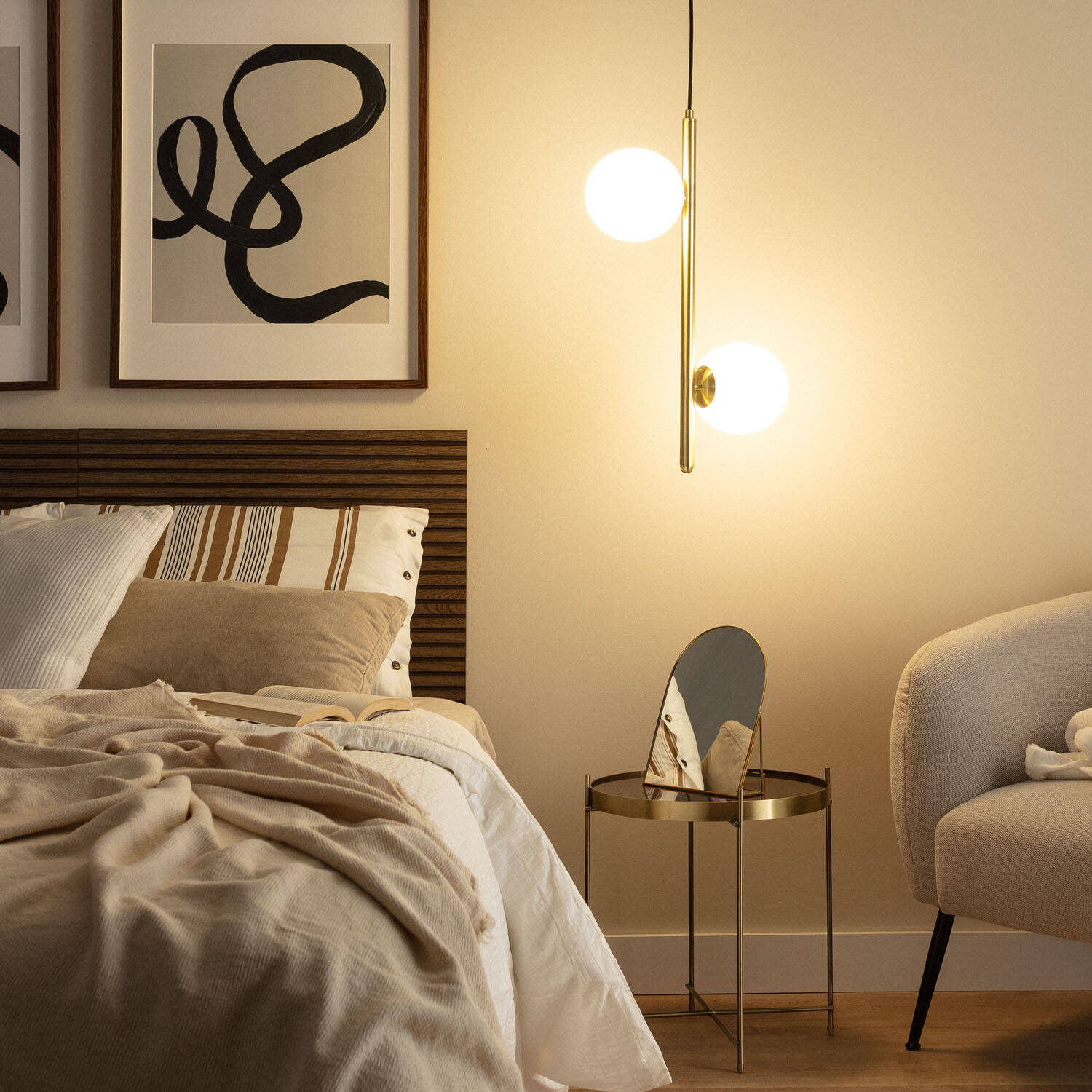 La lámpara colgante Moonlight Doble combina elegancia y modernidad con su estructura metálica dorada y dos esferas de cristal opalino que aportan una luz suave y ambiental. Diseñada para interiores, incorpora dos puntos de luz con casquillo E14, permitiendo elegir las bombillas que mejor se adapten a tu estilo y necesidades. Su diseño vertical y minimalista la hace perfecta para salones, dormitorios o zonas de lectura, aportando un toque sofisticado y cálido. Con certificaciones CE, RoHS y UKCA, garantiza seguridad y calidad. Soporta temperaturas de -20 °C a 50 °C y cuenta con protección IP20, ideal para ambientes interiores. Incluye garantía de 3 años, asegurando durabilidad y confianza en tu compra.
