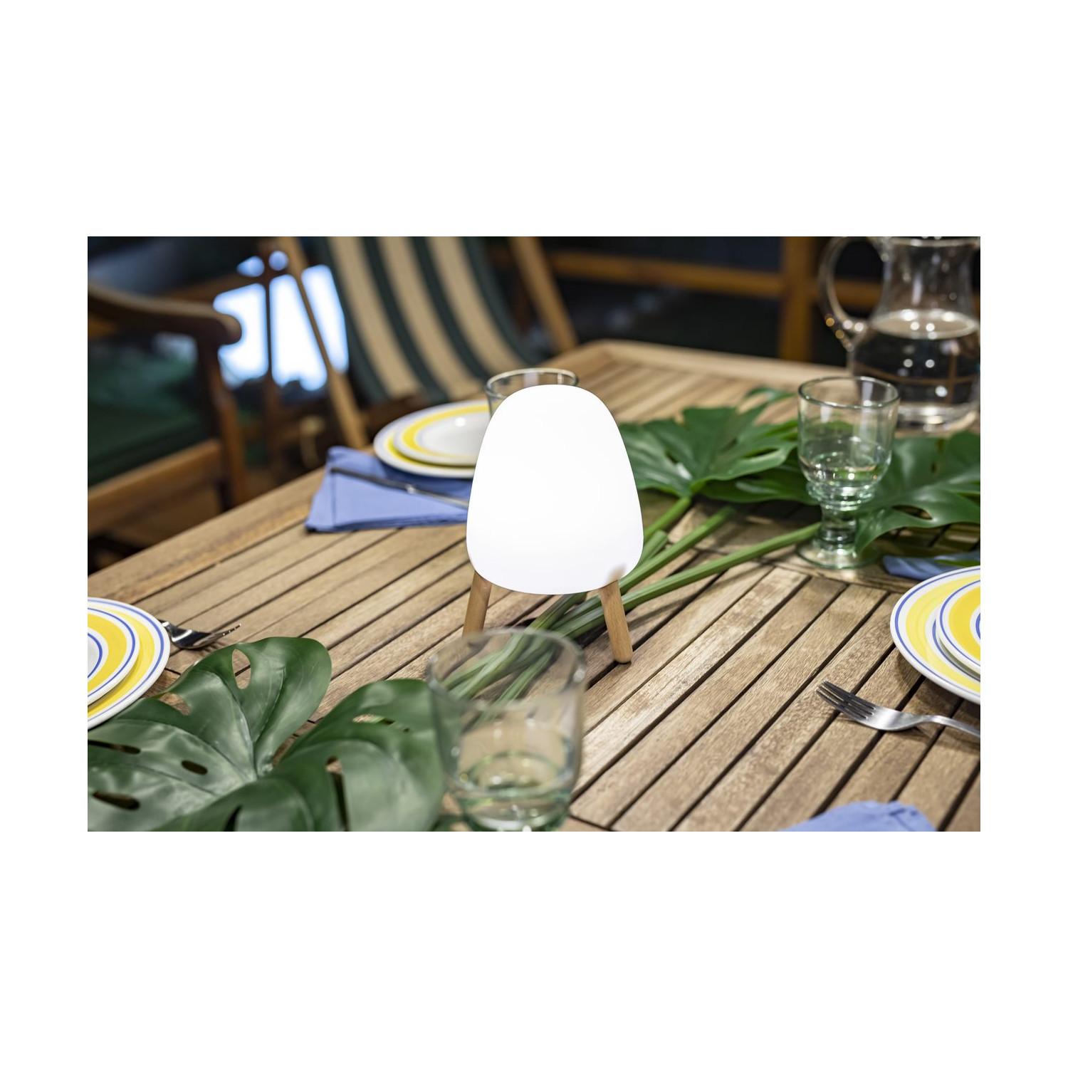 La lámpara de mesa LED Rocket 20 Battery de Newgarden es una pieza moderna y funcional diseñada para interiores y exteriores. Con un diseño compacto y elegante en color blanco, combina una pantalla de silicona opal con patas de madera, aportando calidez y estilo. Su luz blanca cálida (2700K) ofrece una luminosidad suave de 11 lúmenes, ideal para crear ambientes acogedores. Cuenta con regulación táctil para ajustar la intensidad lumínica según tus necesidades. Resistente y certificada con protección IP43, soporta temperaturas desde -20 °C hasta 50 °C, perfecta para uso exterior. Además, su batería recargable ofrece movilidad sin cables. Su durabilidad de 25.000 horas y garantía de 3 años aseguran calidad y fiabilidad.