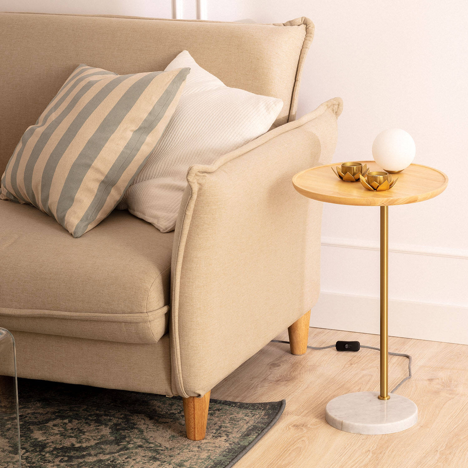 La lámpara de mesa Brandt combina elegancia y funcionalidad con un diseño moderno y sofisticado. Su estructura está fabricada en madera natural y cristal opal, aportando calidez y estilo a cualquier espacio interior. Presenta un acabado en blanco y dorado que realza su estética minimalista. Cuenta con un casquillo G9 y una potencia máxima de 5W, ideal para crear ambientes acogedores. Su base de mármol garantiza estabilidad y durabilidad. Además, está certificada con CE, RoHS y UKCA, asegurando calidad y seguridad. Perfecta para salones o dormitorios, esta lámpara es un complemento decorativo que aporta luz y personalidad, con una garantía de 3 años para mayor confianza. Bombilla no incluida.