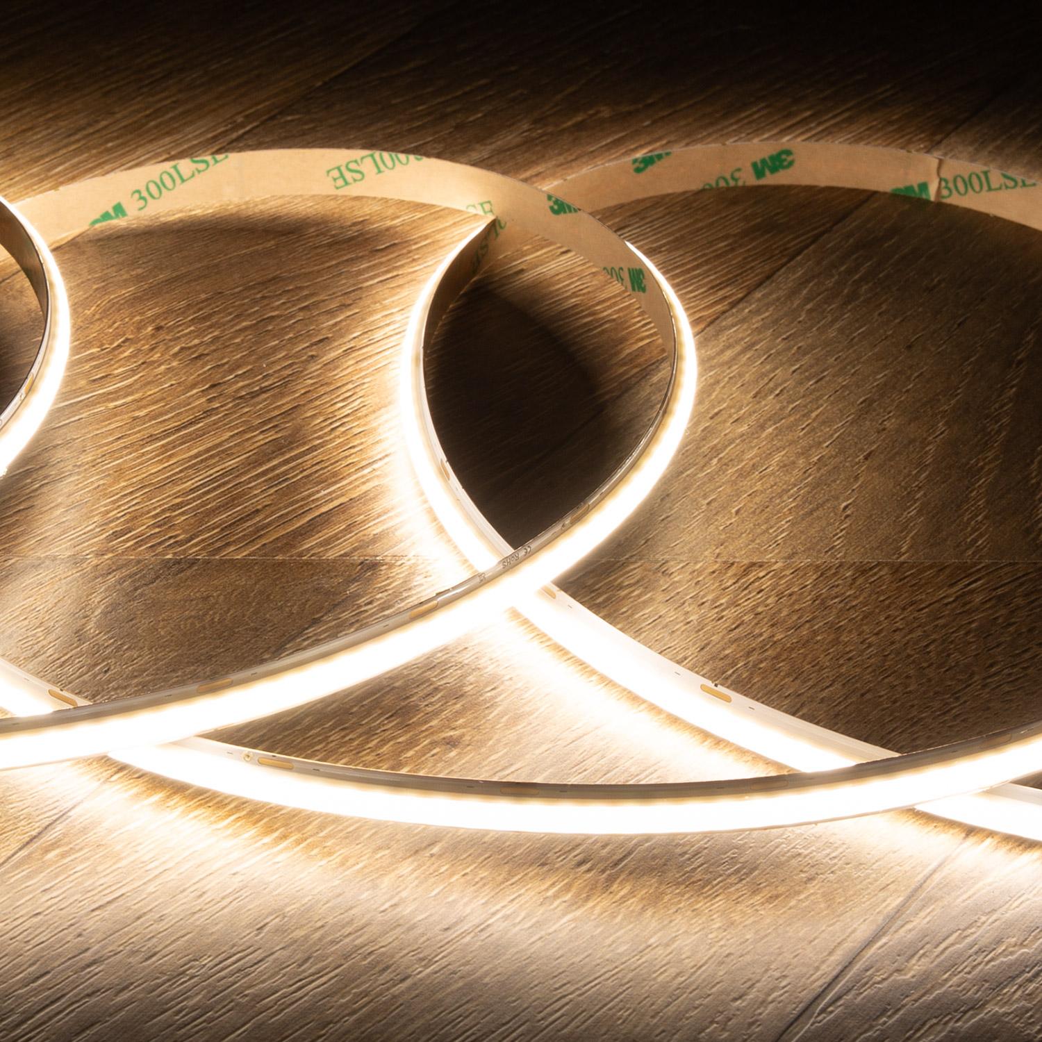 La tira LED 24V WCOB de 5 metros ofrece una iluminación eficiente y de alta calidad con 256 LEDs por metro, proporcionando 1100 lúmenes y 10W de potencia por metro. Su luz blanco neutro de 4000K, con un índice de reproducción cromática CRI90, asegura colores vivos y naturales. Con un ancho de solo 8 mm y corte cada 3.2 cm, es perfecta para adaptarse a diferentes espacios interiores. Esta tira regulable, con certificaciones CE, RoHS y UKCA, funciona en un rango de temperatura de -20 °C a 50 °C y tiene una vida útil de 40.000 horas. Ideal para crear ambientes modernos y confortables con una luz uniforme y sin parpadeos.