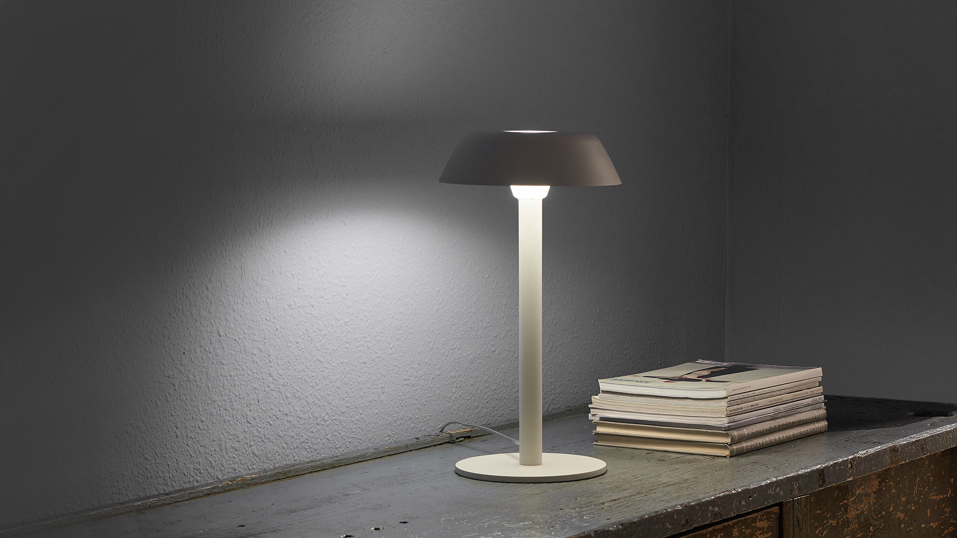 Xavier Solé, ha querido con este diseño reinterpretar las clásicas lámparas de luz incandescente integrando dos tipologías de lámparas en una sola. Las dimensiones generosas del tubo central permiten tener una imagen estable y segura para ubicarse en espacios Contract. La incorporación de luz led en el interior de la tulipa se refleja sutilmente en el interior de la pantalla, creando un ambiente dual de iluminación.