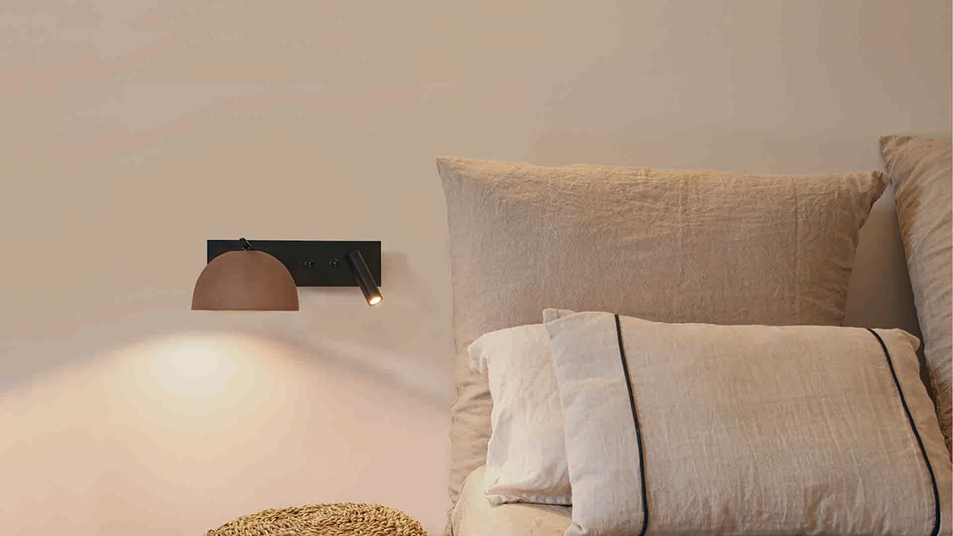Esta nueva versión horizontal con lector del aplique Absis se adapta perfectamente como lámpara de cabecera creando un ambiente relajado. La pantalla de cerámica hecha a mano, da un toque natural y de calidez al entorno.