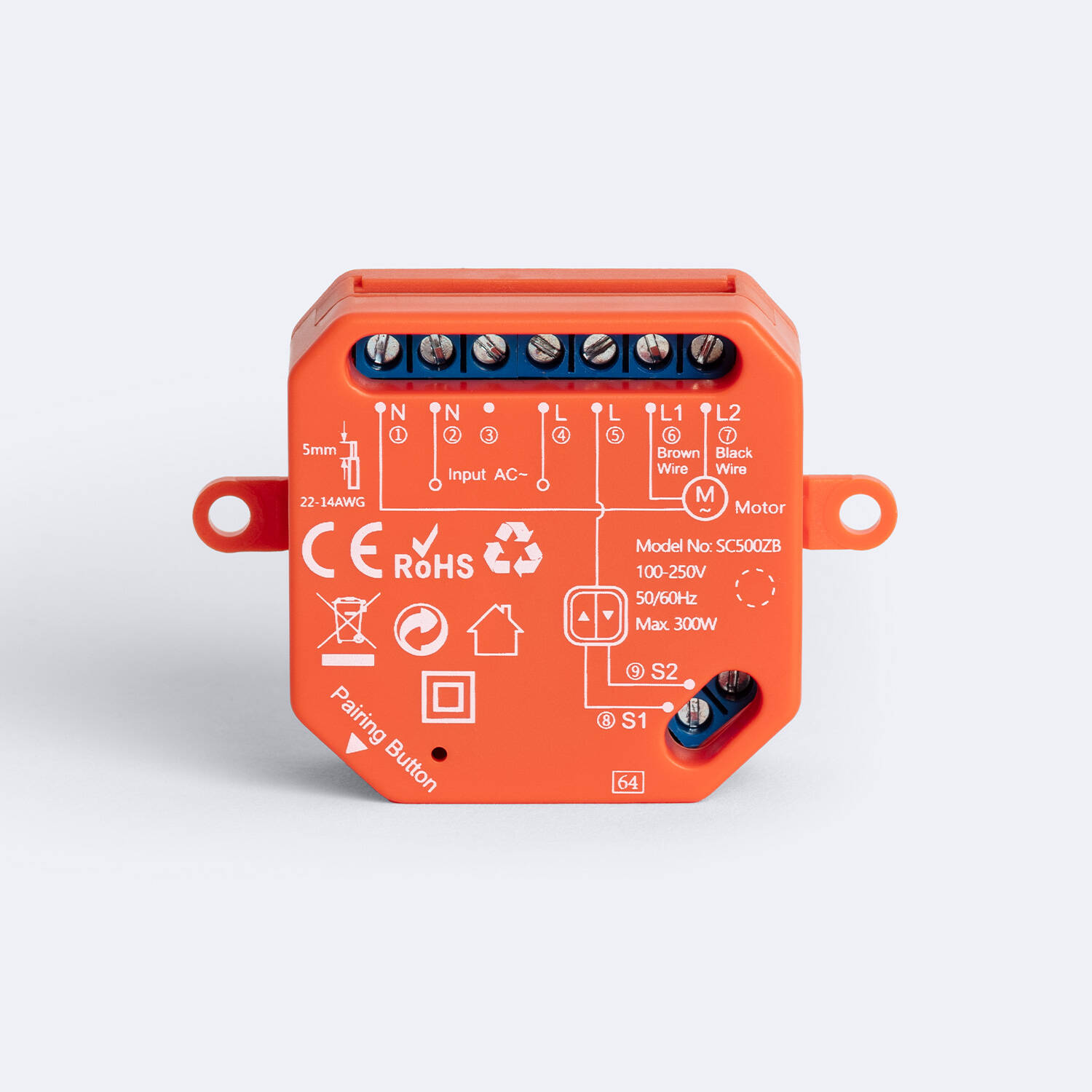 El Interruptor Persiana ZigBee es un dispositivo compacto y robusto diseñado para controlar persianas eléctricas de hasta 300 W con total comodidad y eficiencia. Fabricado en ABS y en un llamativo color rojo, este interruptor es ideal para uso en interiores, soportando temperaturas desde -20 °C hasta 55 °C, lo que garantiza su funcionamiento en diversas condiciones ambientales. Compatible con la frecuencia estándar de 50-60 Hz y tensión de 220-240V AC, cuenta con certificaciones CE y RoHS, asegurando calidad y seguridad. Su diseño incorpora conexiones claras y un botón de emparejamiento para una integración sencilla en sistemas domóticos ZigBee, facilitando el control remoto y la automatización del hogar con una garantía de 3 años.