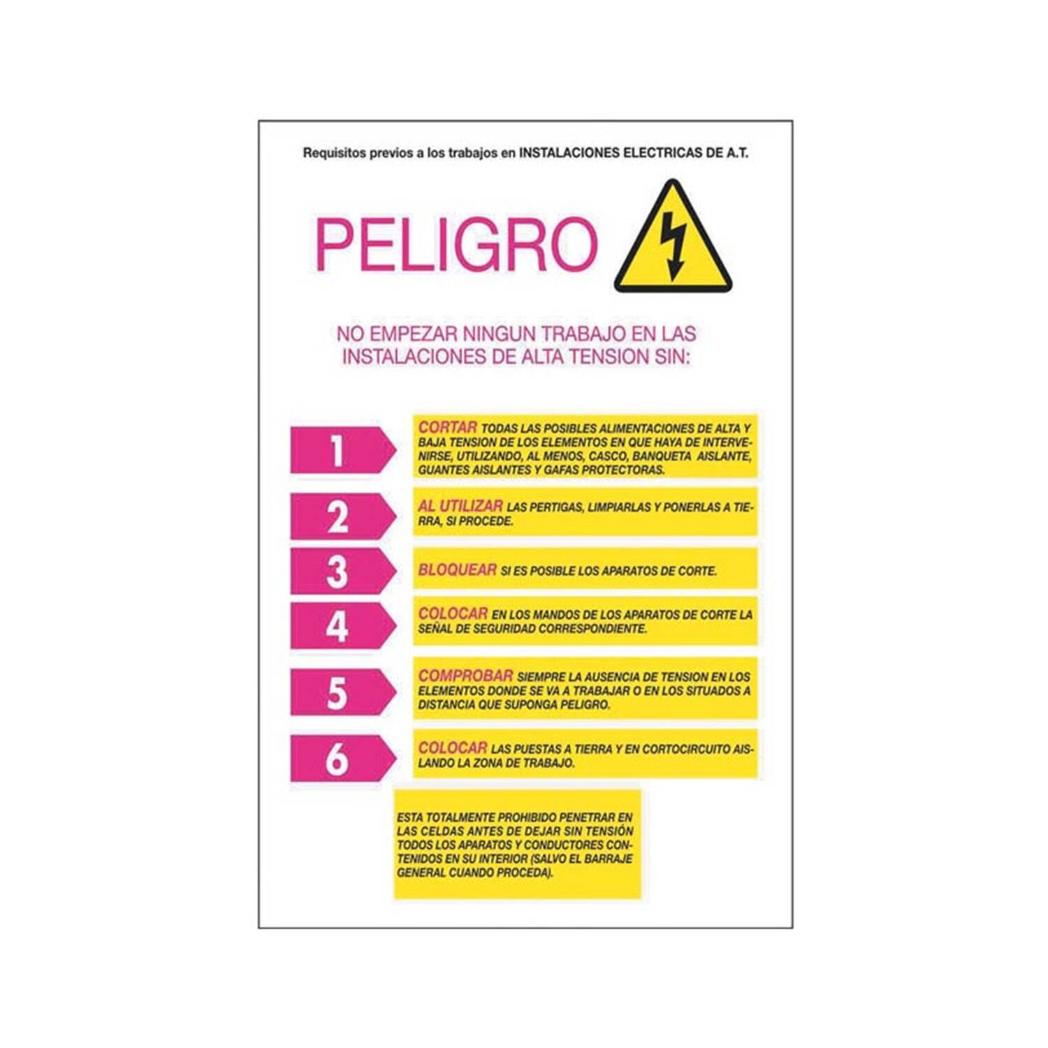 El Pack de 6 Unidades de Carteles PVC Requisitos Previos CATU AP223R es un conjunto esencial para garantizar la seguridad en instalaciones eléctricas de alta tensión. Fabricados en resistente PVC de color amarillo, estos carteles advierten claramente sobre los pasos imprescindibles antes de iniciar cualquier trabajo, ayudando a prevenir accidentes. Su diseño incluye indicaciones claras y visuales sobre el uso de equipos de protección y la verificación de ausencia de tensión. Además, cuentan con certificaciones CE, RoHS y UKCA, que garantizan su calidad y cumplimiento normativo. Perfectos para entornos industriales, estos carteles ofrecen una solución duradera y visible para mantener la seguridad en el lugar de trabajo durante al menos 3 años.