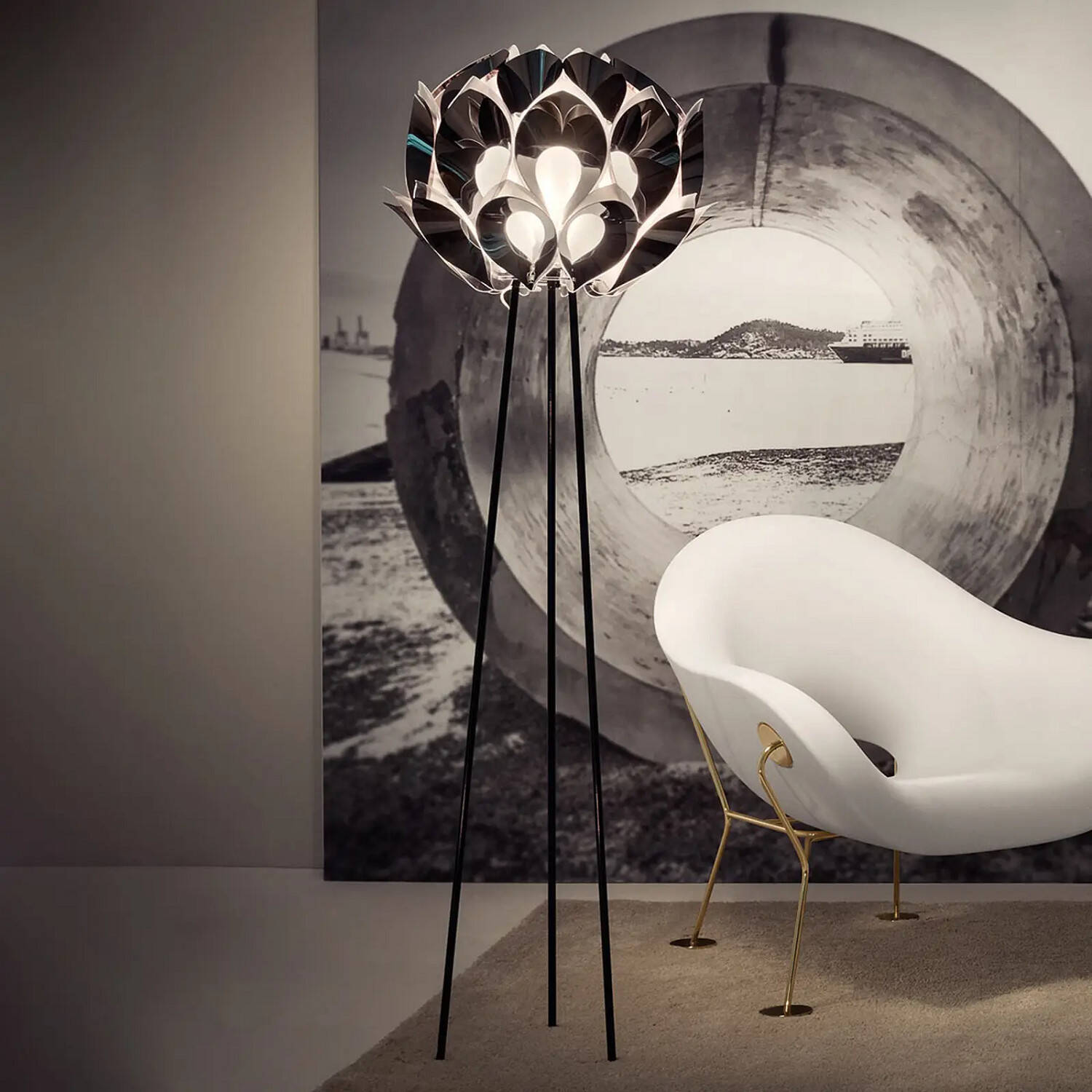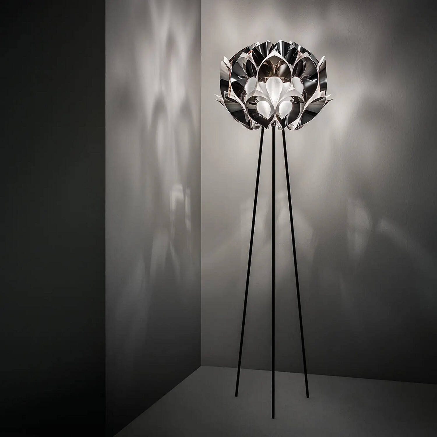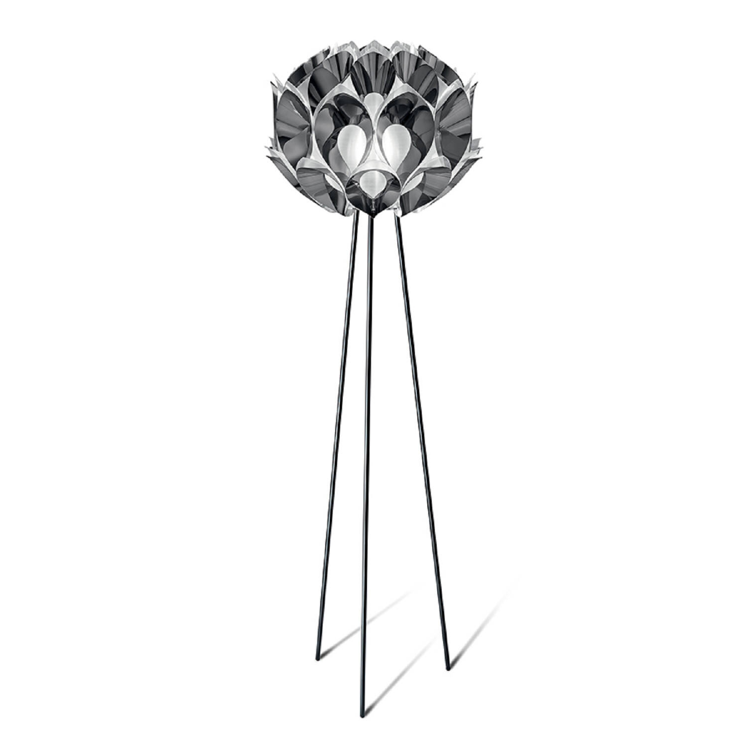 La lámpara de pie SLAMP Flora Floor, diseñada por la reconocida Zaha Hadid, es una pieza escultórica que emula la delicadeza y el movimiento natural de una flor exótica en plena expansión. Sus pétalos metálicos en color pewter envuelven una esfera central que alberga hasta tres puntos de luz con casquillo E27 (bombillas no incluidas). Ideal para interiores, esta lámpara combina arte y funcionalidad, aportando un toque de lujo y sofisticación a cualquier espacio. Funciona con una potencia máxima de 40W y está certificada con CE, RoHS y UKCA, garantizando calidad y seguridad. Su estructura de tres finas patas aporta estabilidad y ligereza visual, convirtiéndola en un elemento decorativo único y contemporáneo.