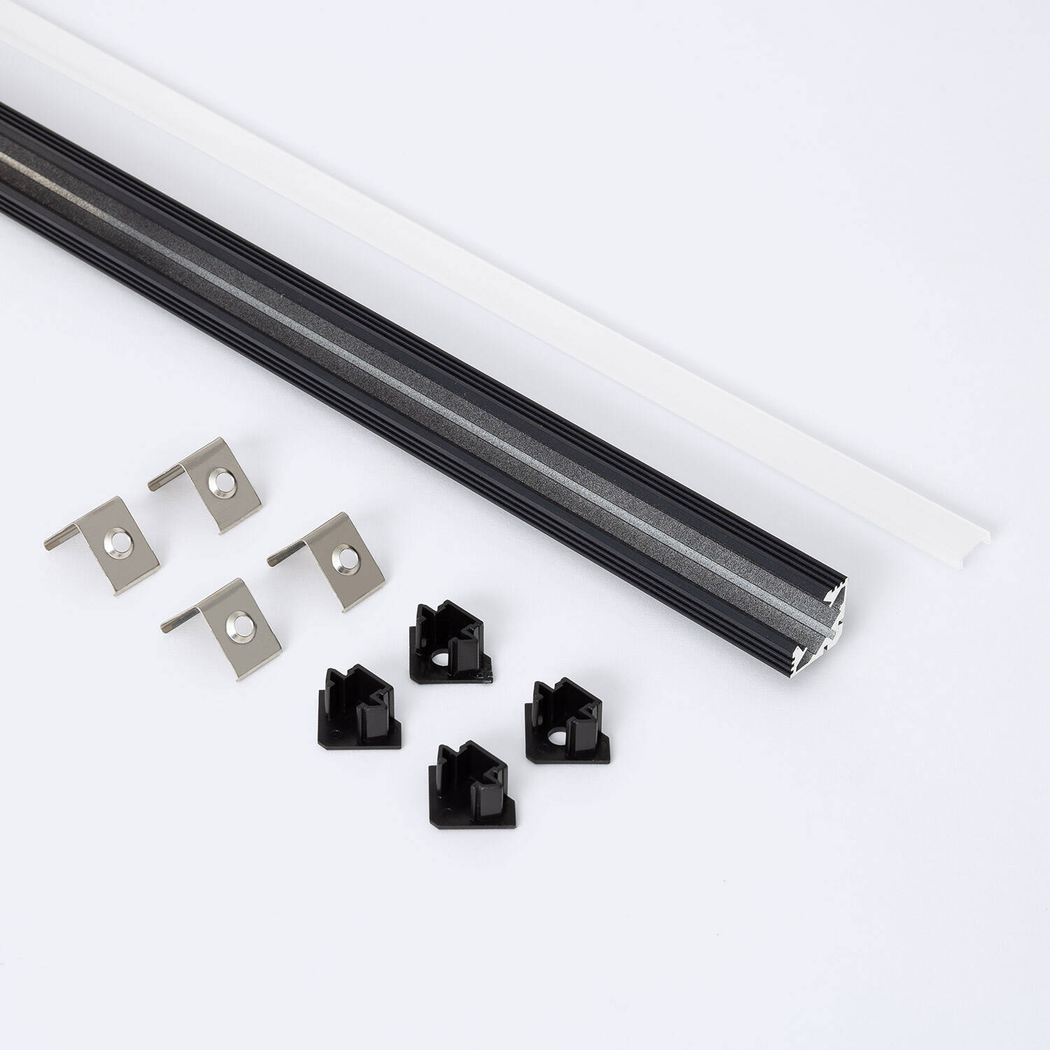 El Perfil de Aluminio Esquina de 2 metros para Tira LED hasta 11 mm es la solución perfecta para instalaciones de iluminación en ángulos interiores. Fabricado en aluminio negro de alta calidad, garantiza durabilidad y una estética moderna. Su diseño permite la colocación de tiras LED de hasta 11 mm de ancho, optimizando la dispersión de luz con una tapa semi-transparente que protege y difumina la iluminación para evitar deslumbramientos. Ideal para montaje en superficie, este perfil pertenece a la serie Vertex H10 y cuenta con certificación RoHS, asegurando un producto respetuoso con el medio ambiente. Además, incluye tapa superior y ofrece una garantía de 3 años, combinando funcionalidad y resistencia para ambientes interiores.