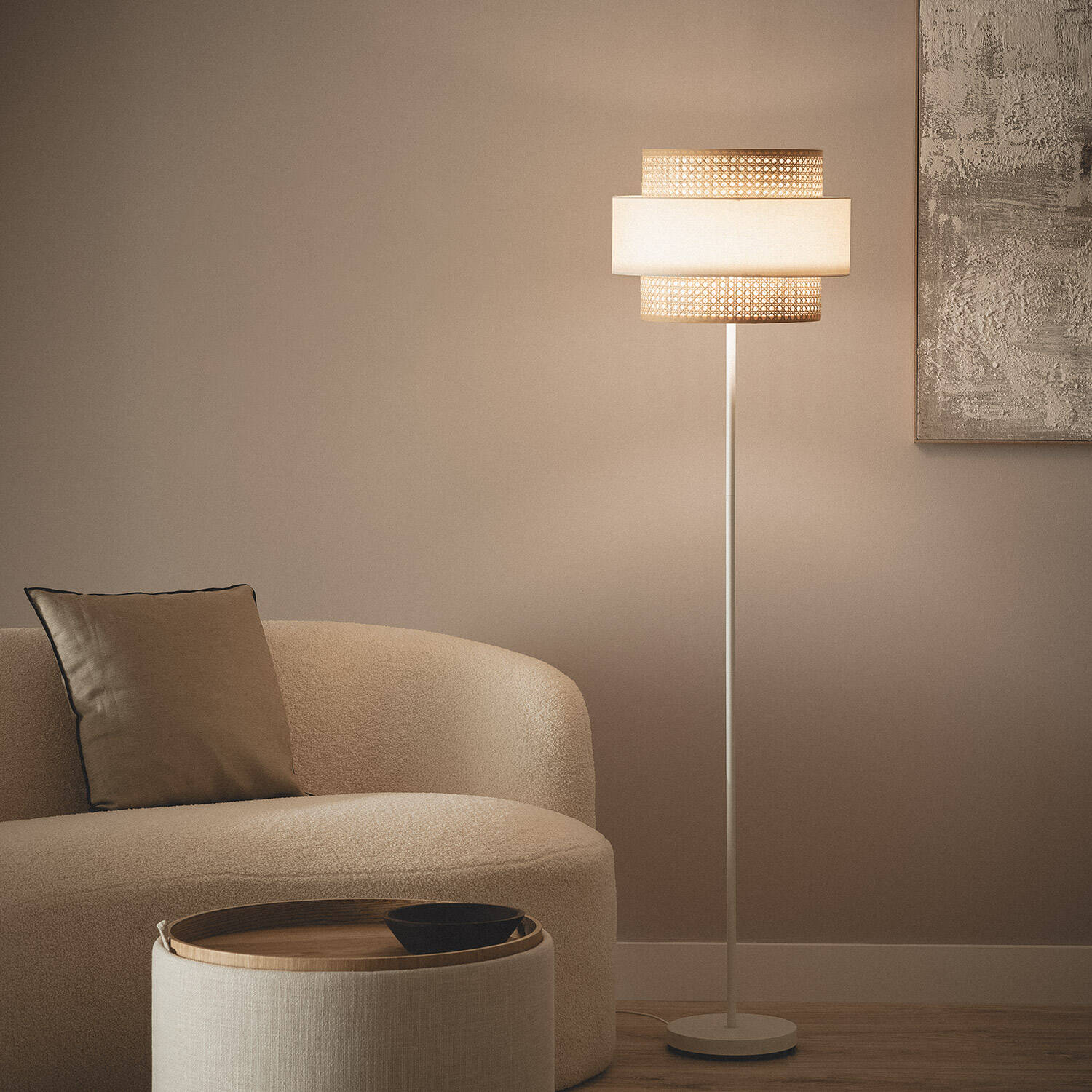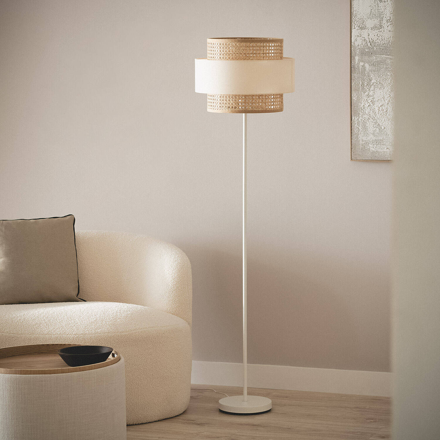 La lámpara de pie Amaia combina elegancia y calidez con un diseño cuidado en ratán beige que aporta un toque natural y sofisticado a cualquier estancia interior. Su estructura metálica blanca ofrece estabilidad y resistencia, mientras que la pantalla de tela y ratán filtra la luz suavemente, creando un ambiente acogedor. Compatible con bombillas E27 de hasta 40 W, permite personalizar la iluminación según tus necesidades. Cuenta con interruptor de pie y enchufe europeo, facilitando su uso diario. Certificada con CE, RoHS y UKCA, garantiza seguridad y calidad. Ideal para salones o dormitorios, esta lámpara es un complemento funcional y decorativo que aporta estilo y confort a tu hogar, con una garantía de 3 años.