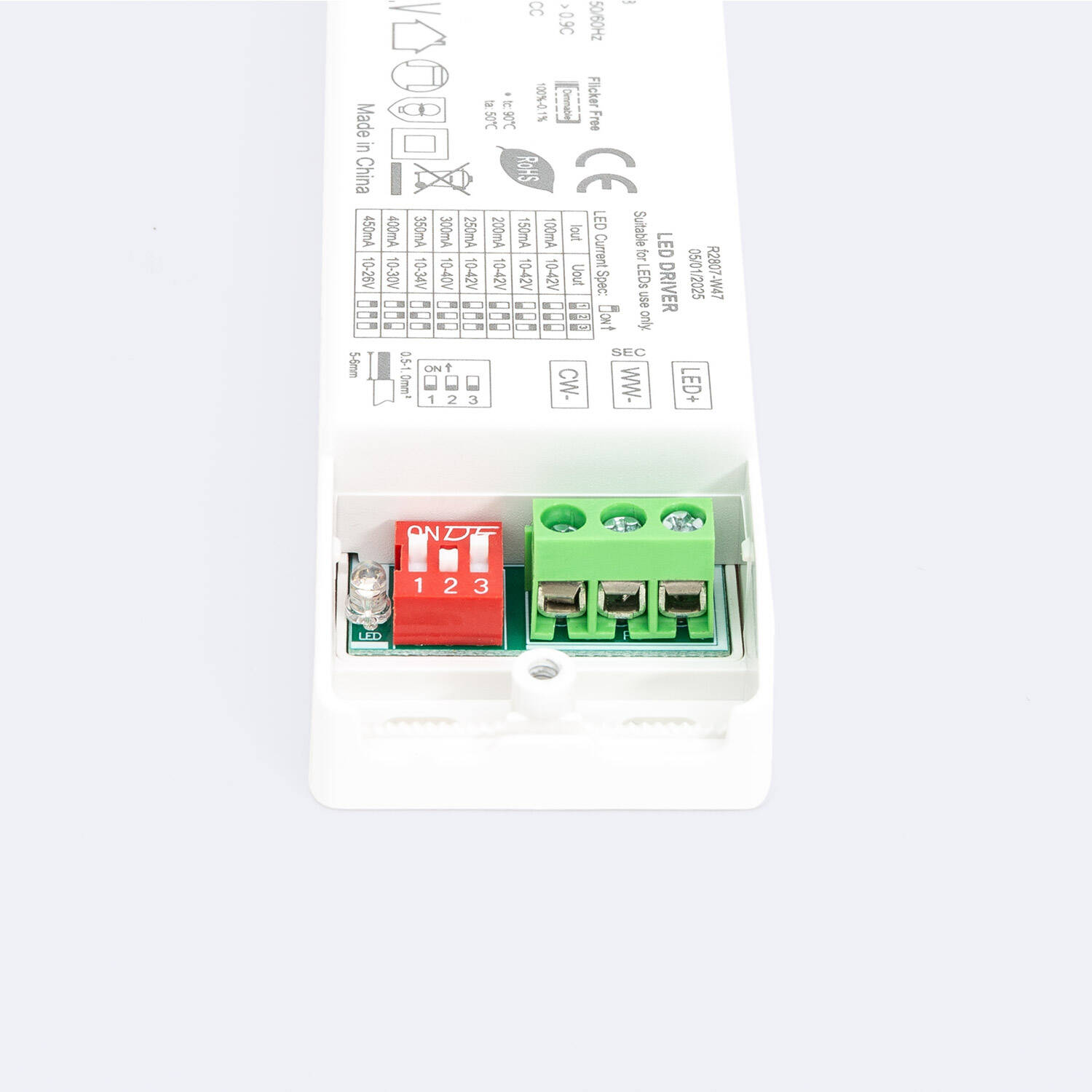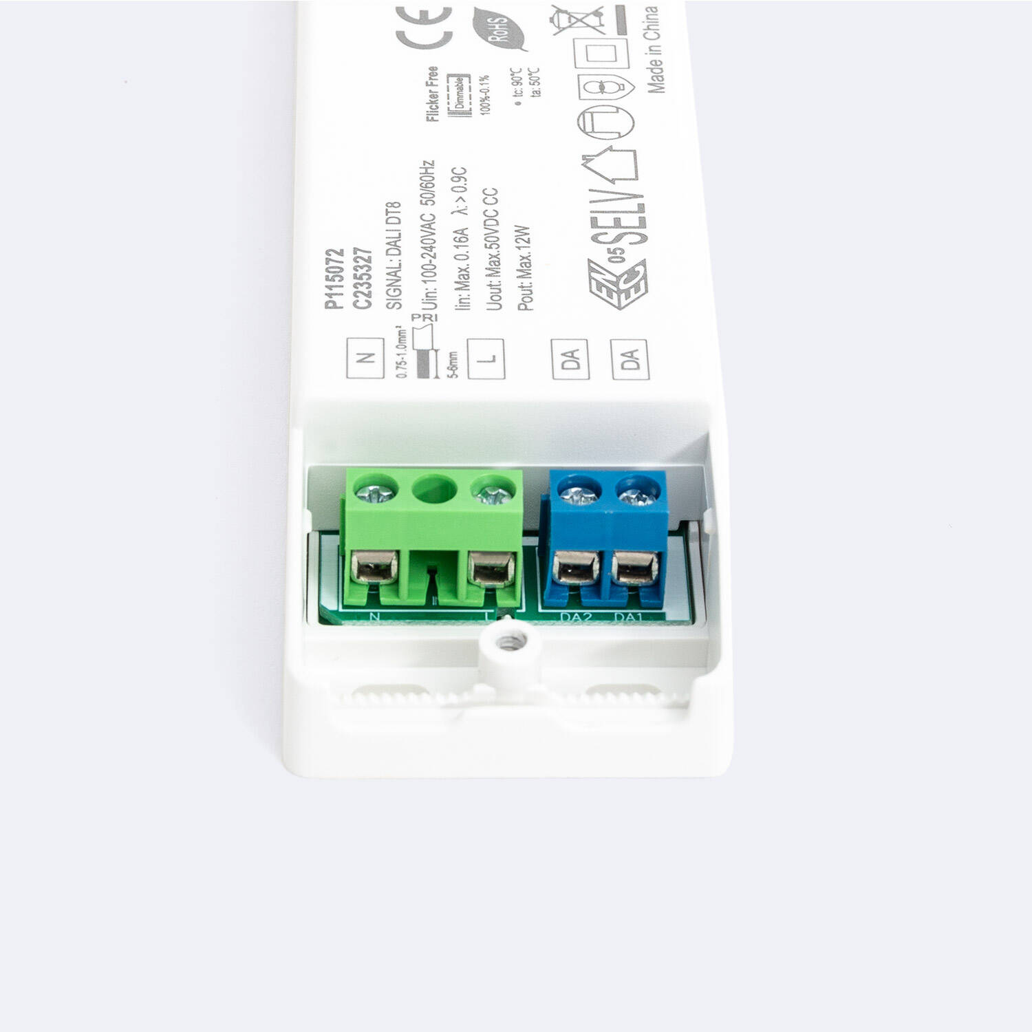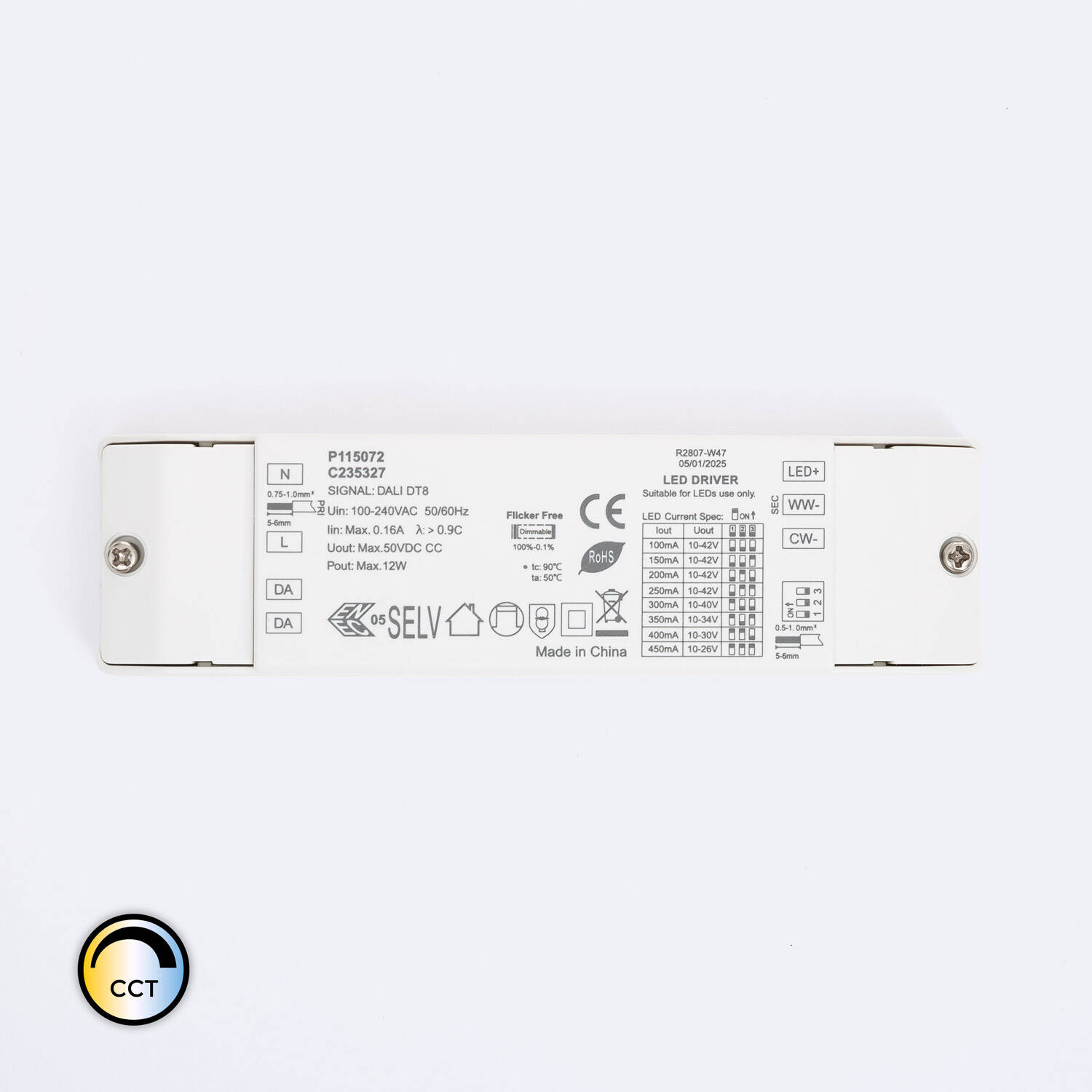 Driver regulable DALI CCT con potencia máxima de 12 W y corriente de salida ajustable entre 100 y 450 mA. Ideal para uso en interiores, este controlador empotrable permite una regulación precisa mediante protocolo DALI, adaptándose a diferentes necesidades de iluminación LED. Funciona en un rango de voltaje de 10-42 V DC y soporta temperaturas de trabajo desde -20 °C hasta 50 °C, con una temperatura ambiente de hasta 80 °C. Cuenta con certificaciones CE, DALI 2, EMC y RoHS, garantizando calidad y seguridad. Su diseño compacto en color blanco y protección IP20 facilita su integración en instalaciones modernas, ofreciendo eficiencia y durabilidad con una garantía estándar de 5 años.
