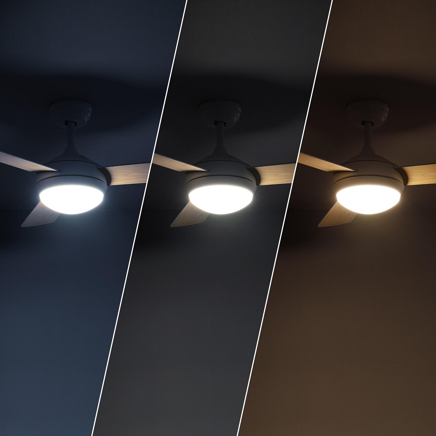 El ventilador de techo Navy 107 cm de TECHBREY combina diseño moderno y funcionalidad para espacios medianos y grandes, tanto interiores como exteriores. Su motor DC ultrasilencioso de 40 W ofrece un funcionamiento eficiente y silencioso, con niveles de ruido entre 20 y 40 dB. Cuenta con tres aspas de madera clara y acabado blanco, aportando estilo y calidez a cualquier estancia. Incluye luz LED regulable, función verano/invierno para optimizar el confort todo el año y mando a distancia para un control cómodo. Su protección IP44 garantiza resistencia en exteriores, soportando temperaturas de -20 °C a 50 °C. Además, dispone de seis velocidades ajustables y una garantía de 3 años, asegurando calidad y durabilidad.
