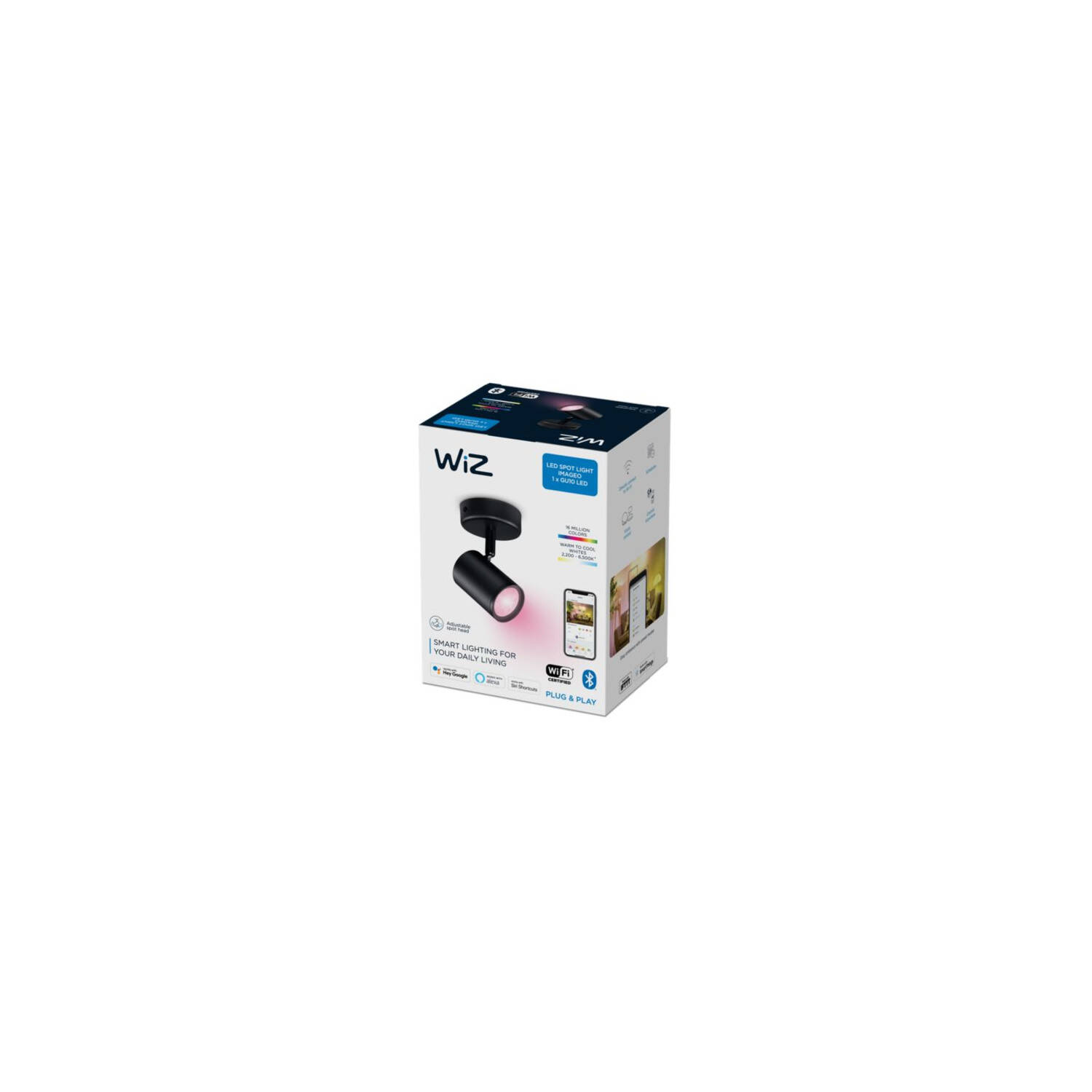 La lámpara de pared LED regulable WiZ Imageo combina tecnología avanzada y diseño moderno en un foco compacto de aluminio negro. Con una potencia de 4,9 W y una luminosidad de 345 lúmenes, ofrece una iluminación RGB personalizable que se adapta a cualquier ambiente. Su conectividad WiFi y Bluetooth permite controlarla fácilmente mediante app, voz o interruptor, sin necesidad de hubs adicionales. Compatible con Matter y detección de movimiento, garantiza versatilidad y eficiencia. Su haz de luz orientable aporta funcionalidad, mientras que su vida útil de 15.000 horas y certificaciones CE, RoHS y UKCA aseguran calidad y durabilidad. Ideal para interiores, funciona en rangos de temperatura de -20 °C a 50 °C, ofreciendo una iluminación inteligente y adaptable.