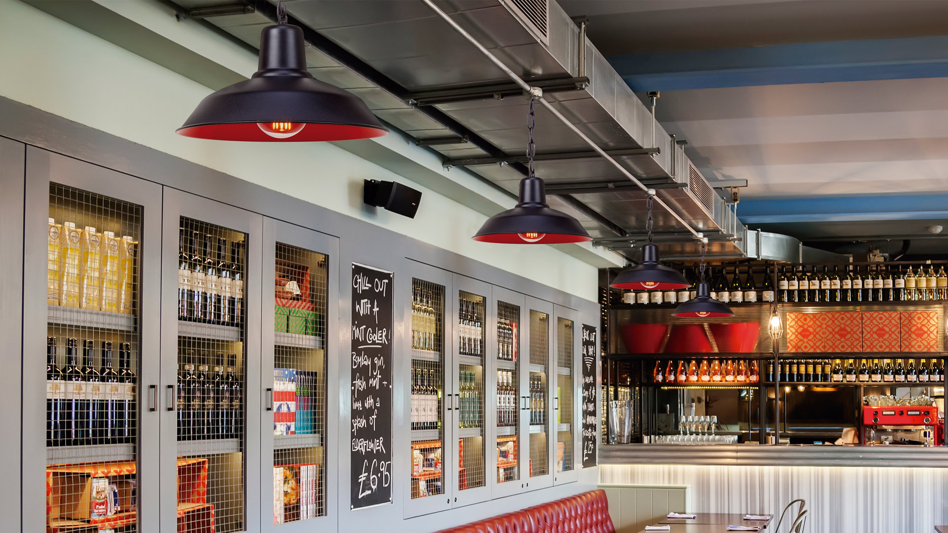 La lámpara de suspensión Soho, con su pantalla metálica inspirada en el diseño industrial se presenta en dos medidas y resulta ideal en proyectos de restauración y cocinas.