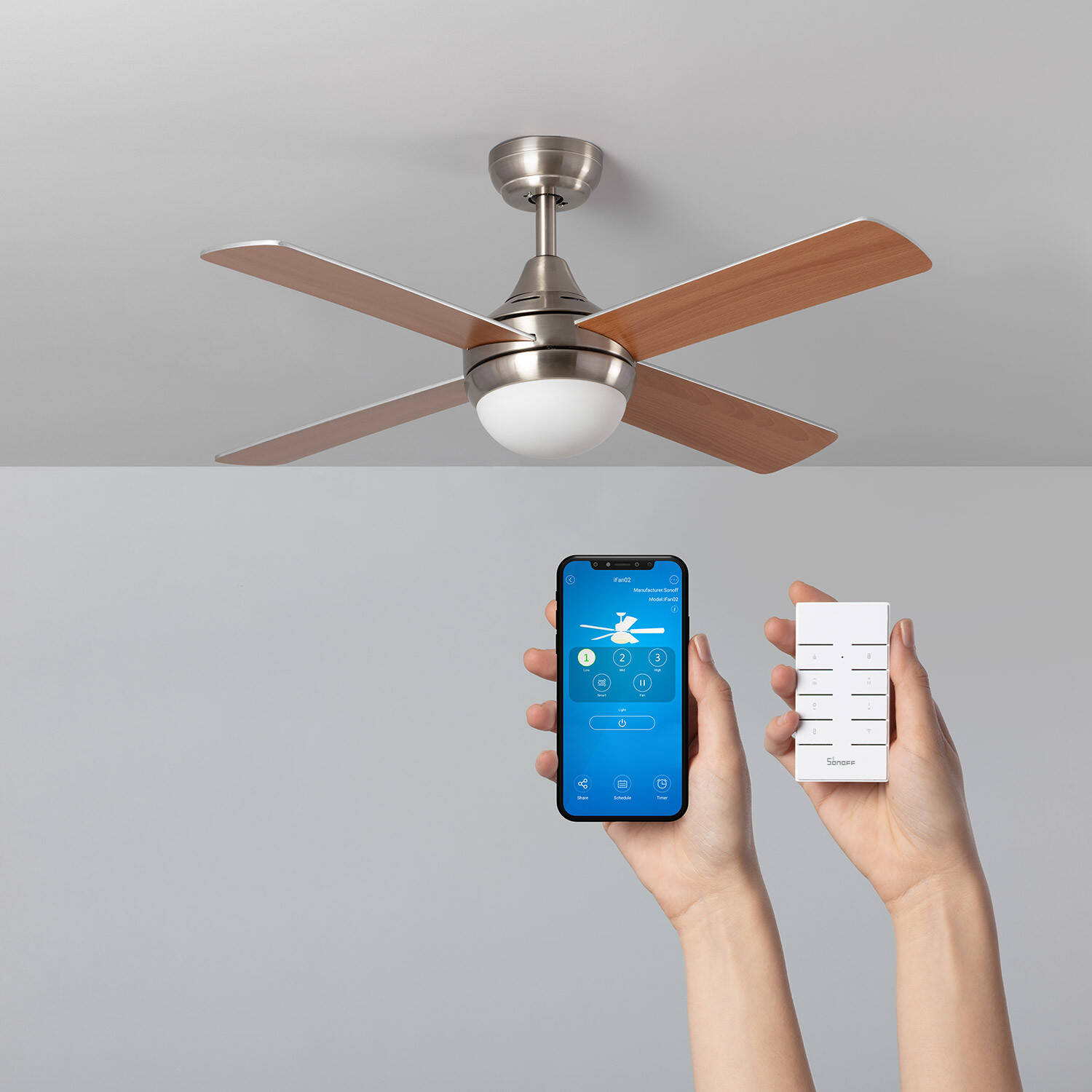 El ventilador de techo Navy Níquel de 110 cm combina diseño moderno y funcionalidad avanzada. Fabricado en acero y madera, ofrece un acabado elegante en níquel ideal para estancias medianas (10-20 m²). Su motor AC de 40 W garantiza un rendimiento eficiente y silencioso, con niveles de sonido desde 24 hasta 45 dB. Incluye luz con casquillo E27 (bombilla no incluida) y función verano/invierno para uso durante todo el año. Su conectividad WiFi y mando a distancia permiten un control cómodo desde el móvil o a distancia. Además, cuenta con temporizador (1/2/4/8 horas) y materiales de alta calidad con garantía de 3 años. Perfecto para mejorar el confort y la estética de tu hogar.