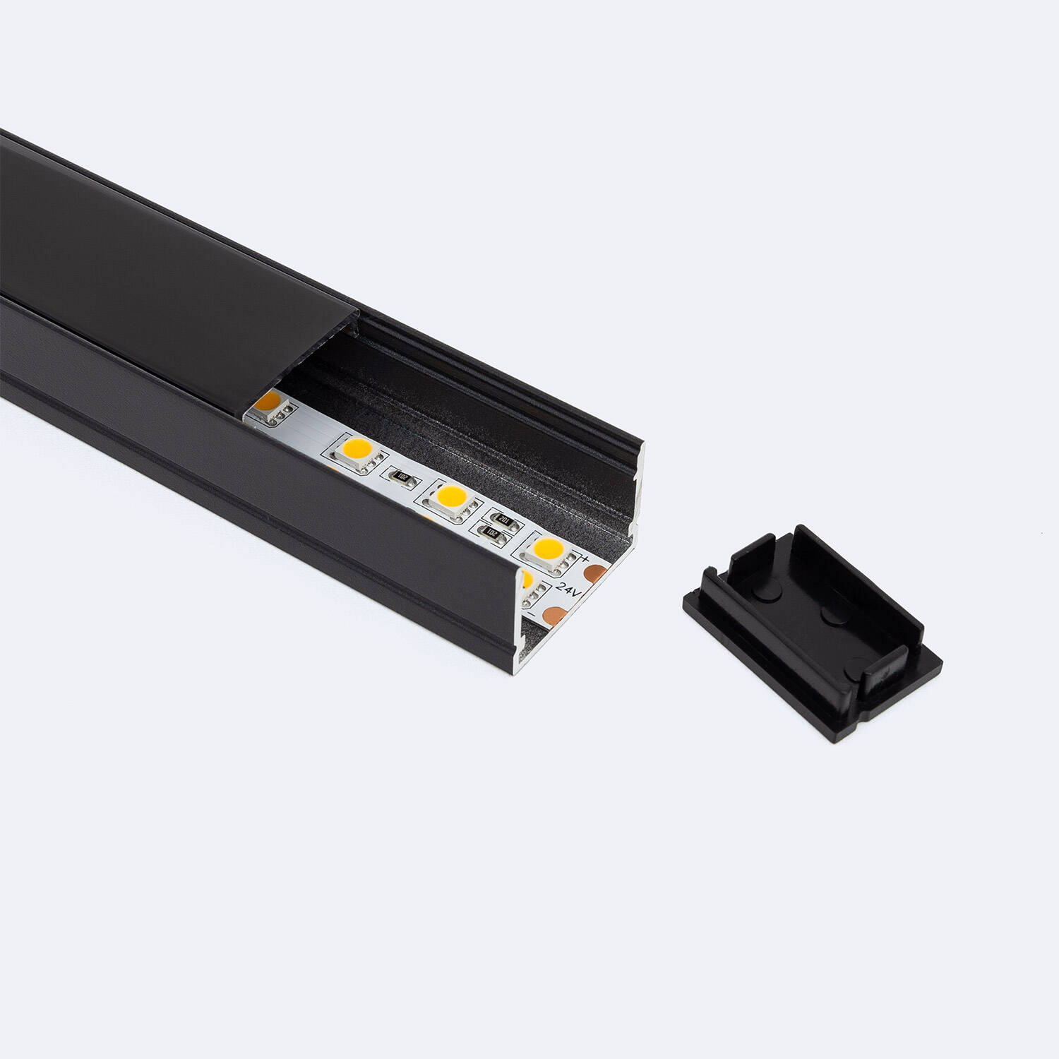 El Perfil de Aluminio Superficie para Tira LED hasta 22 mm con Tapa Continua, de la serie Terra H22, es la solución perfecta para instalaciones de iluminación interior. Fabricado en aluminio resistente y acabado en negro, ofrece una alta durabilidad y un diseño elegante. Su tapa continua en negro traslúcido garantiza una difusión uniforme de la luz, evitando deslumbramientos y protegiendo la tira LED. Compatible con tiras de hasta 22 mm de ancho, facilita una instalación sencilla en superficie, aportando un acabado profesional y moderno. Incluye tapa superior y cuenta con certificación RoHS, asegurando calidad y seguridad. Además, dispone de una garantía de 3 años, respaldando su fiabilidad y rendimiento a largo plazo.
