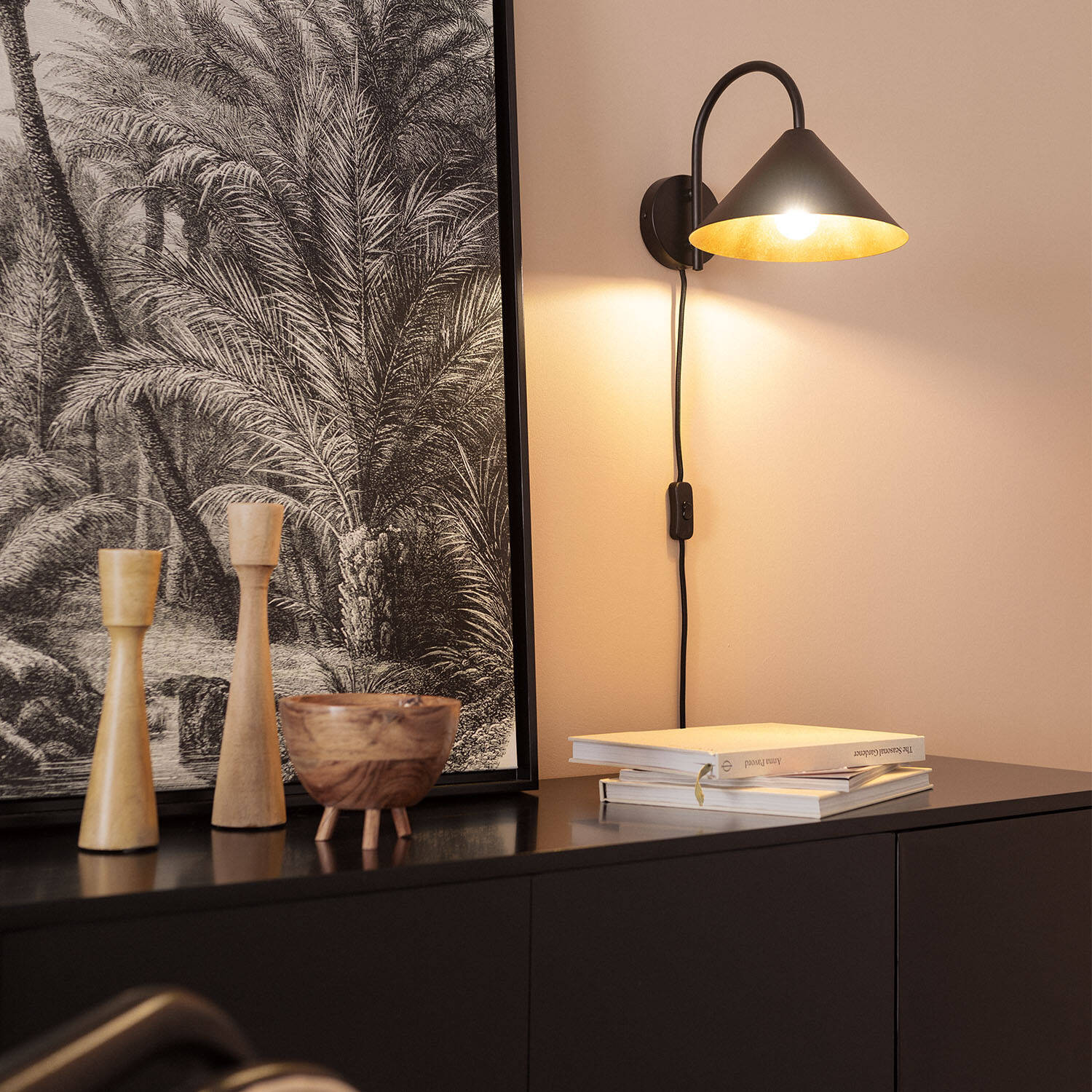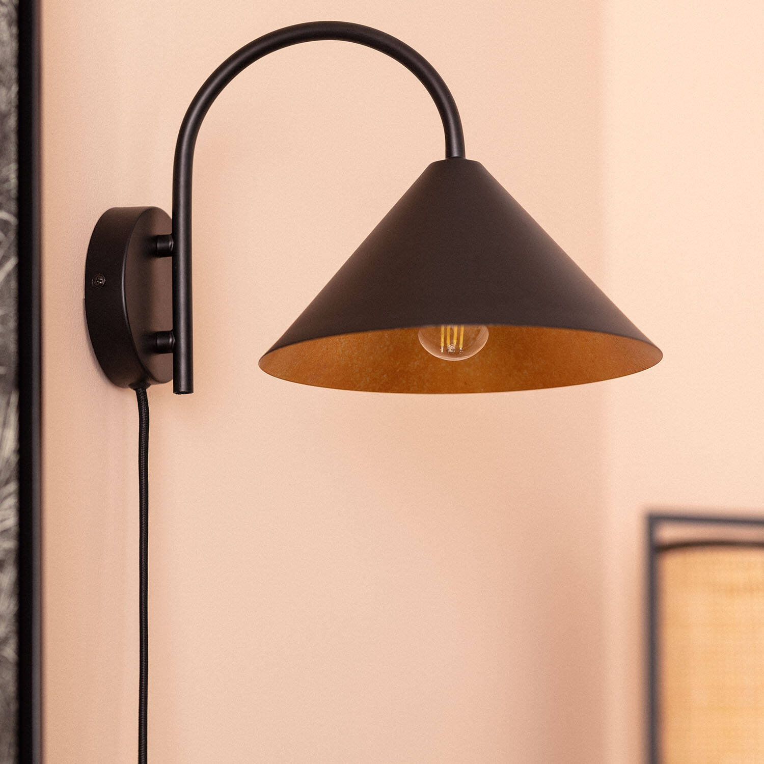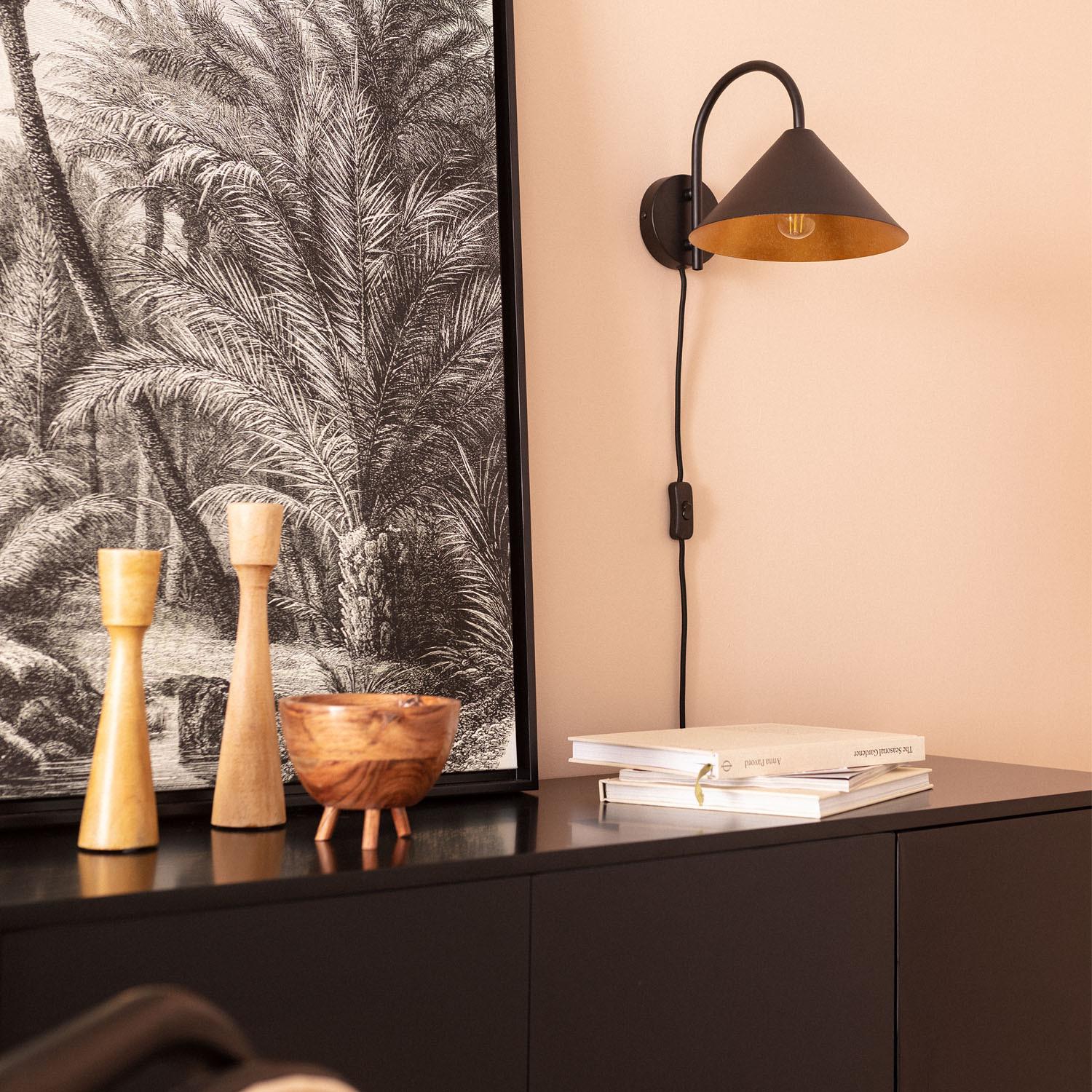 La lámpara de pared Metal Twiga combina un diseño moderno y funcionalidad para interiores. Fabricada en metal negro con acabado mate, presenta una pantalla cónica que aporta un toque elegante y minimalista a cualquier espacio. Su interior dorado refleja la luz cálida de la bombilla E27 (no incluida), creando un ambiente acogedor y sofisticado. Ideal para salones, dormitorios o zonas de lectura, esta lámpara cuenta con un interruptor integrado para un uso cómodo y sencillo. Resistente a temperaturas de entre -20 °C y 50 °C, y con protección IP20 e IK02, garantiza durabilidad y seguridad. Además, dispone de certificaciones CE, RoHS y UKCA, y ofrece 3 años de garantía para mayor confianza.